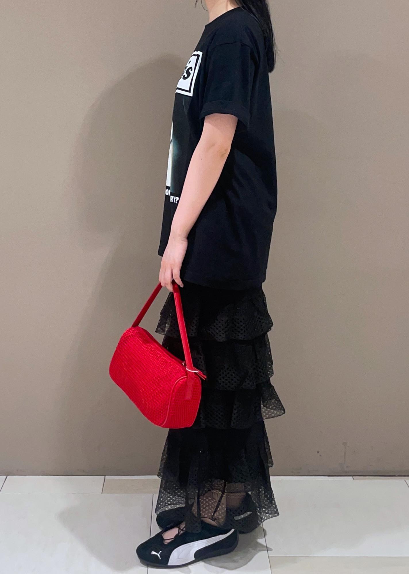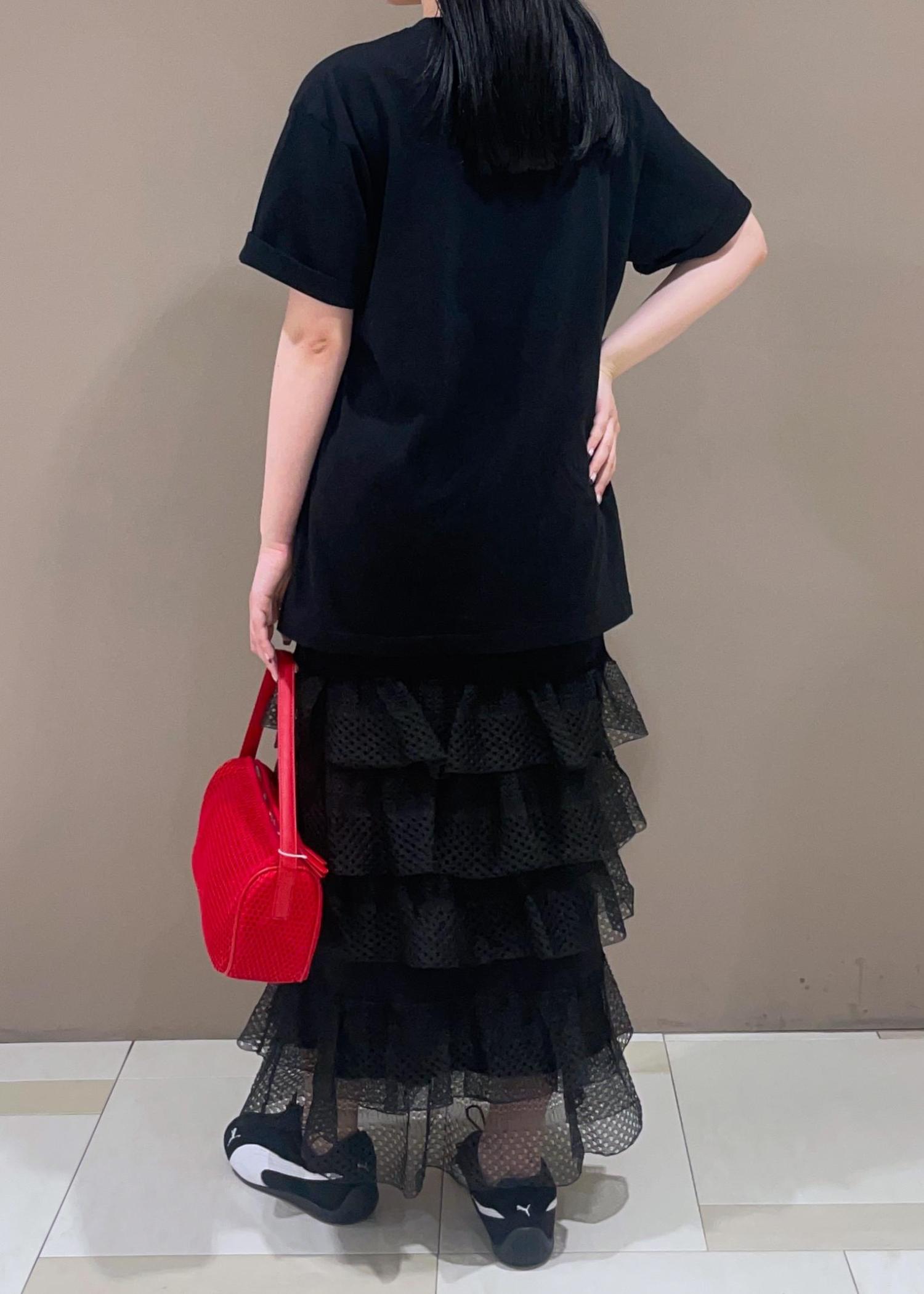 ADAM ET ROPÉ FEMMEシアーフリルスカートブラック / F¥19,800レビューウエストのゴムが柔らかく、履き心地が良いです◎足首が透けて見える丈感なのでレイヤードスタイルにしても◎