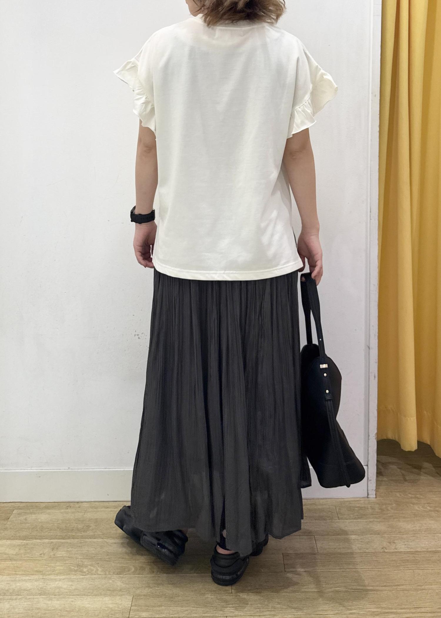 ロゴTシャツはシンプルでカジュアルになりがちですが、お袖のフリルデザインが可愛さをプラスしてくれるので1枚でオシャレに