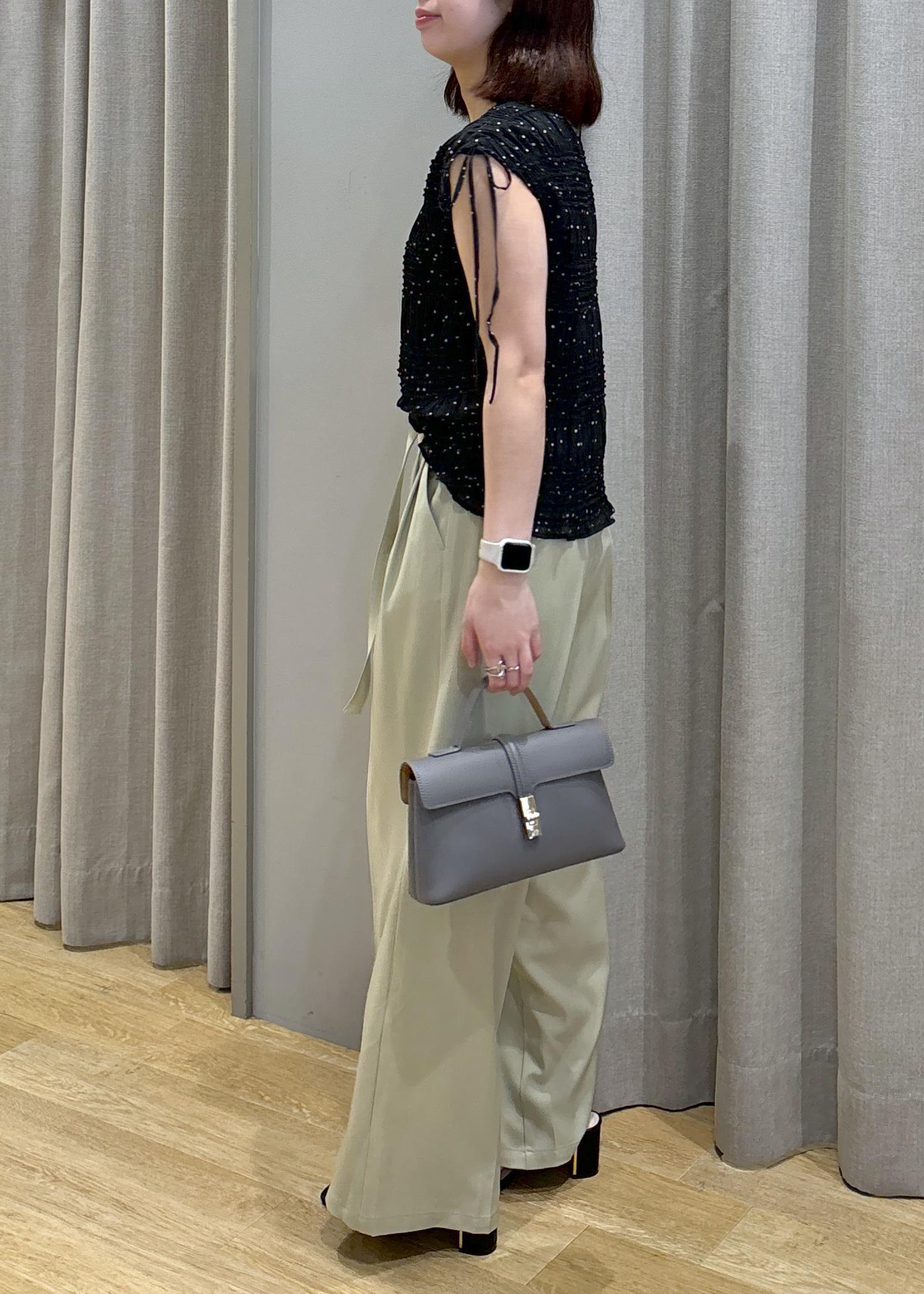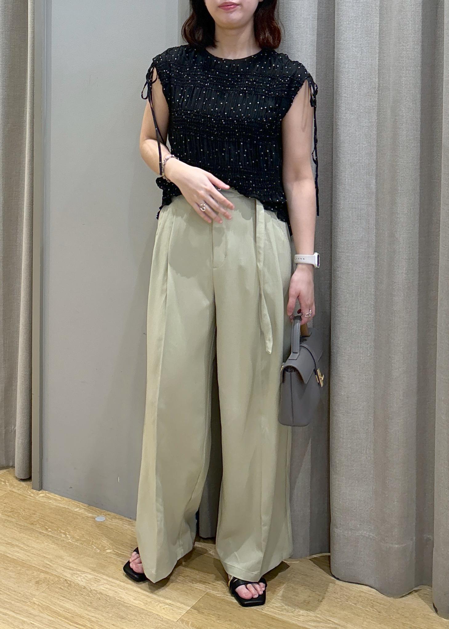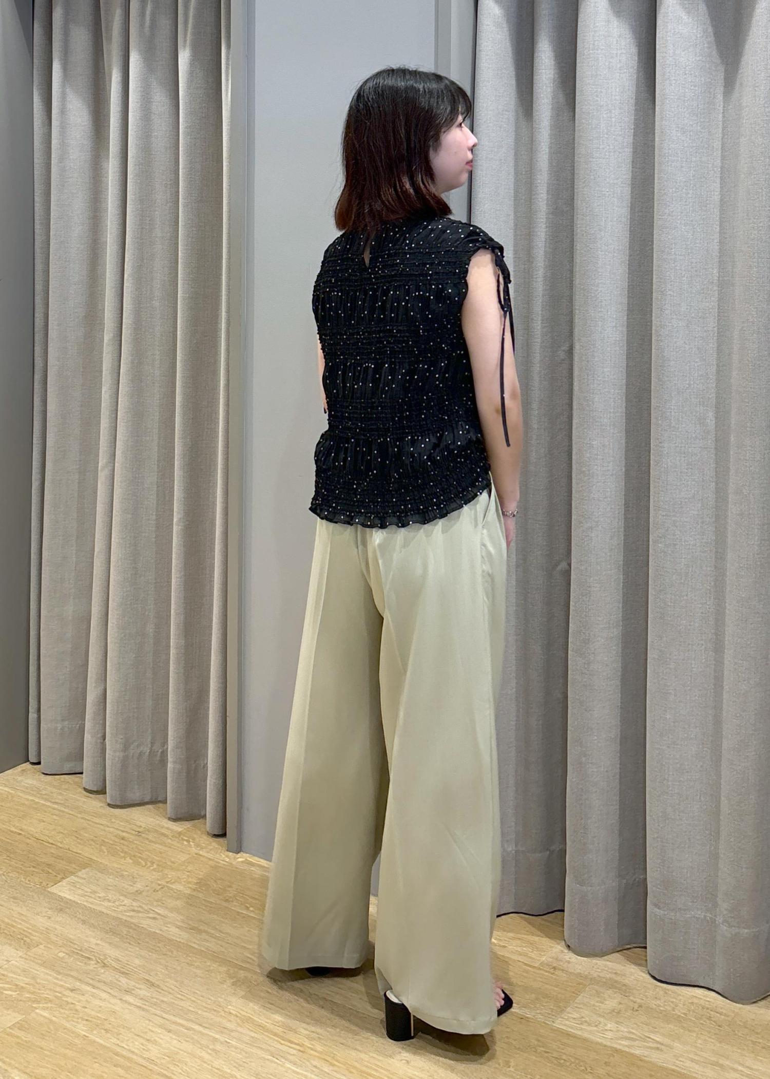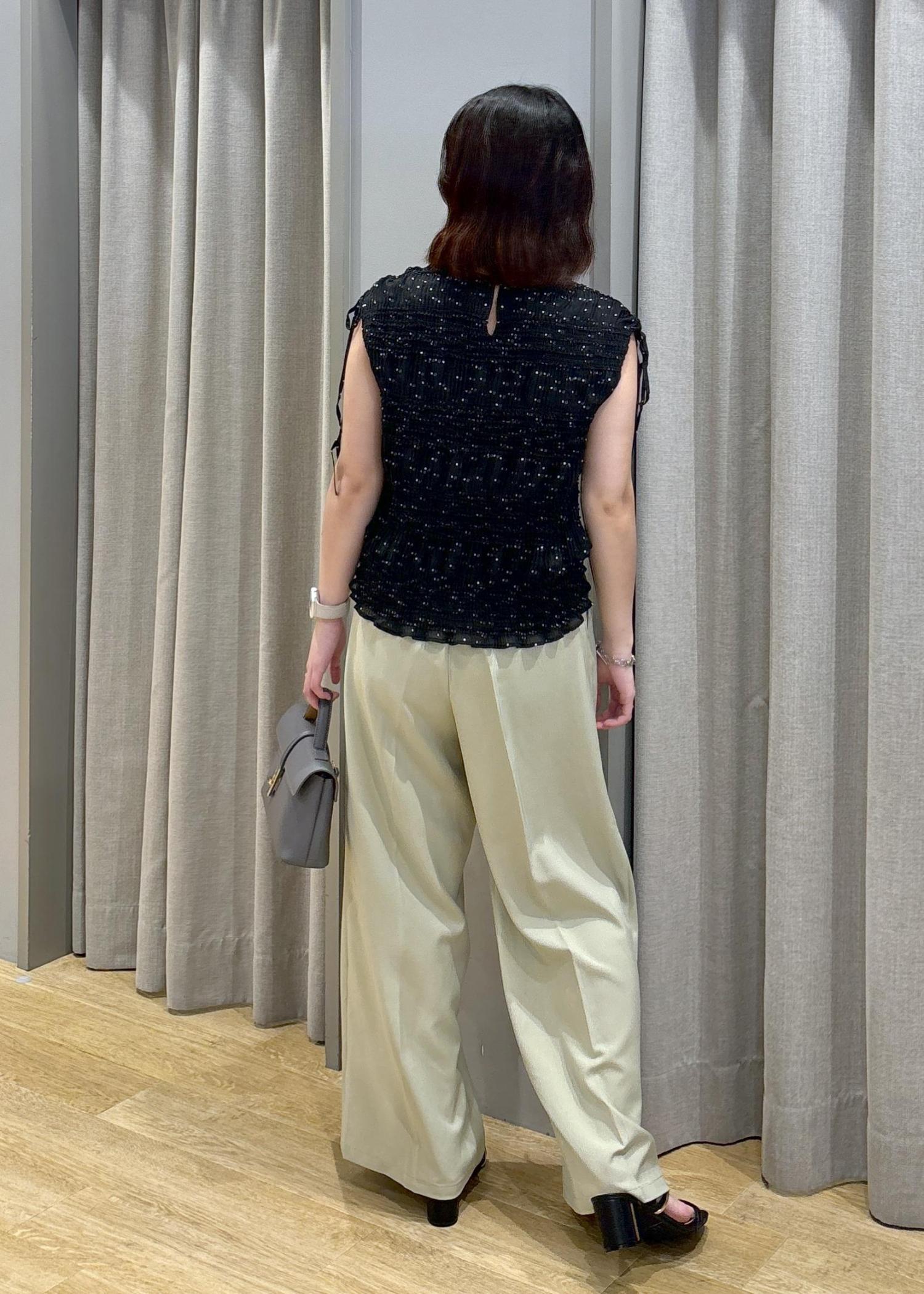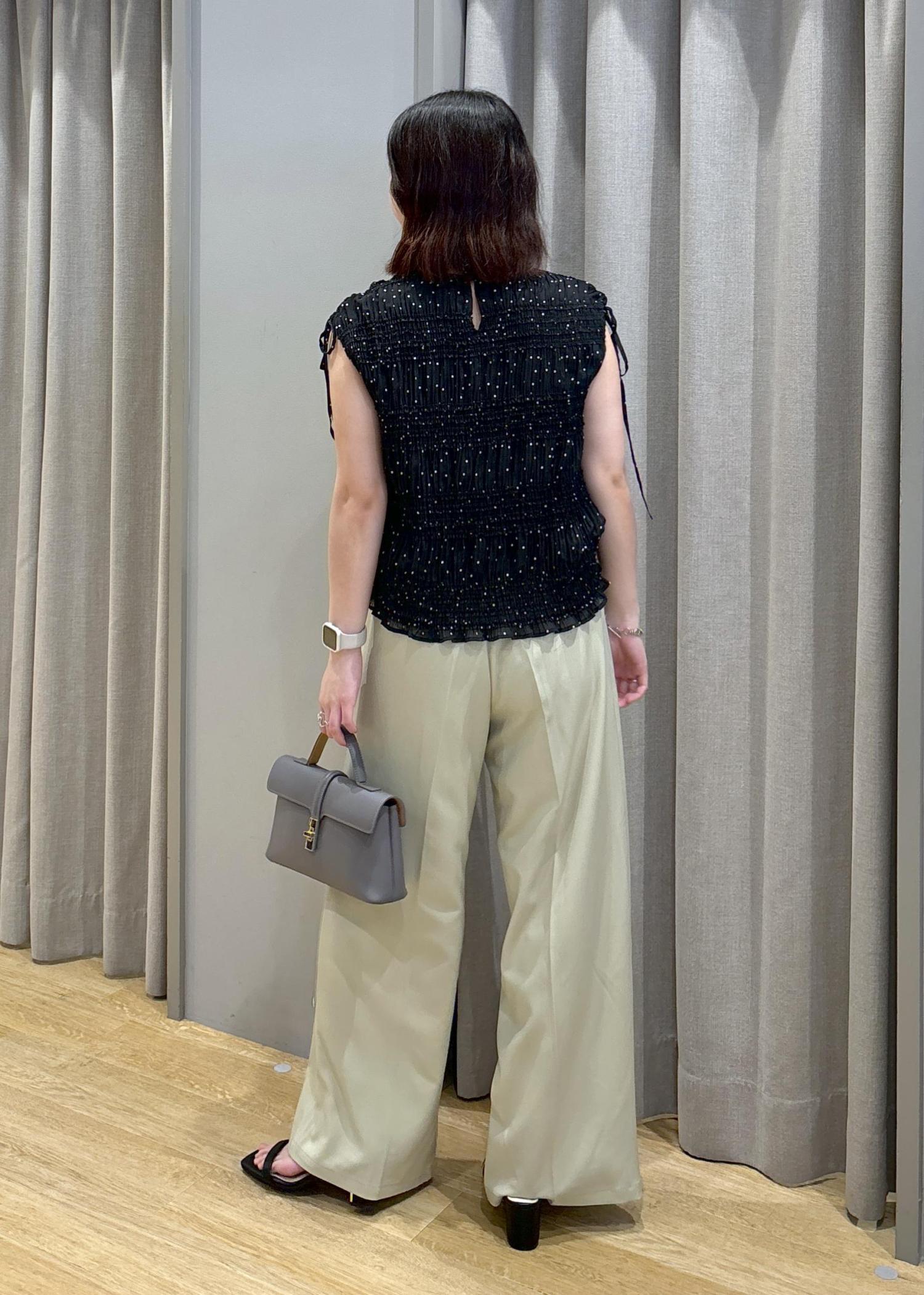 プリーツシャーリングブラウス×ワイドタックパンツ
