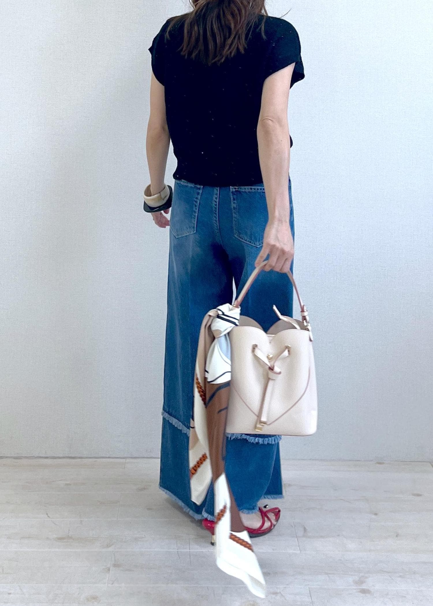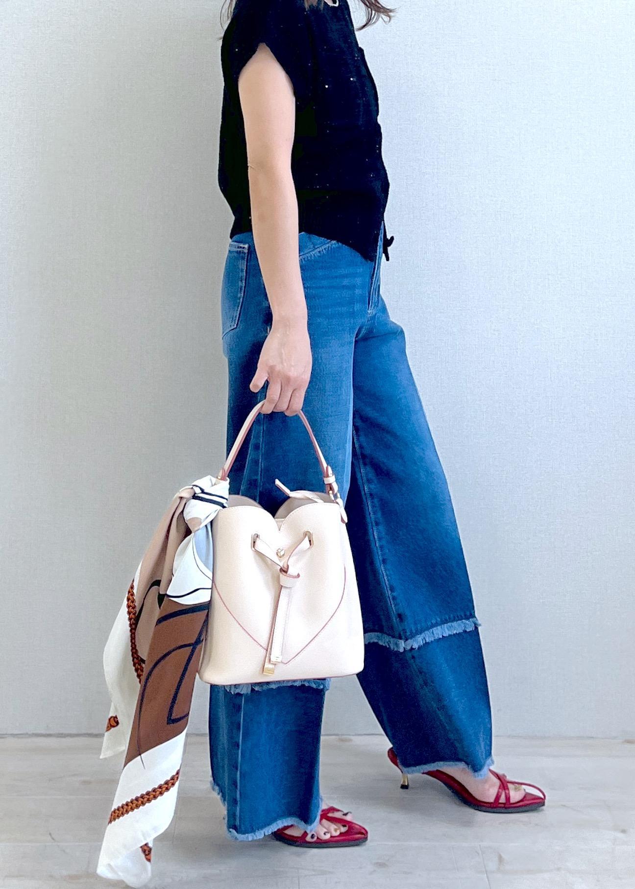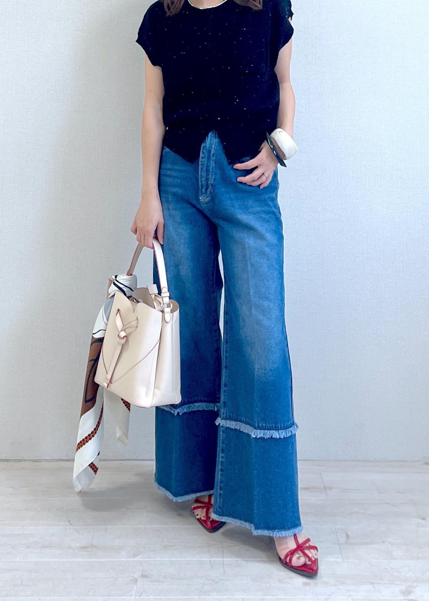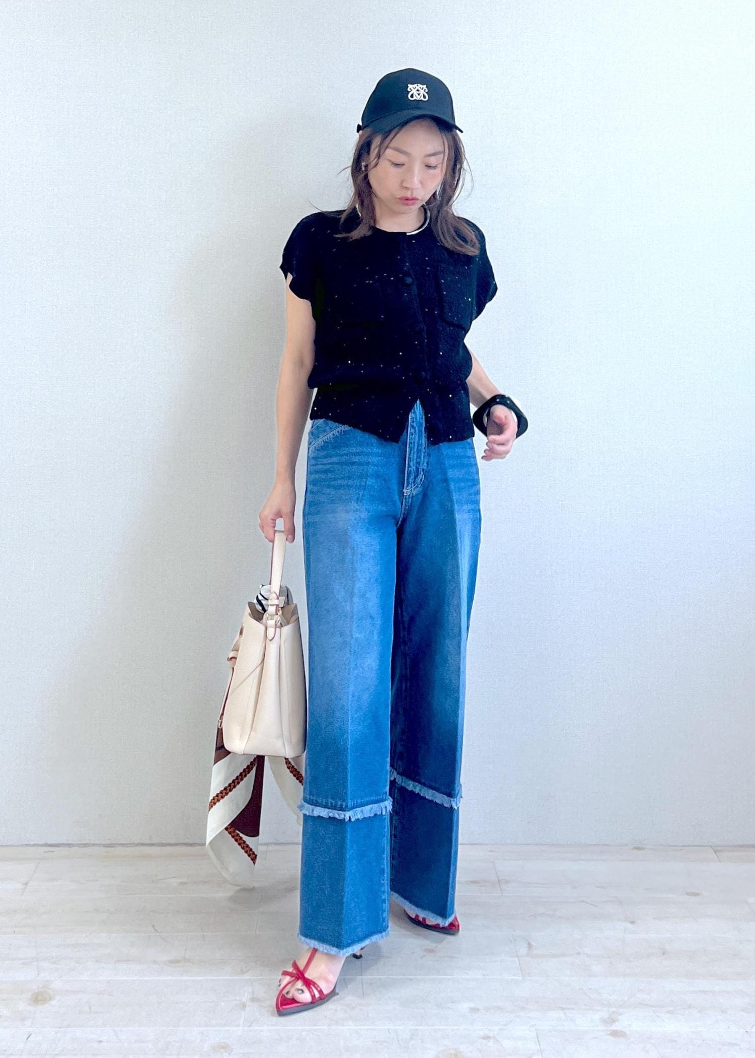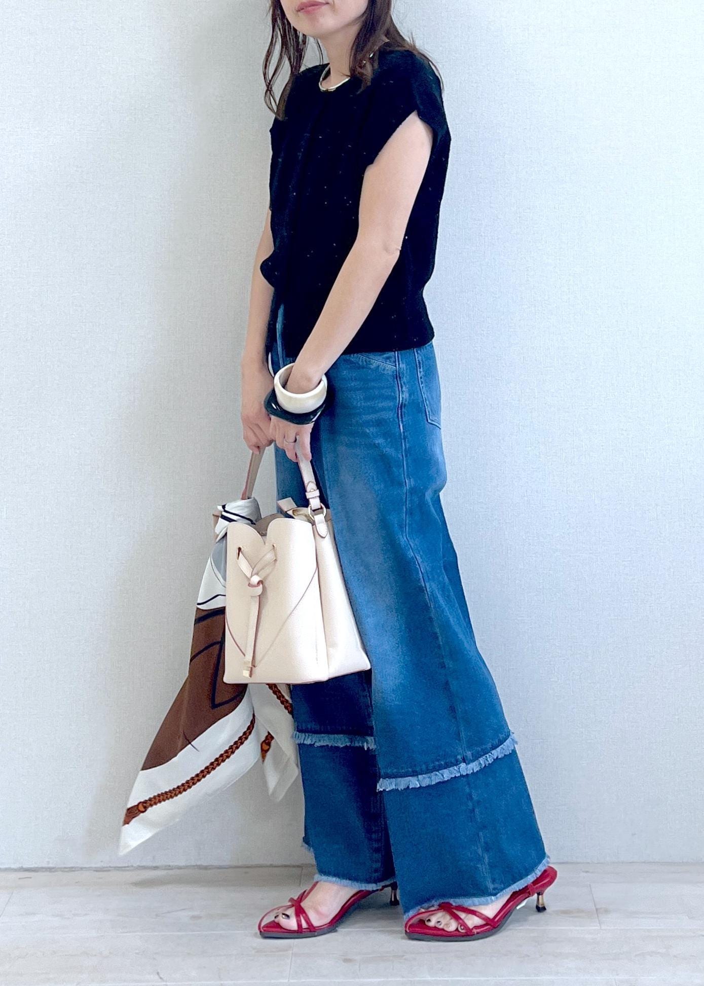 ワイドデニムの切りっぱなし感と、赤サンダルのアクセントで、「おっ」と思わせる夏のコーディネート。