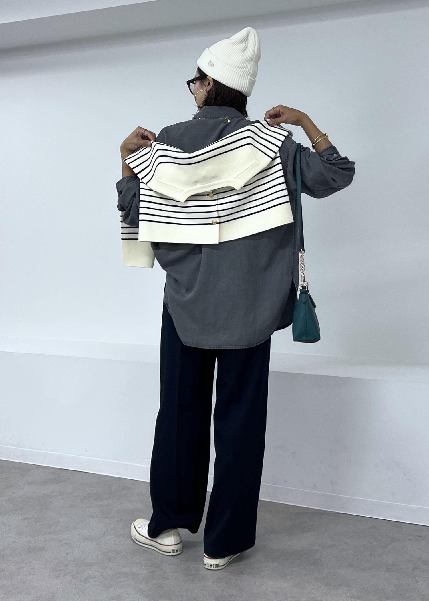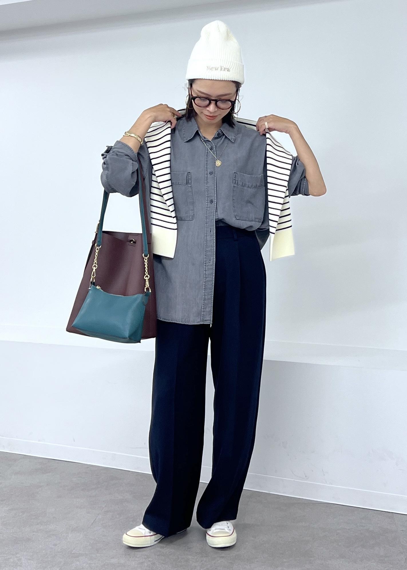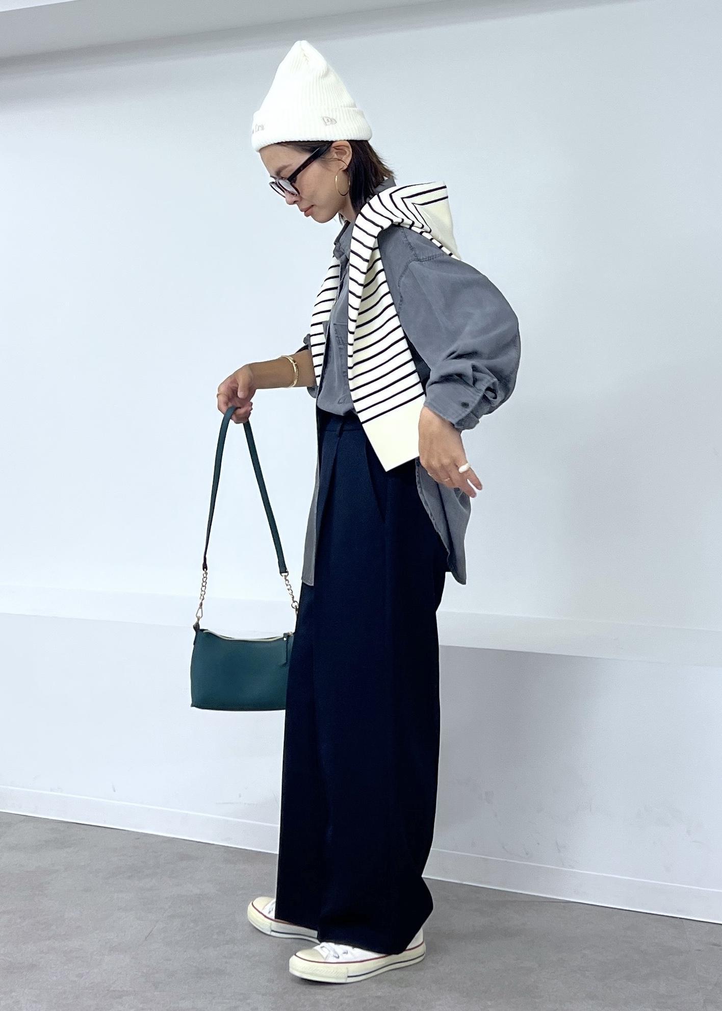 ネイビーのワイドパンツとニット帽を合わせて、メンズライクな着こなしにしました。