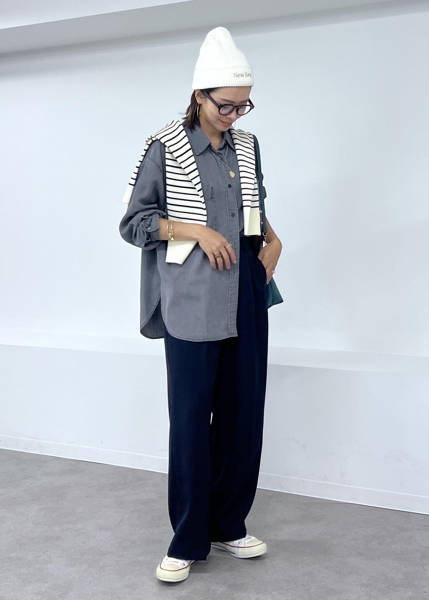 ゆったりしたグレーシャツは軽く着やすい素材で、秋のカジュアルコーデにもおすすめ。