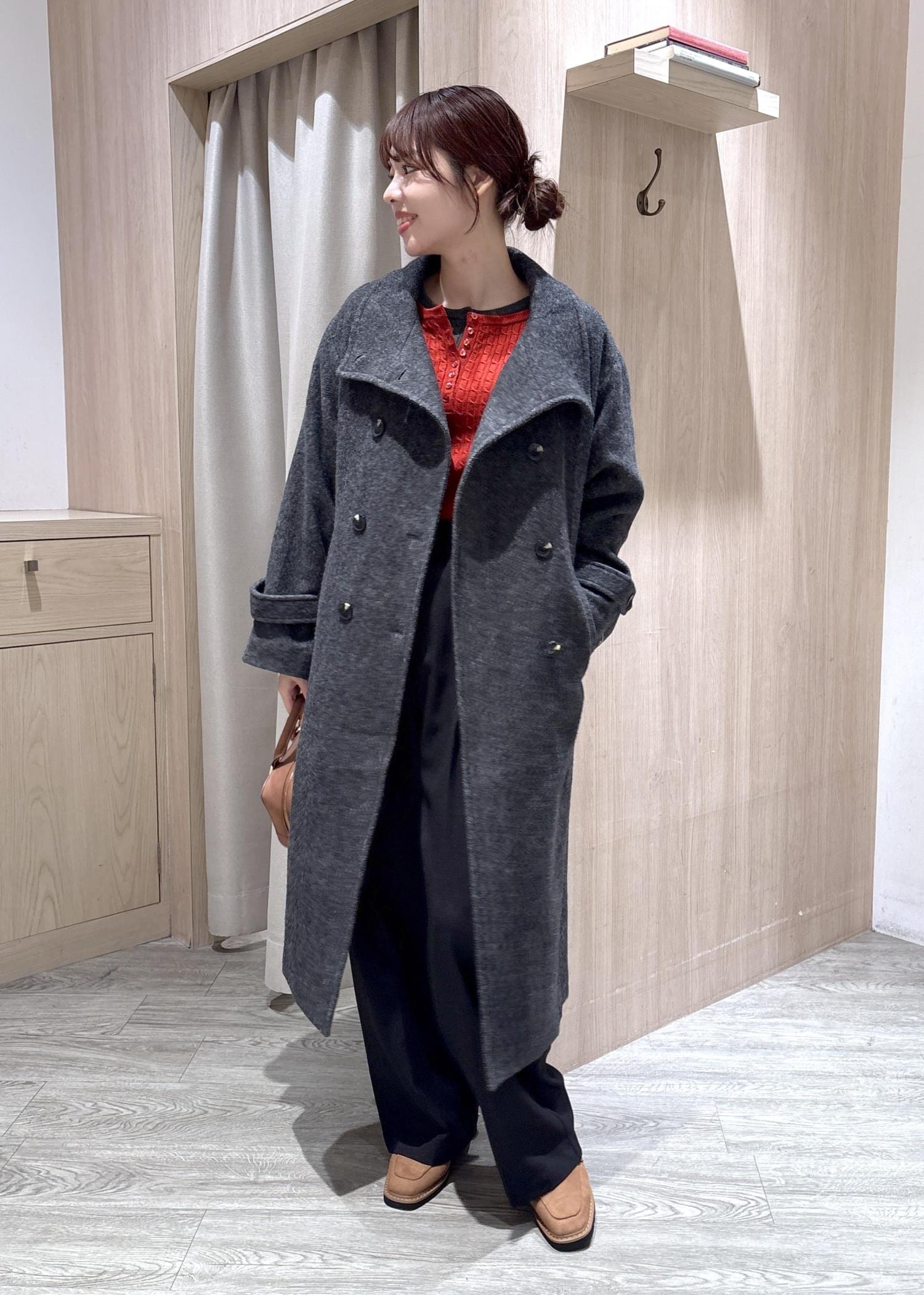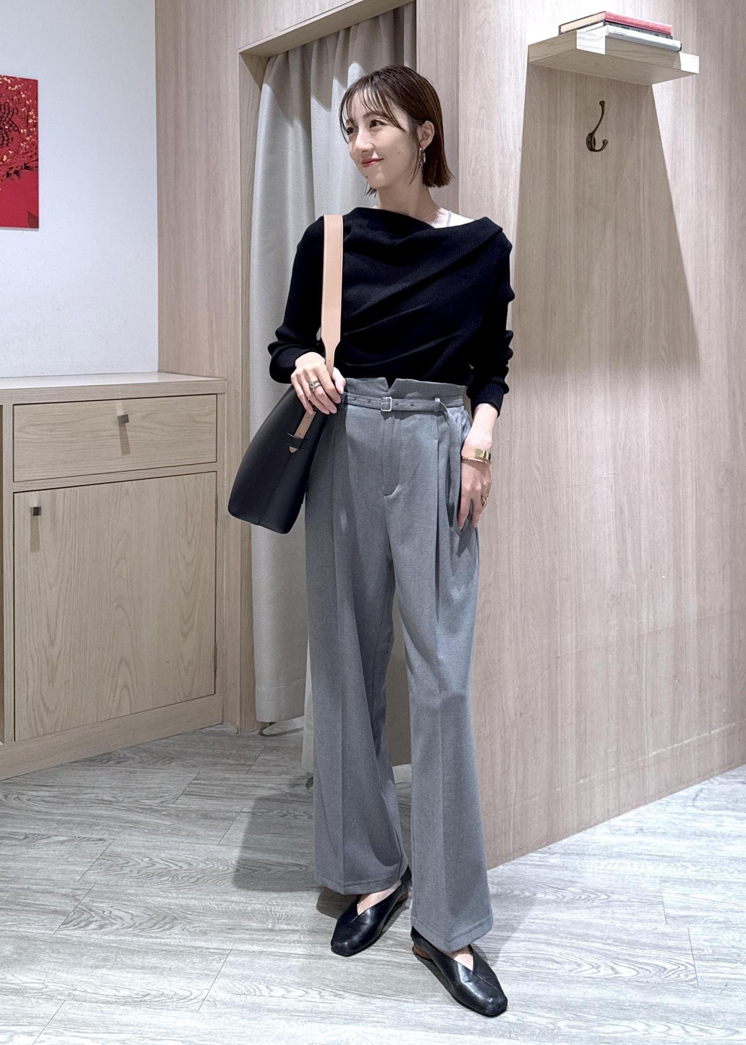 グレーのワンピースにグレーのパンツを合わせることで、セットアップ風のレイヤードコーデに!