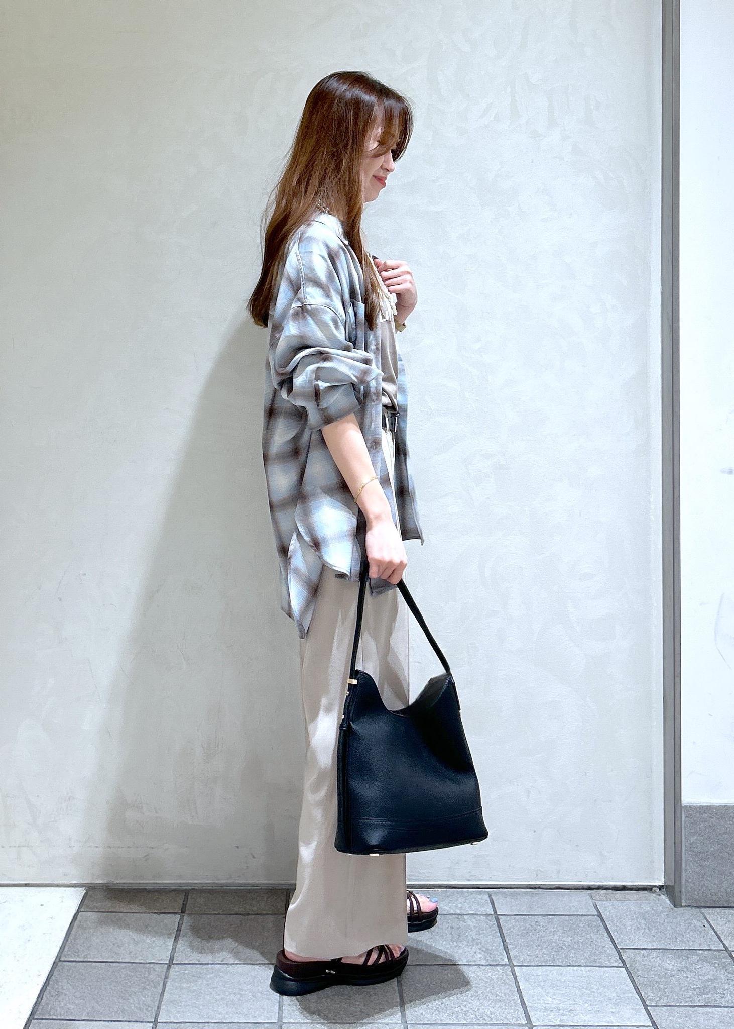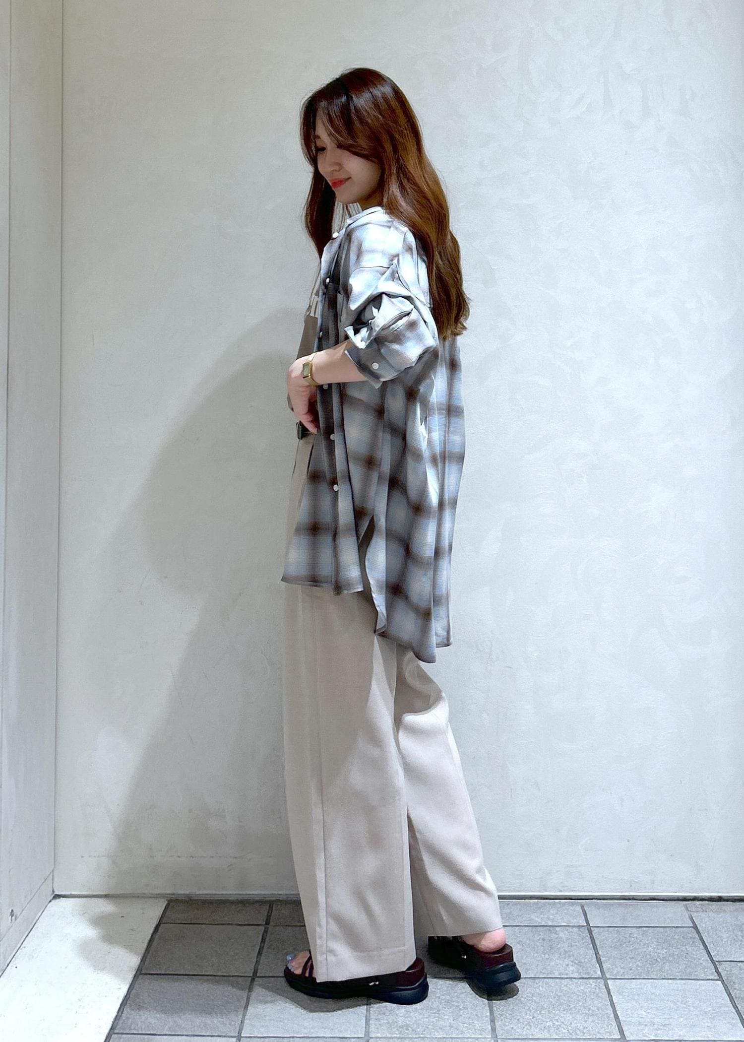 ベージュのワントーンコーデにチェック柄で秋先取りなスタイリングにしました。