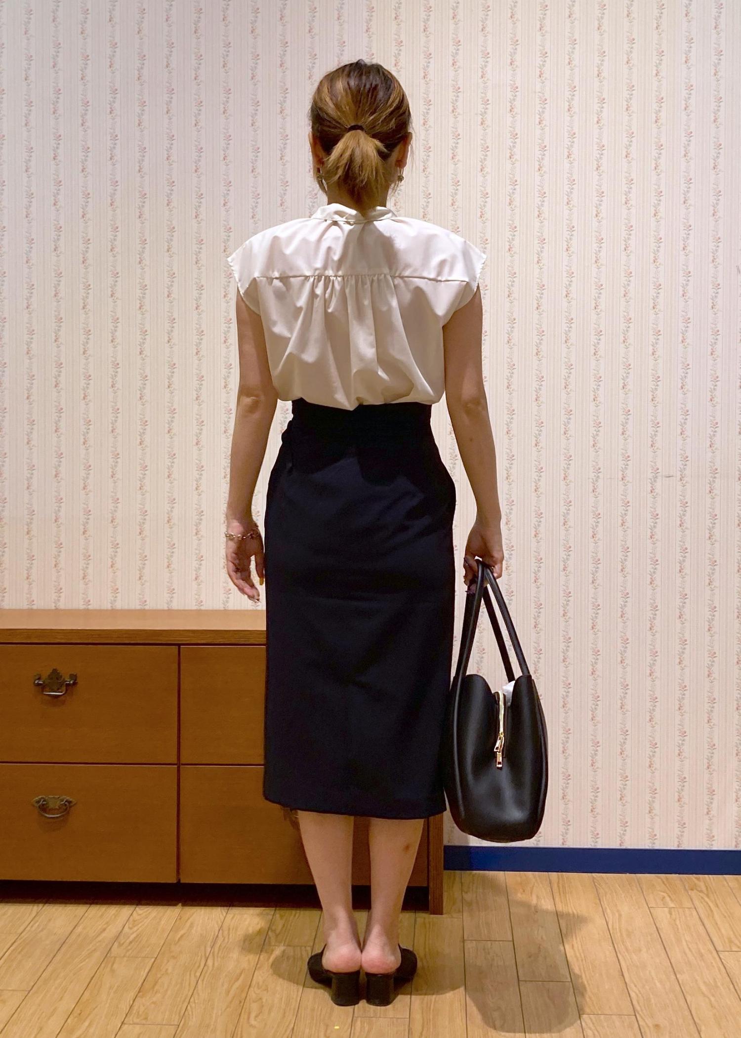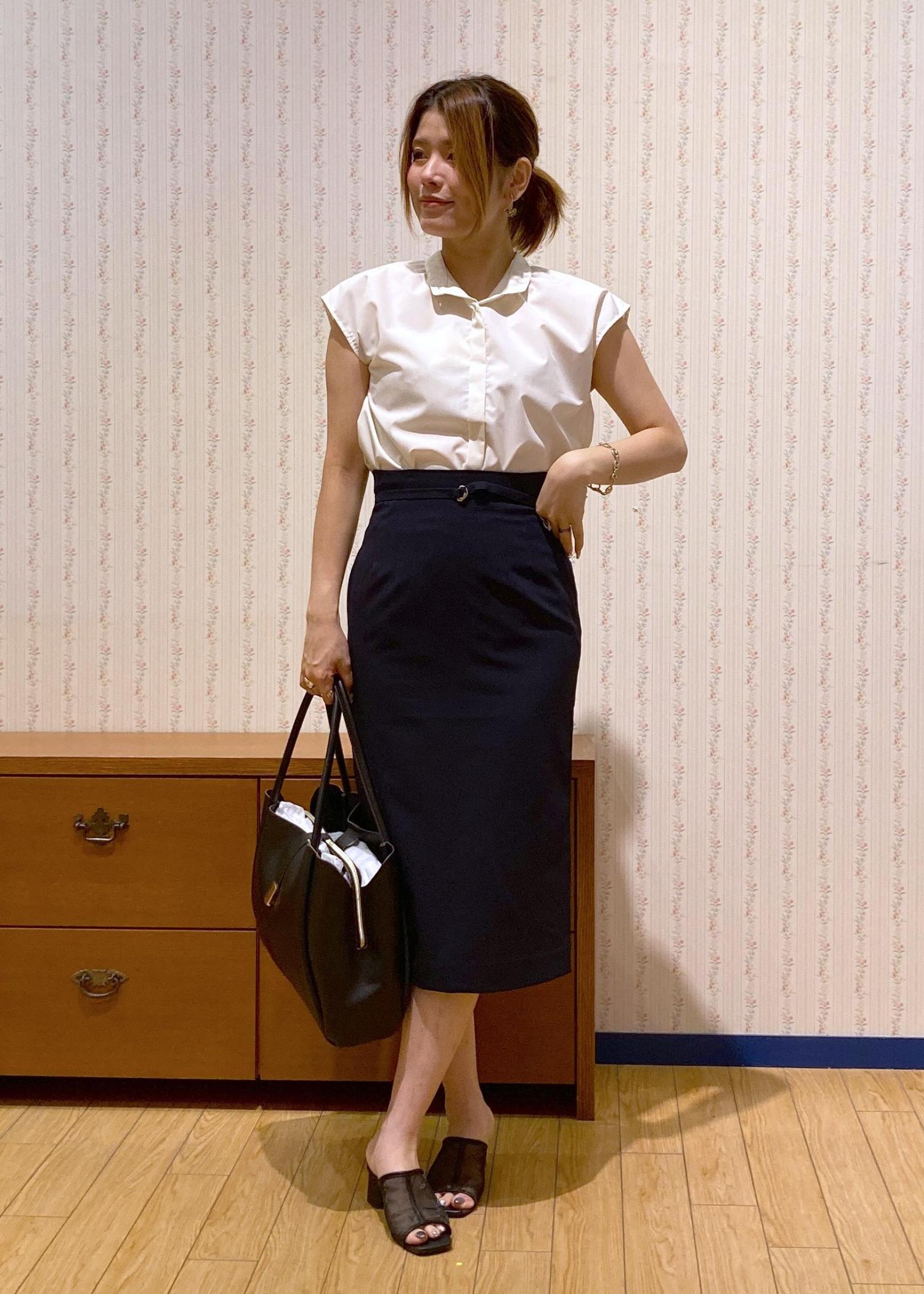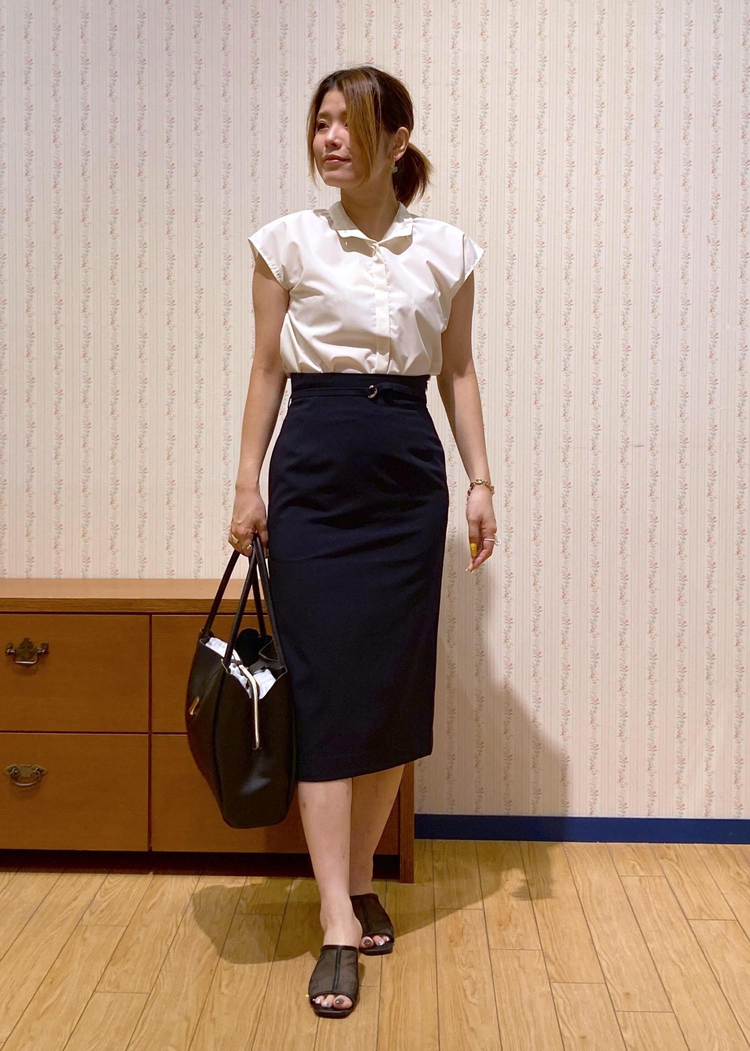 フレンチスリーブのブラウスにタイトスカートを合わせた王道オフィスコーディネート。