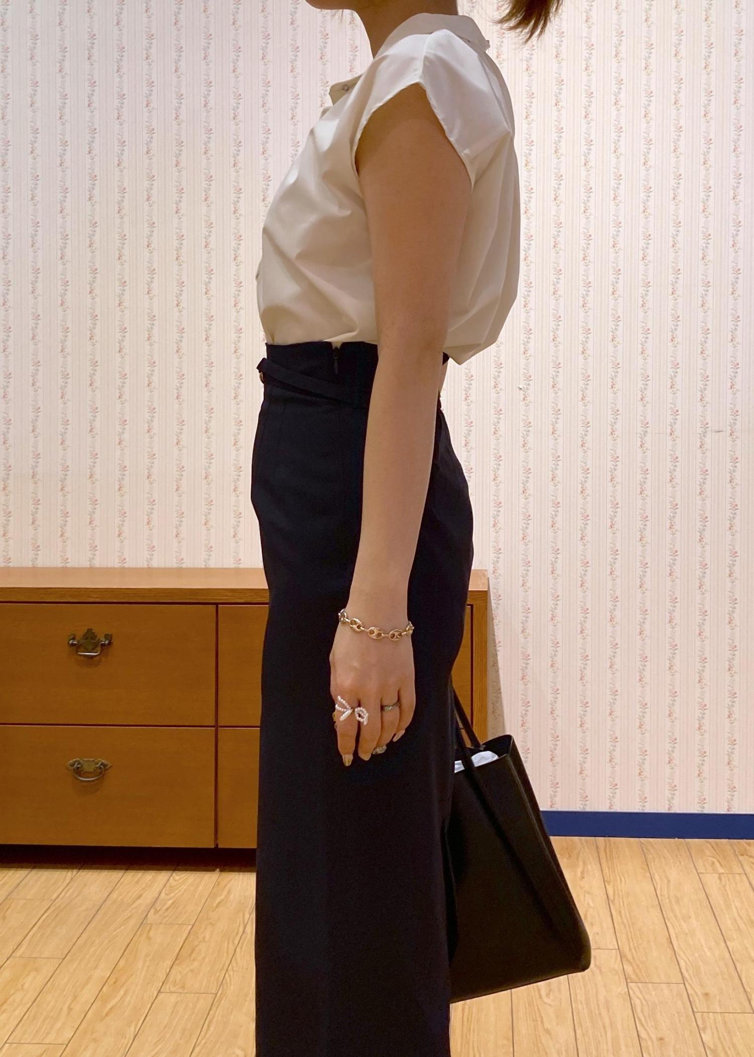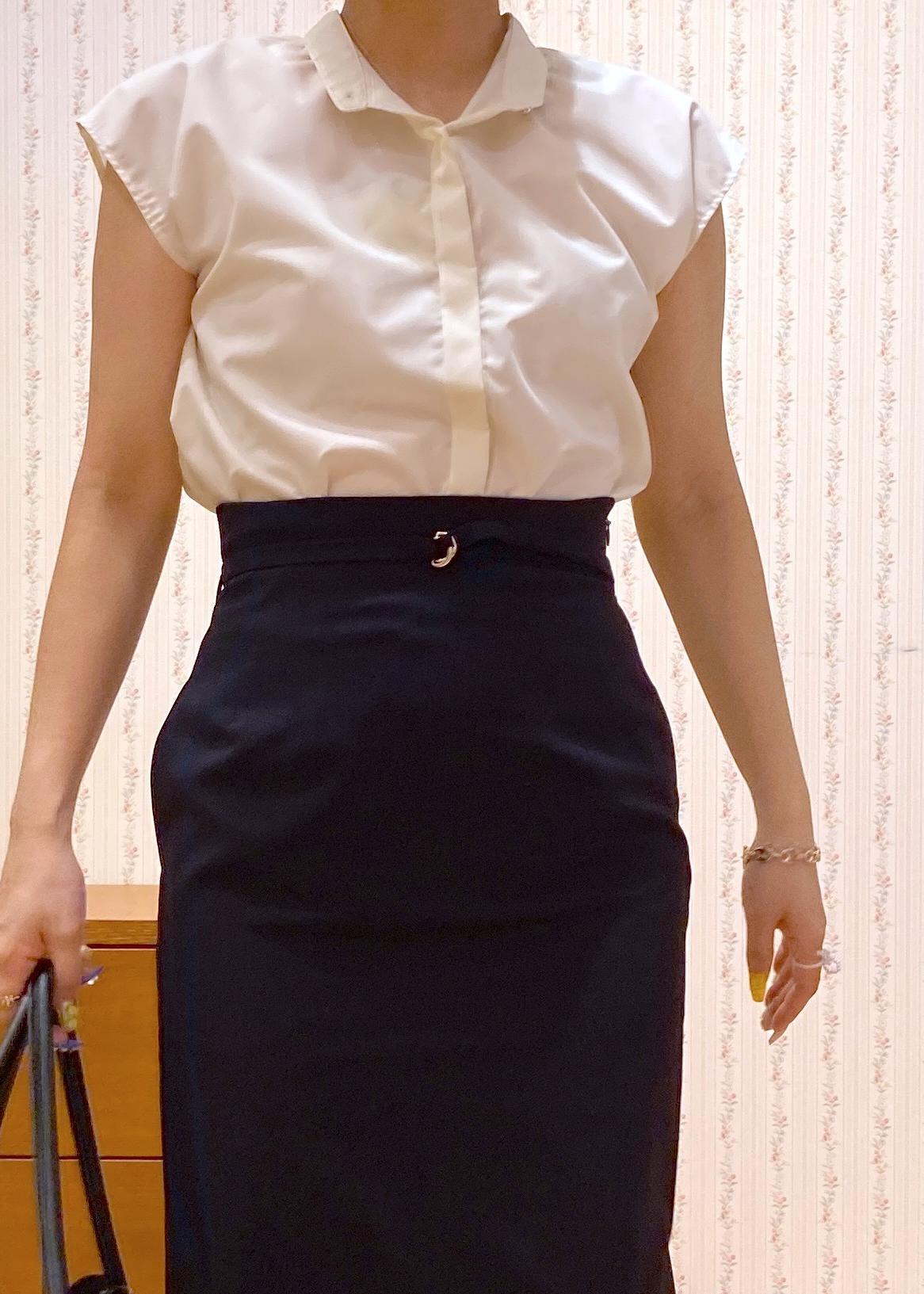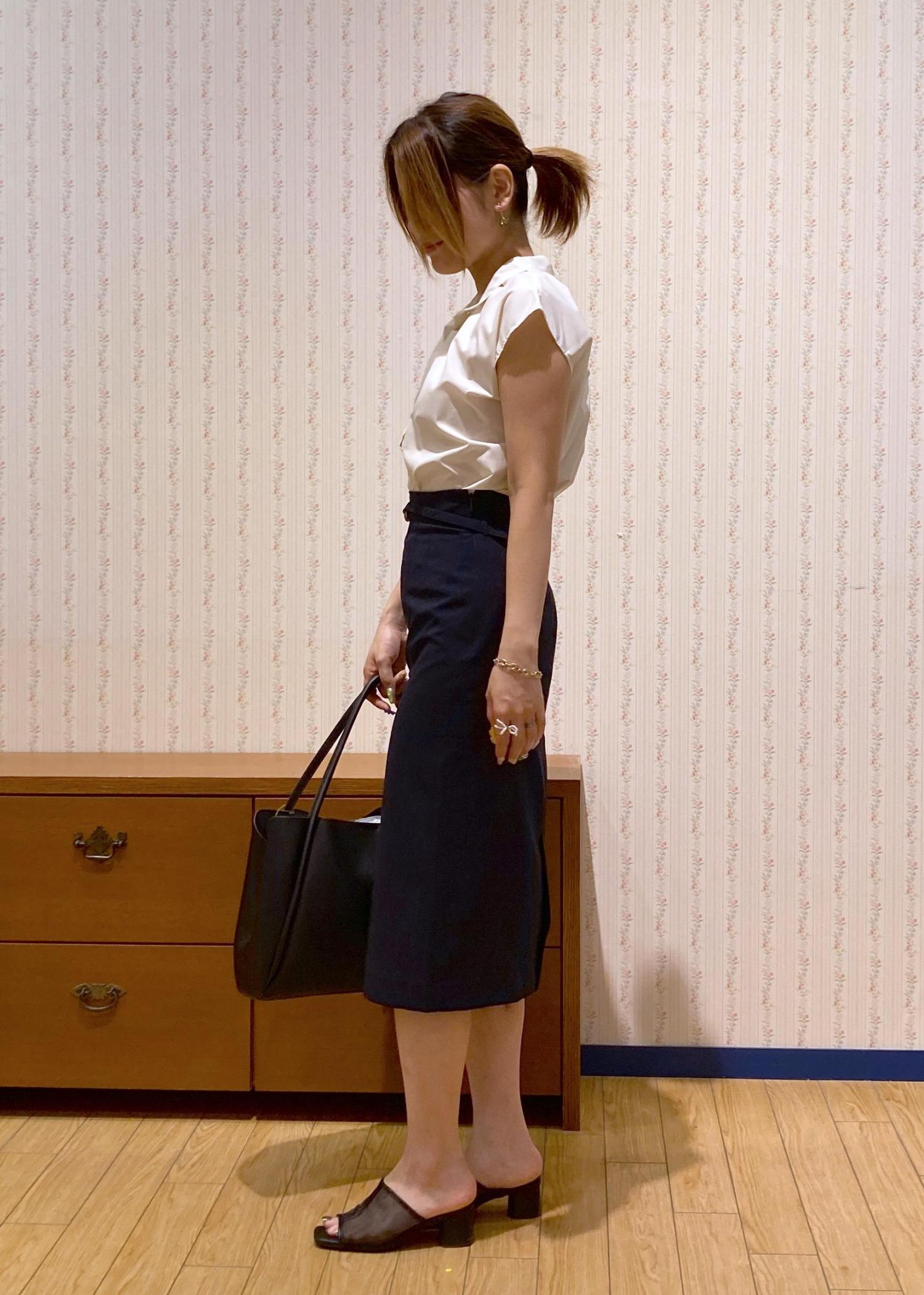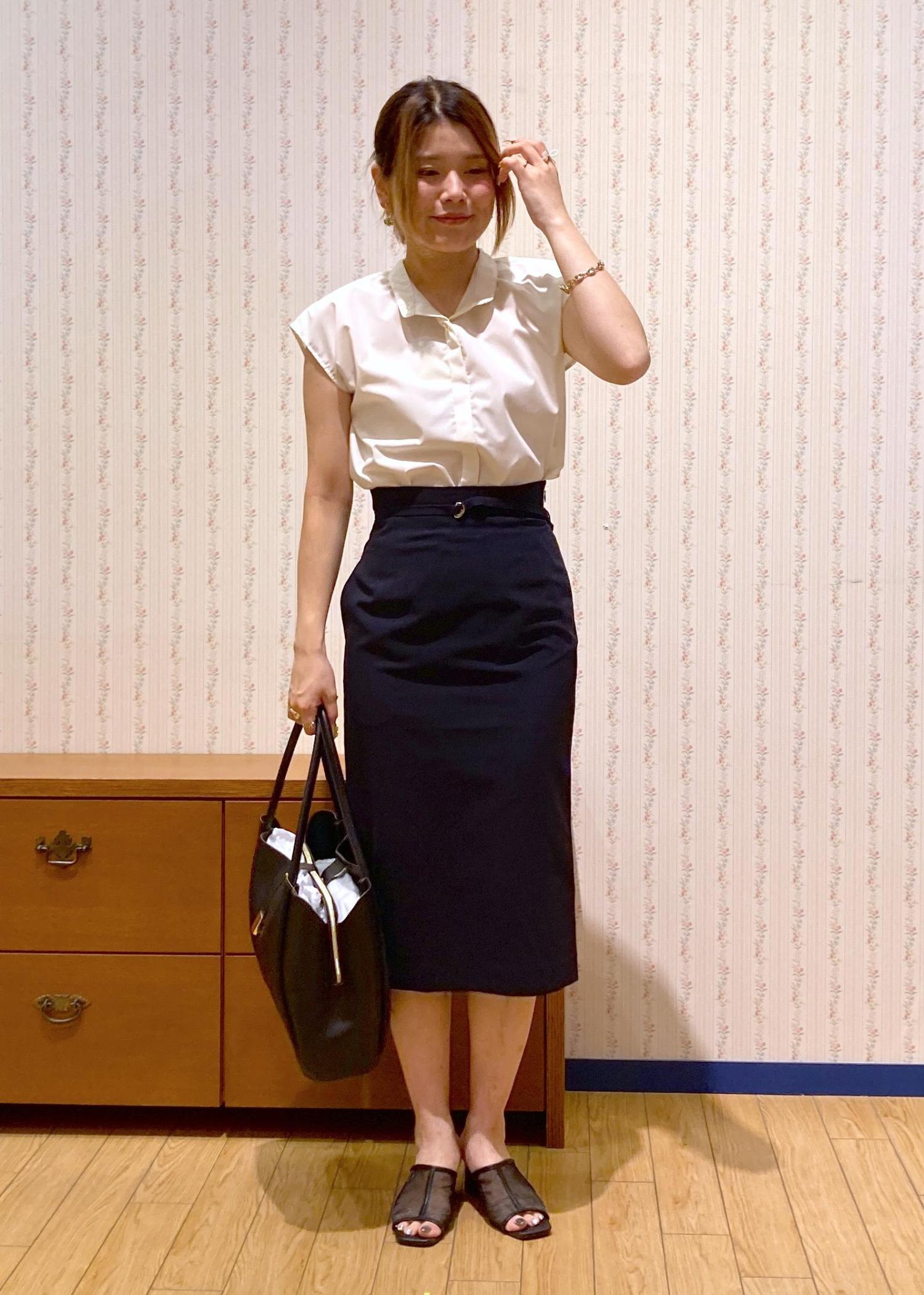 フレンチスリーブのブラウスにタイトスカートを合わせた王道オフィスコーディネート。