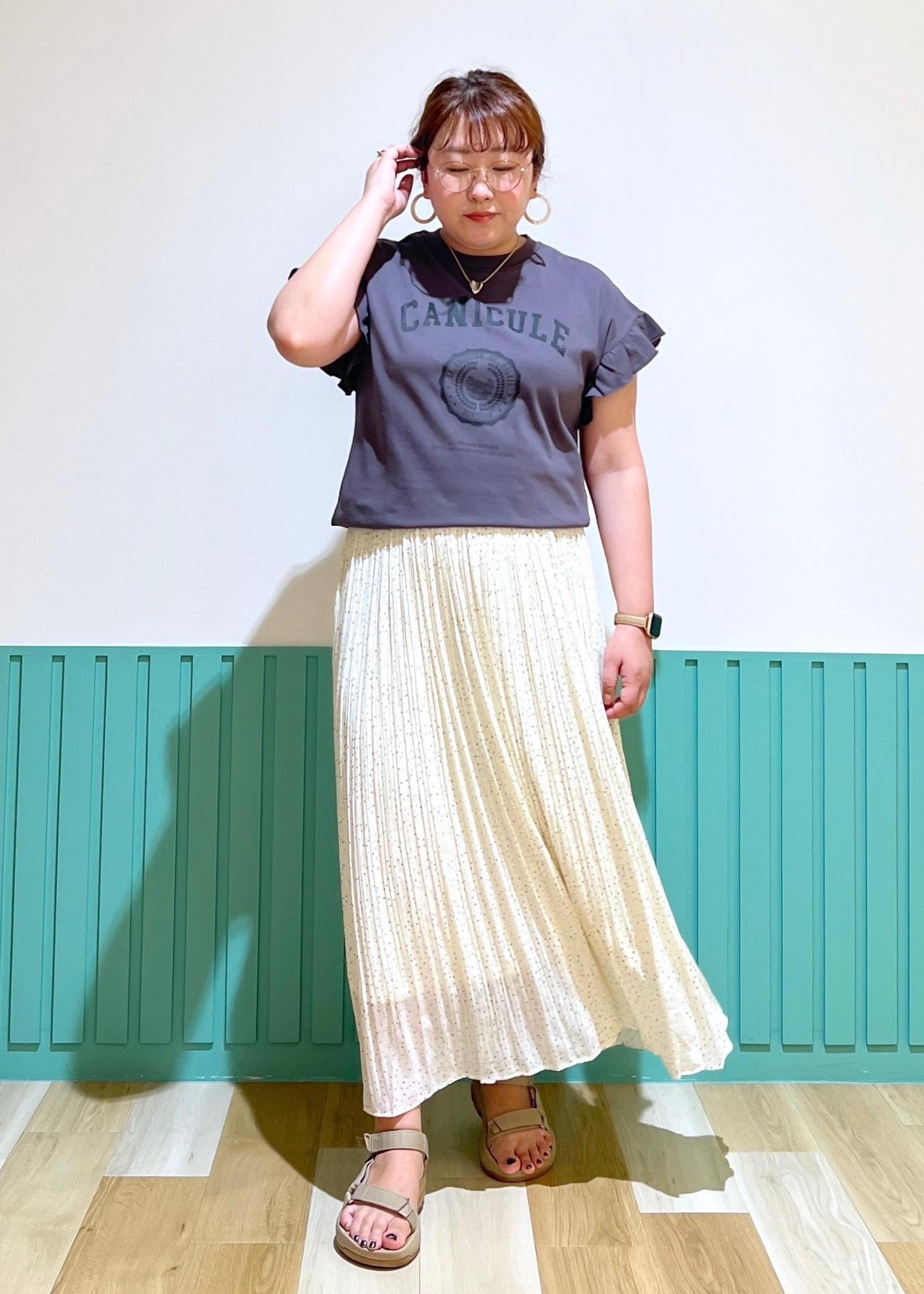 フリルTシャツとプリーツスカート で