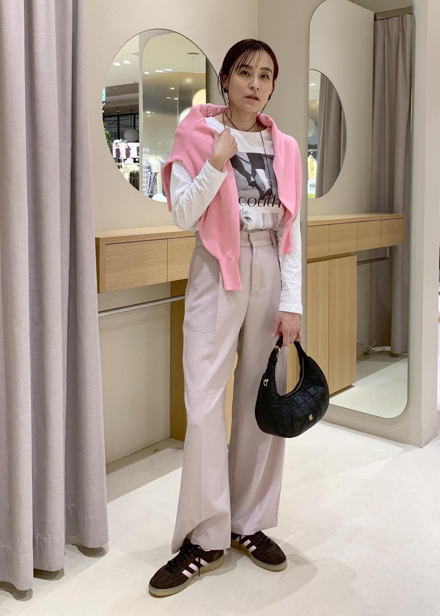 明るいお色味ですので、トップスはシンプルなものでも、コーデ全体を華やかにしてくれます。