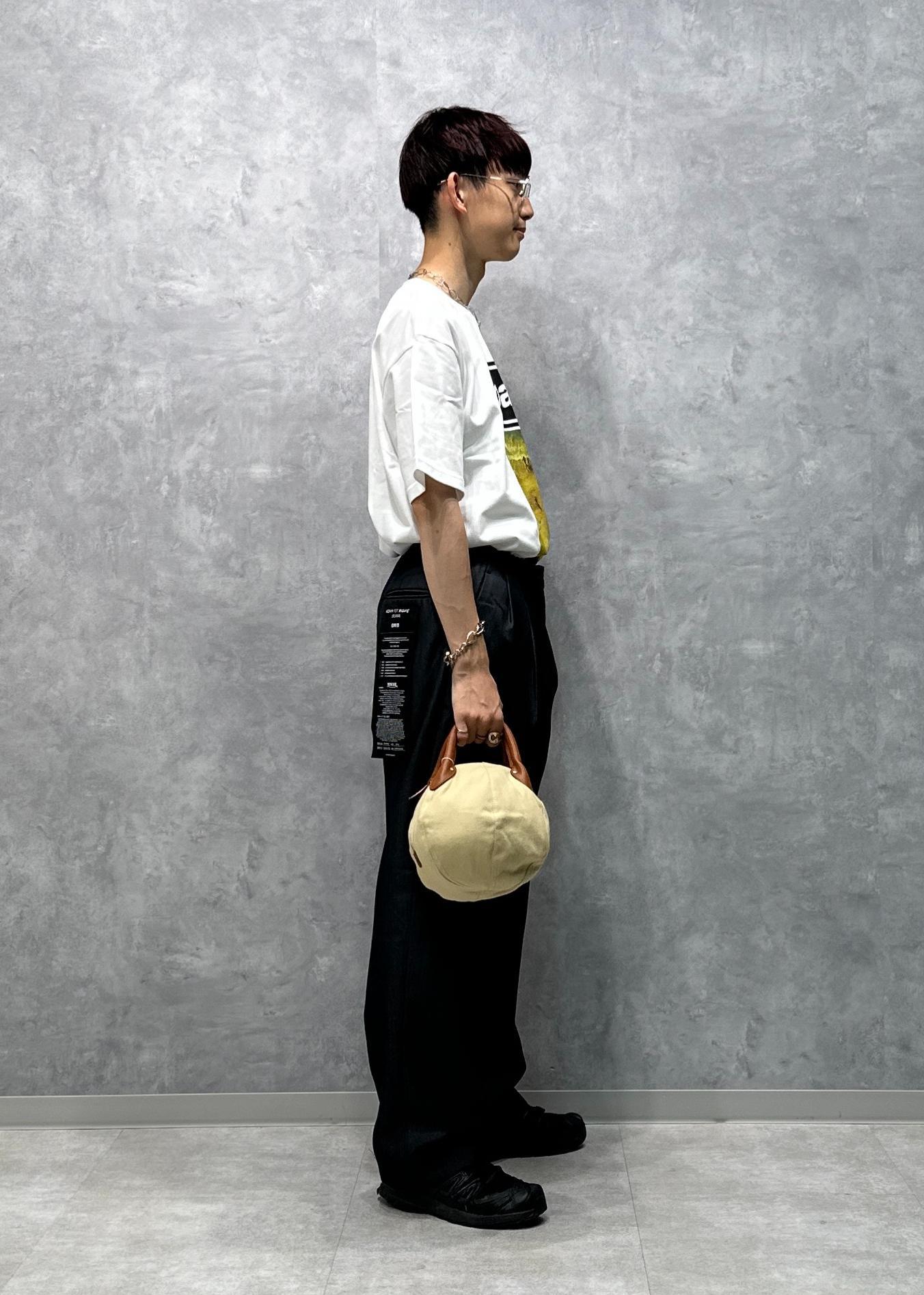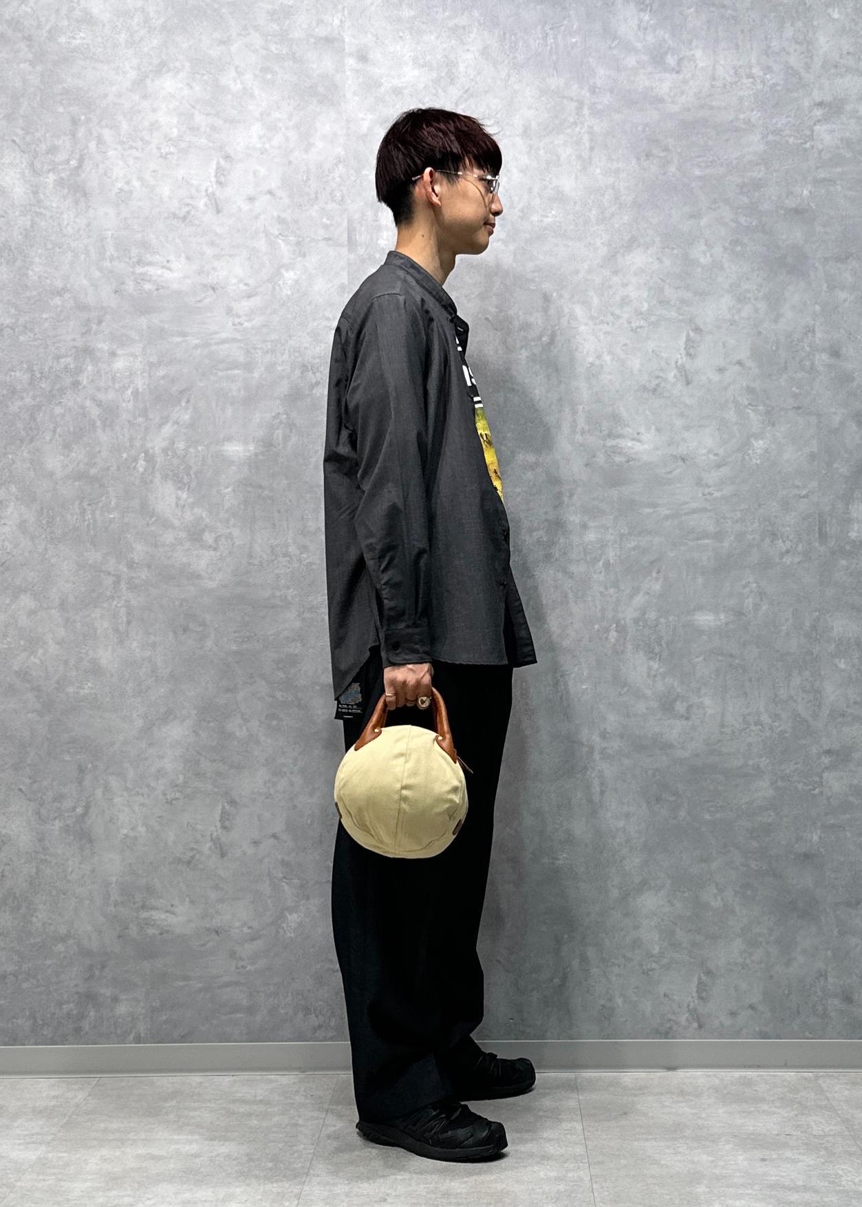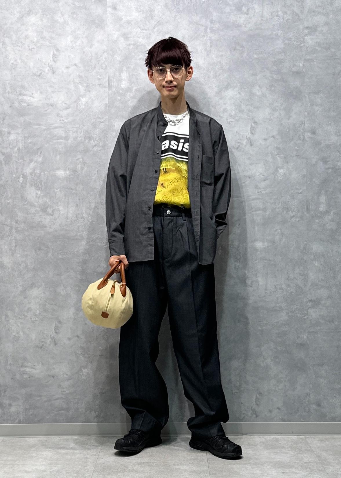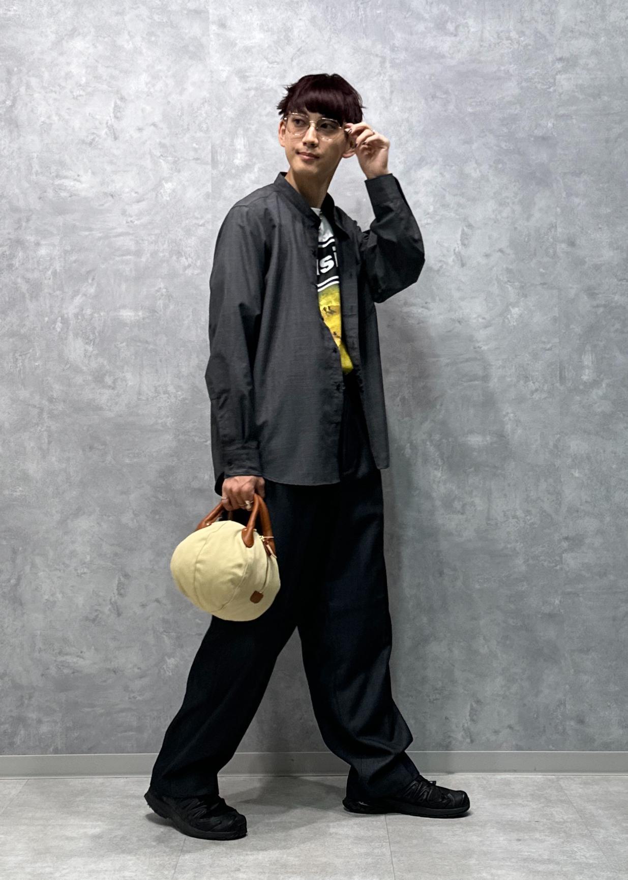 デニムスラックスにバンドカラーシャツを羽織ったシンプルながらもシックな色味でまとめた大人っぽいコーデに仕上げました。インナーのプリントTとボウリングバッグで遊び心を出し、重たすぎないように意識しました。