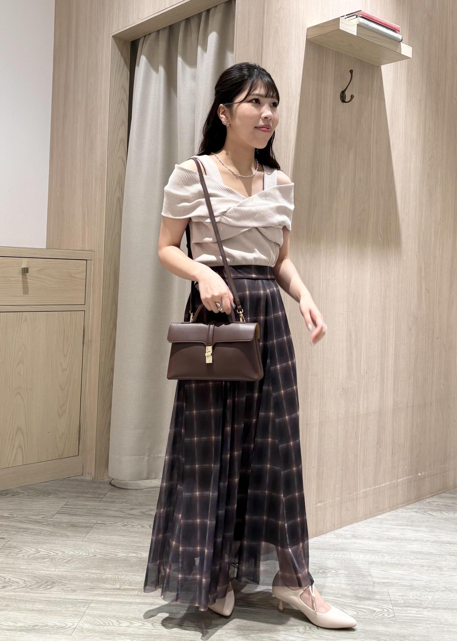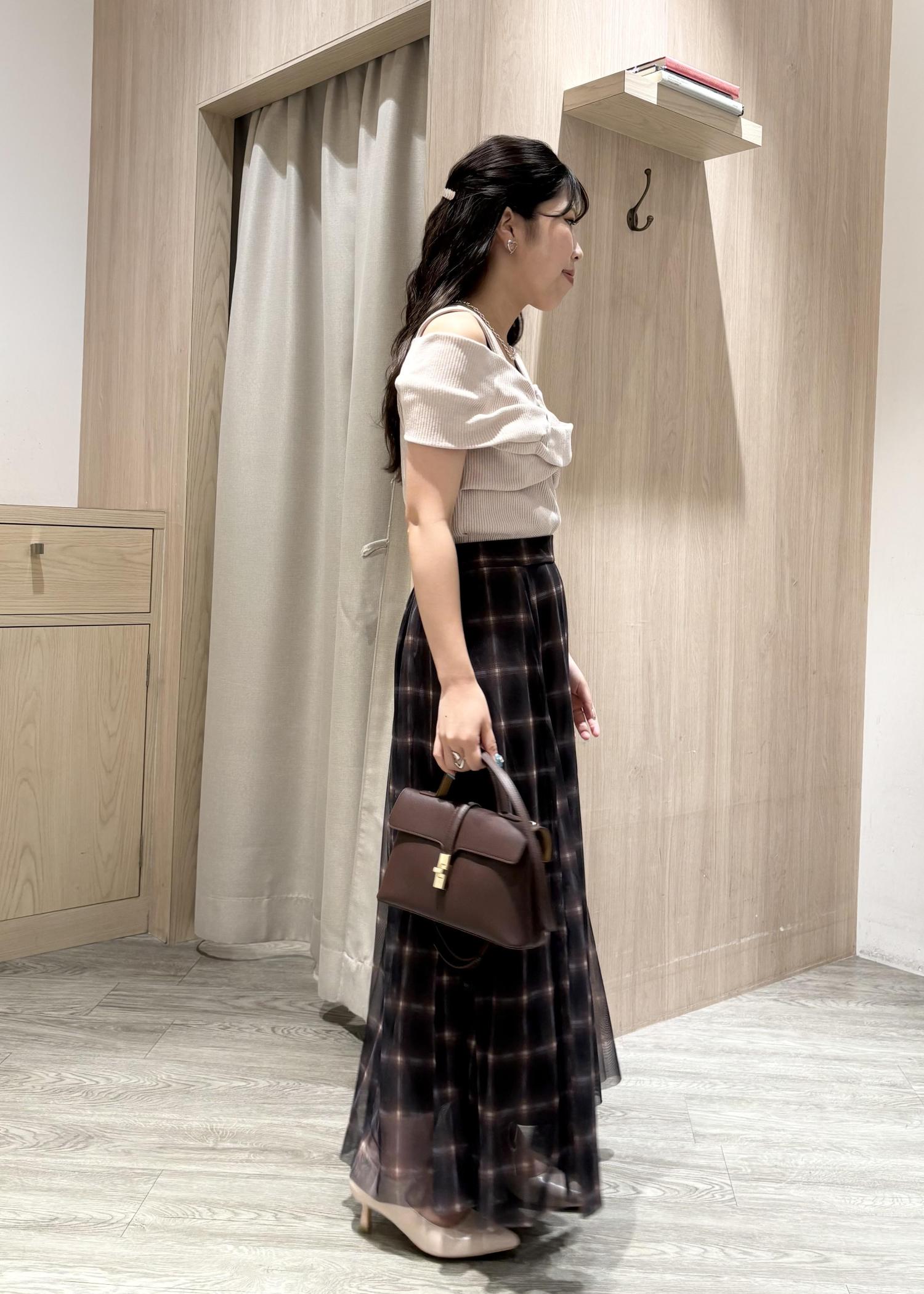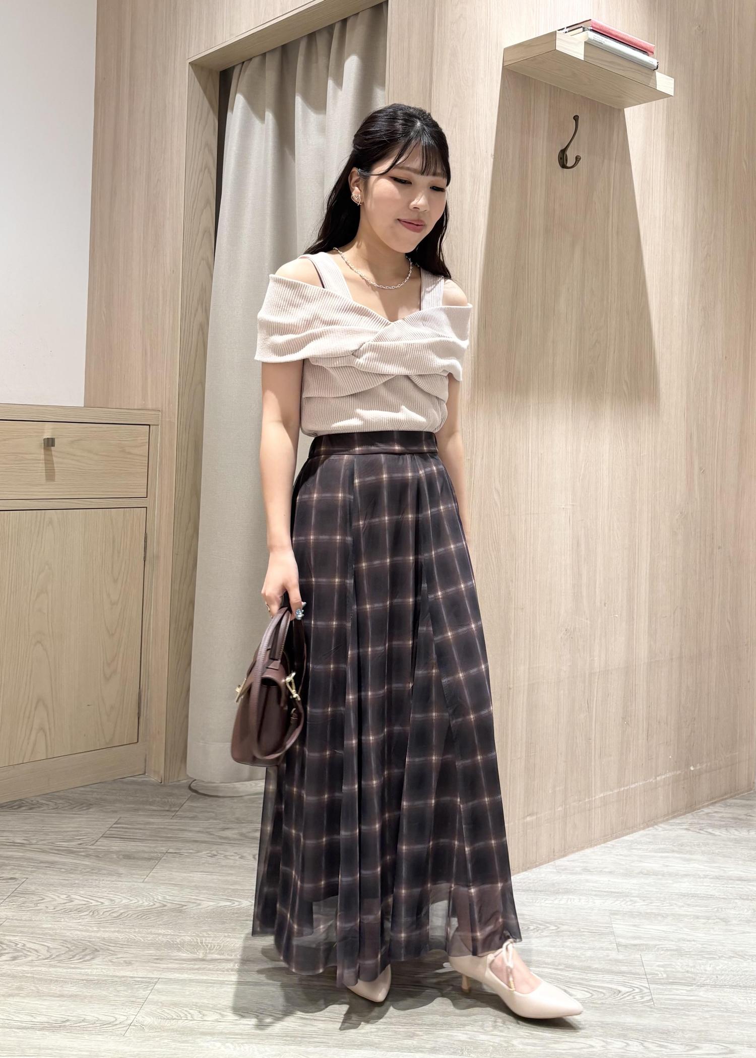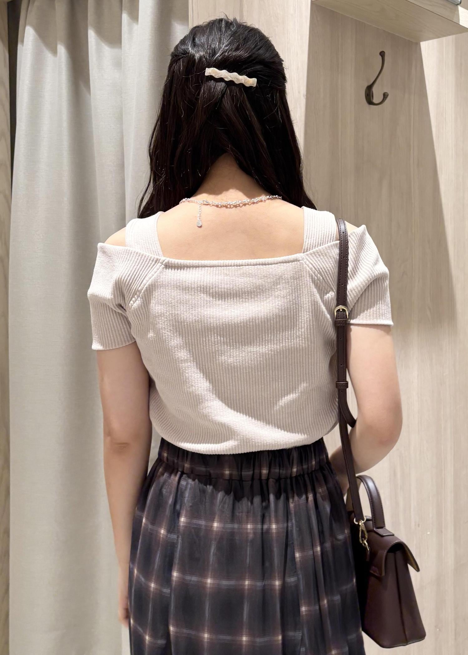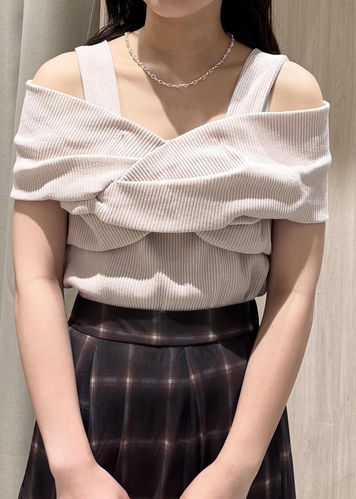 オフショルのトップスは、ねじりリボンが目を惹くこと間違いなしです!!
