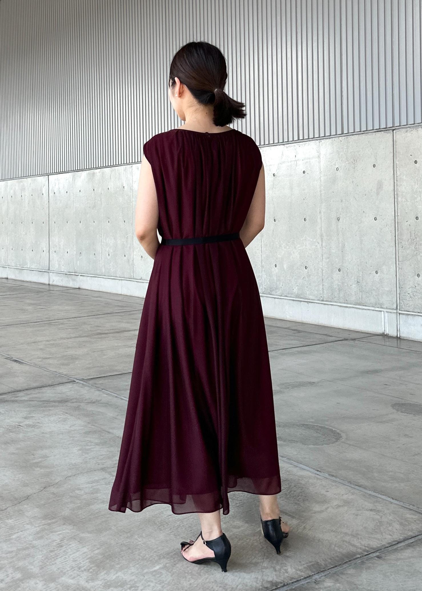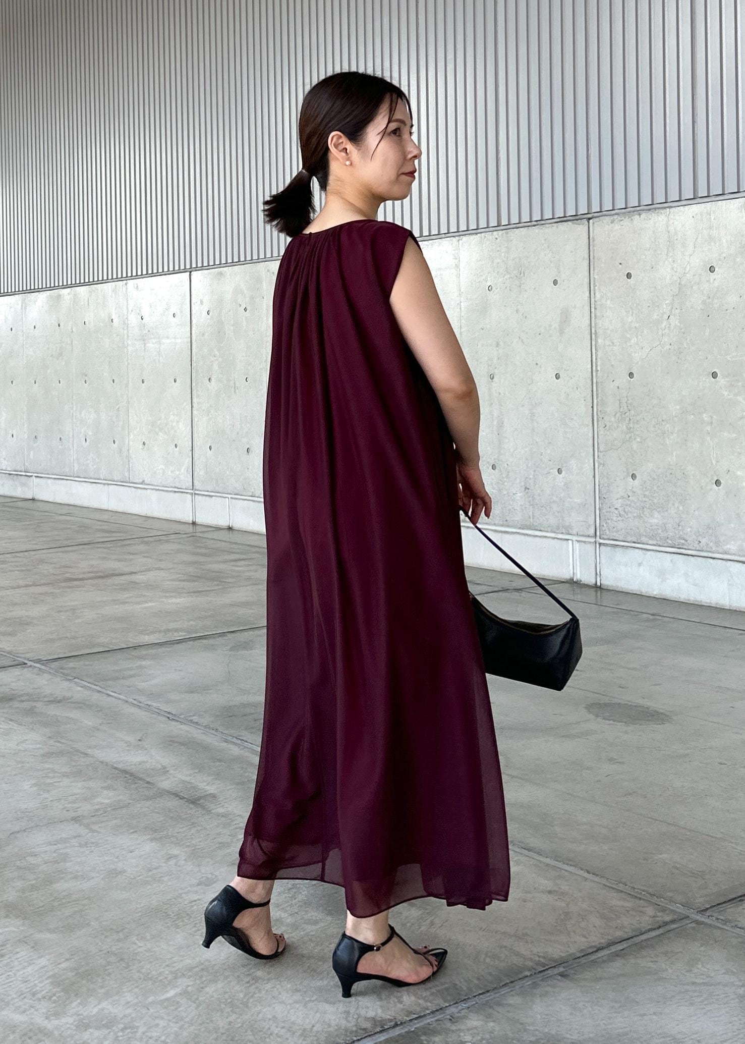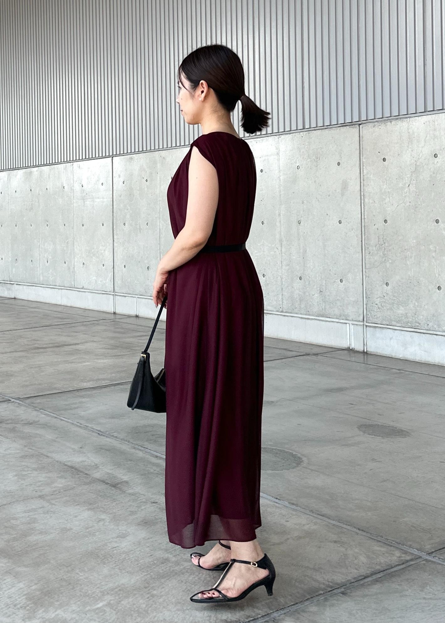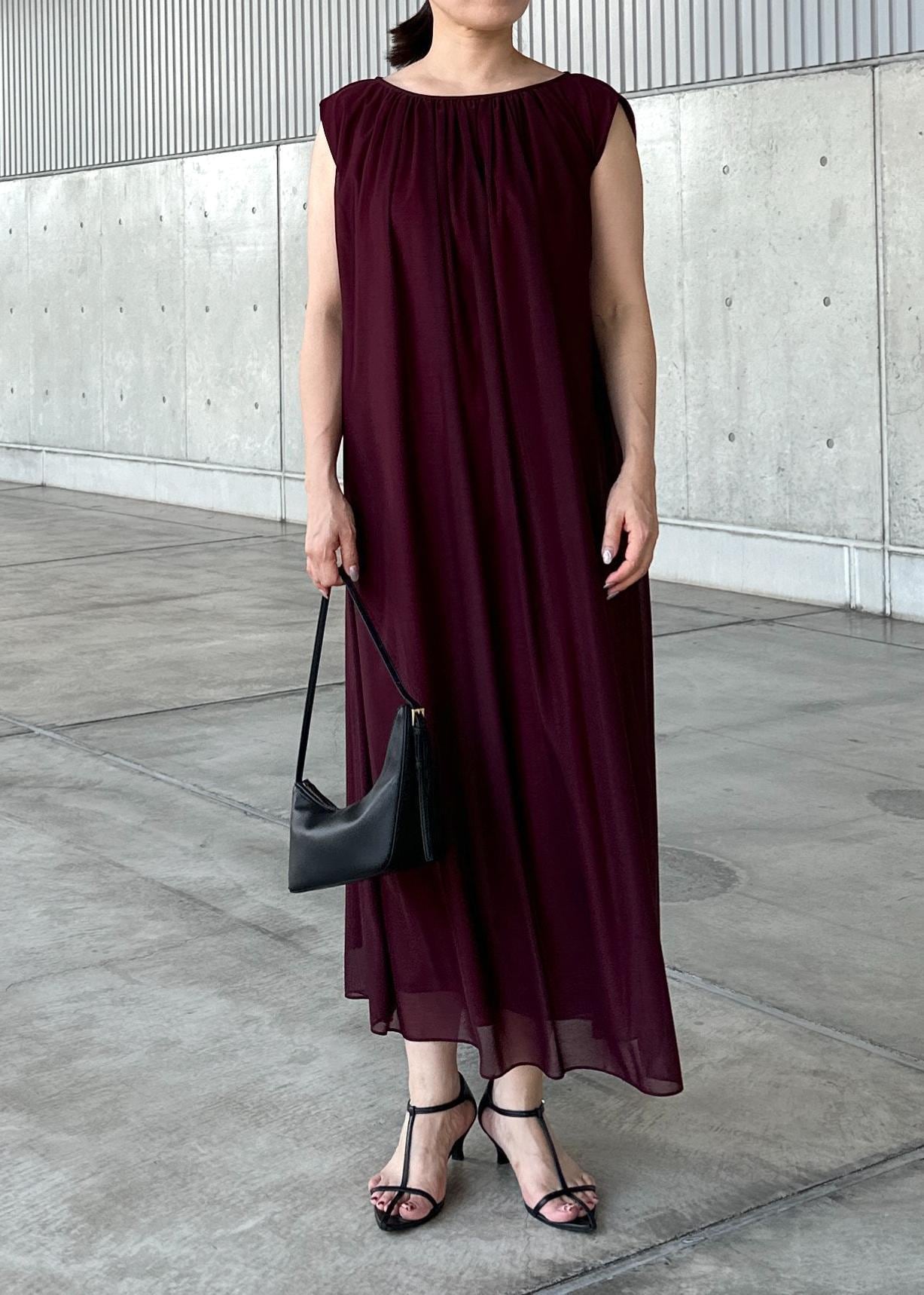 アウトレットROPÉ【洗える・新色追加】ブライトネスヤーンギャザーワンピースワイン / 38¥17,820レビュー身長156cm、38サイズ着用。