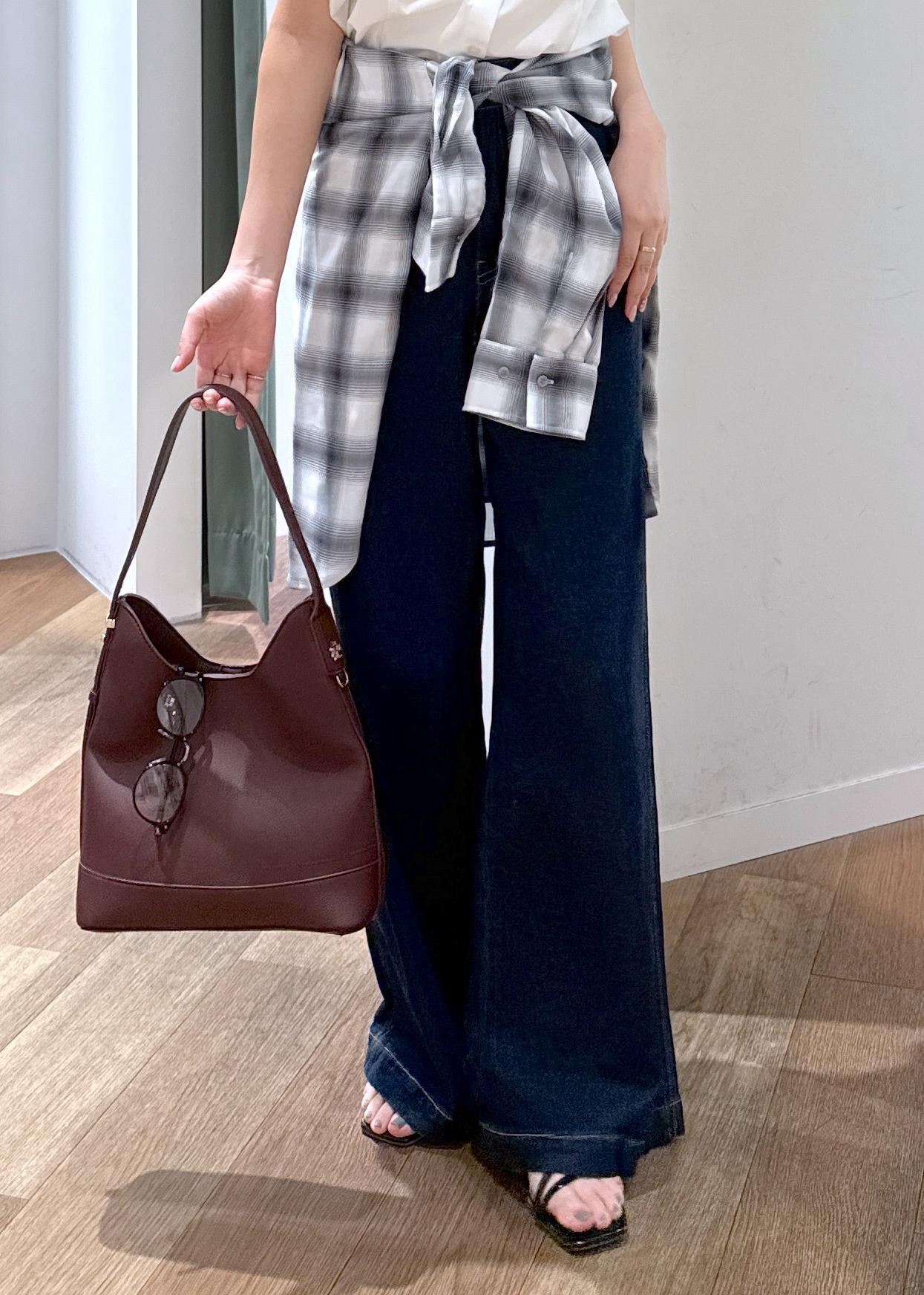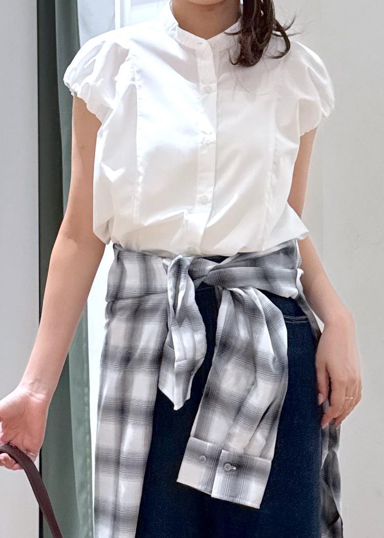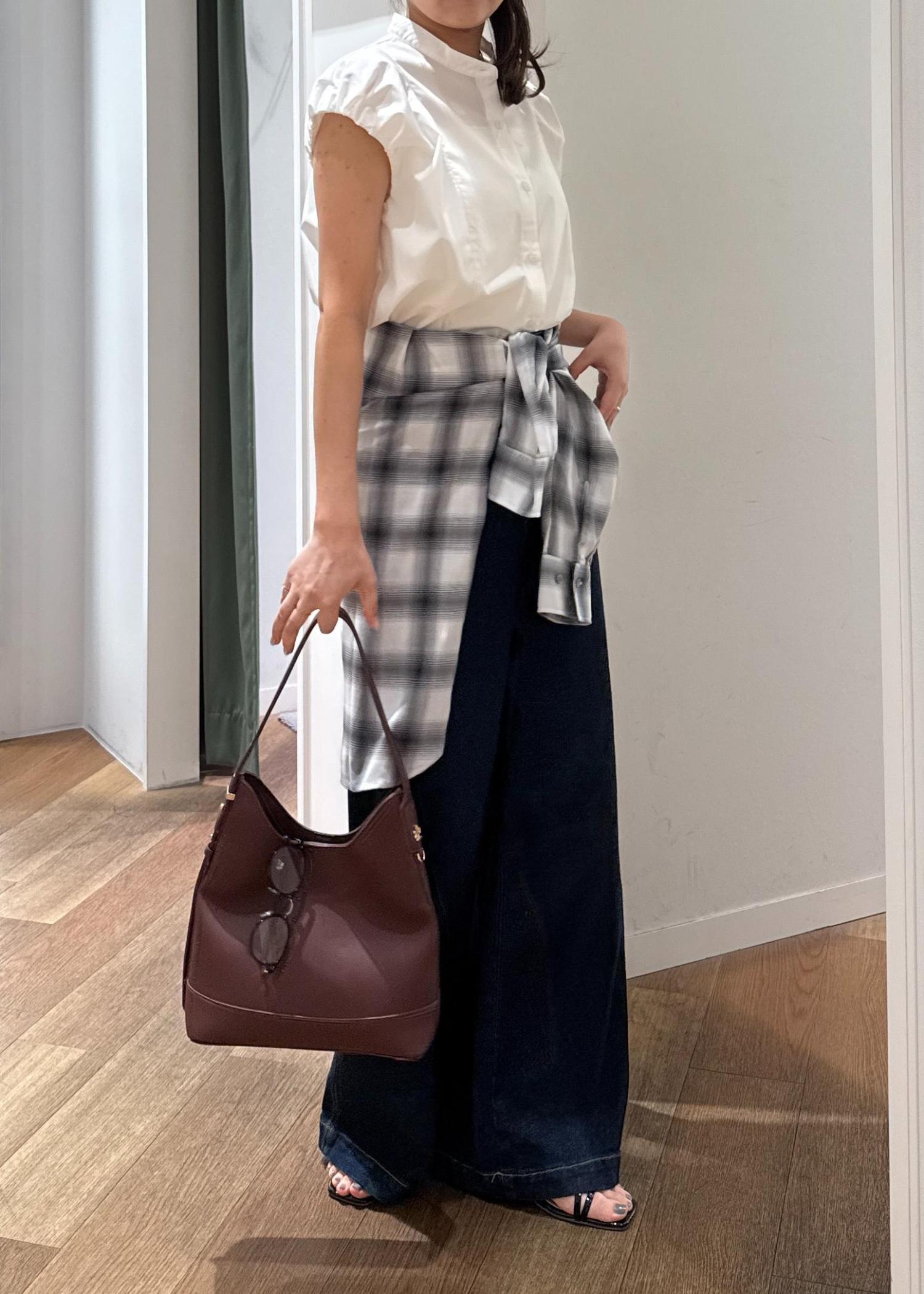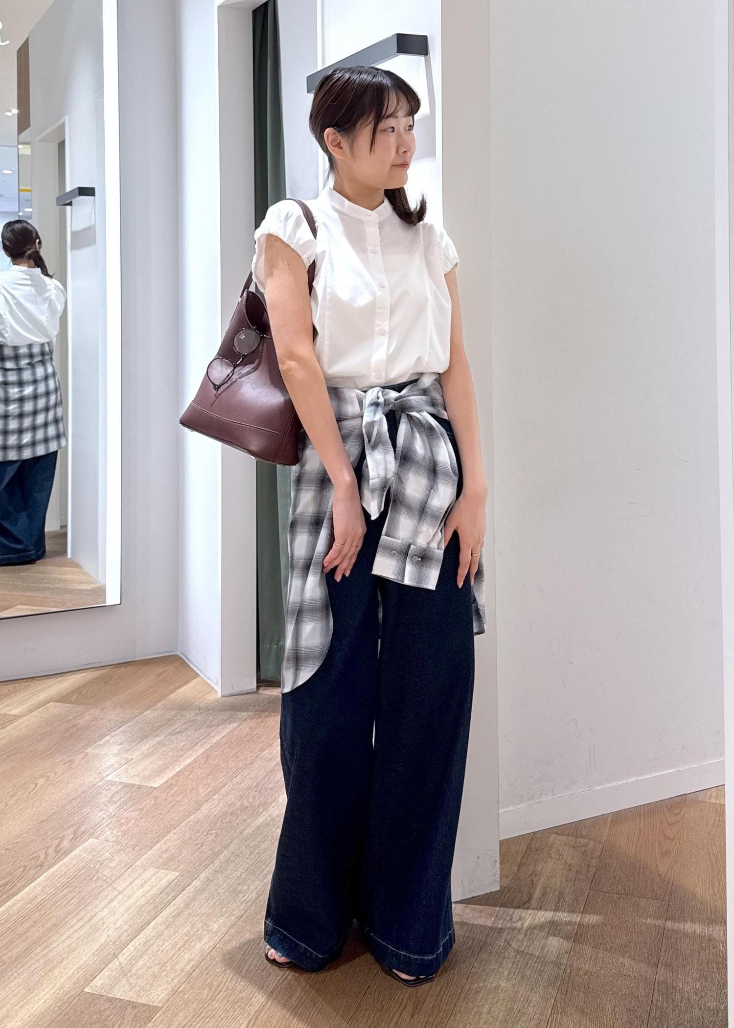 ホワイトのブラウス×デニムのシンプルなコーディネートにチェックのシャツをワンポイントで腰巻きしたコーディネートです。