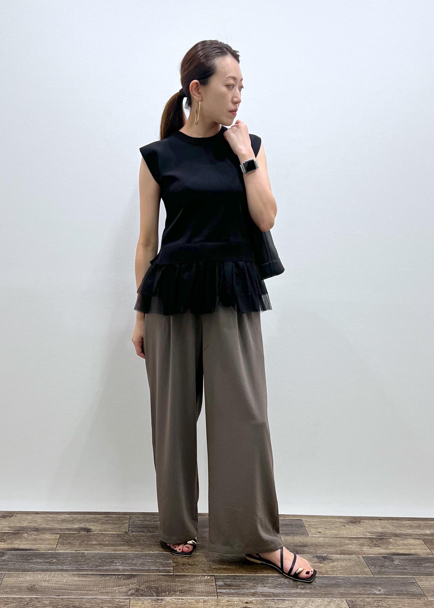セットアップでも着れるパンツは落ち感のある生地でシルエットがキレイです。