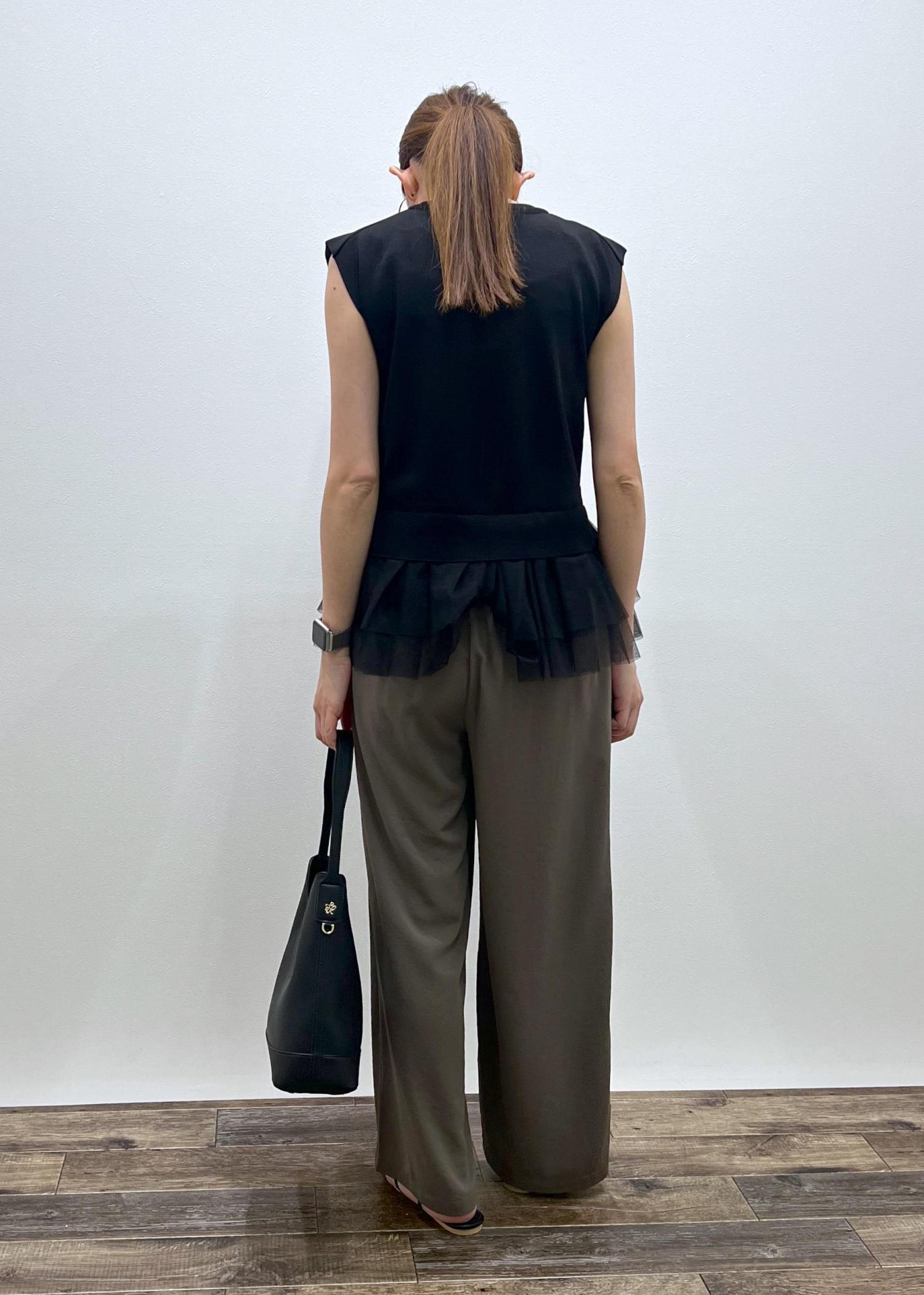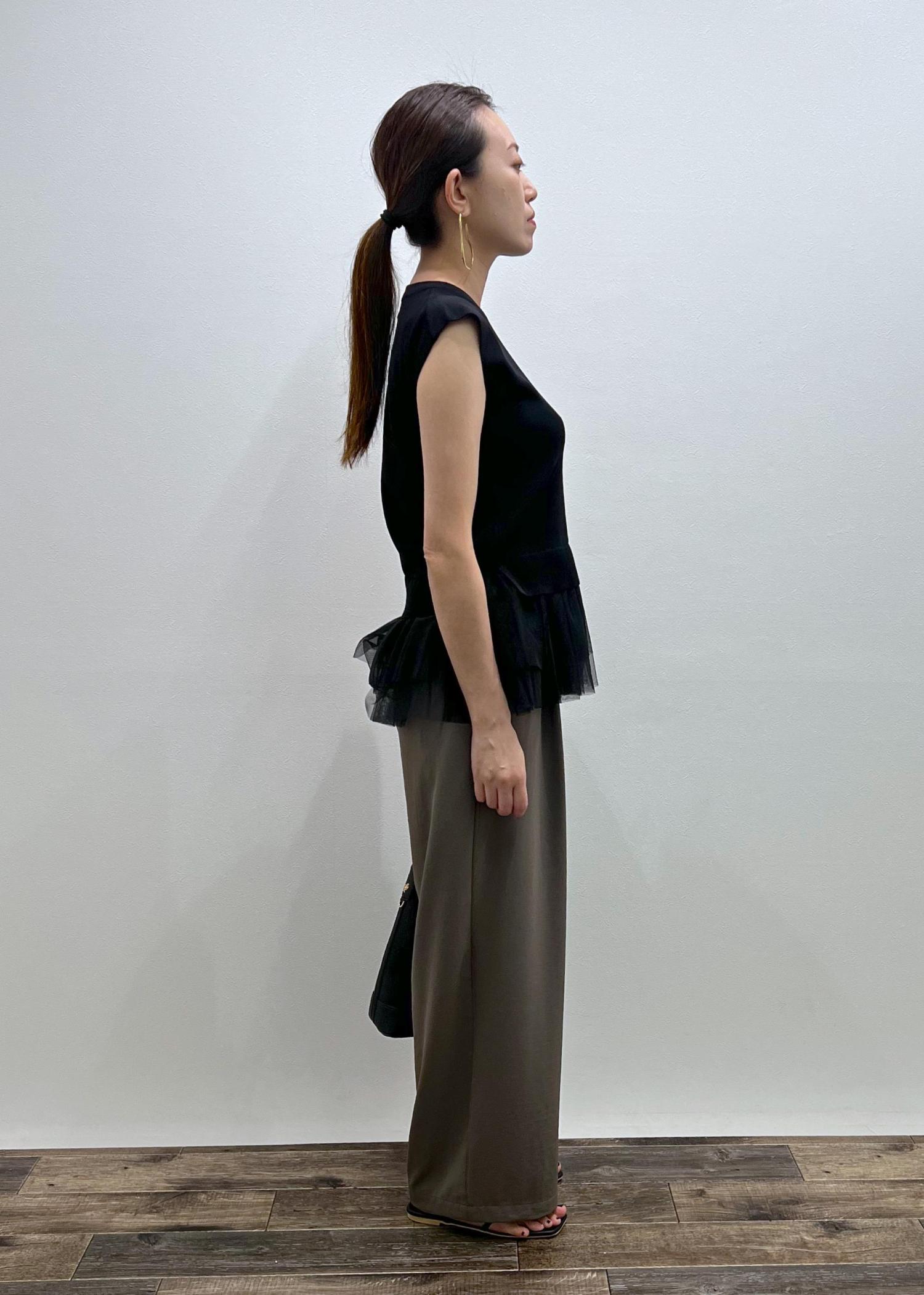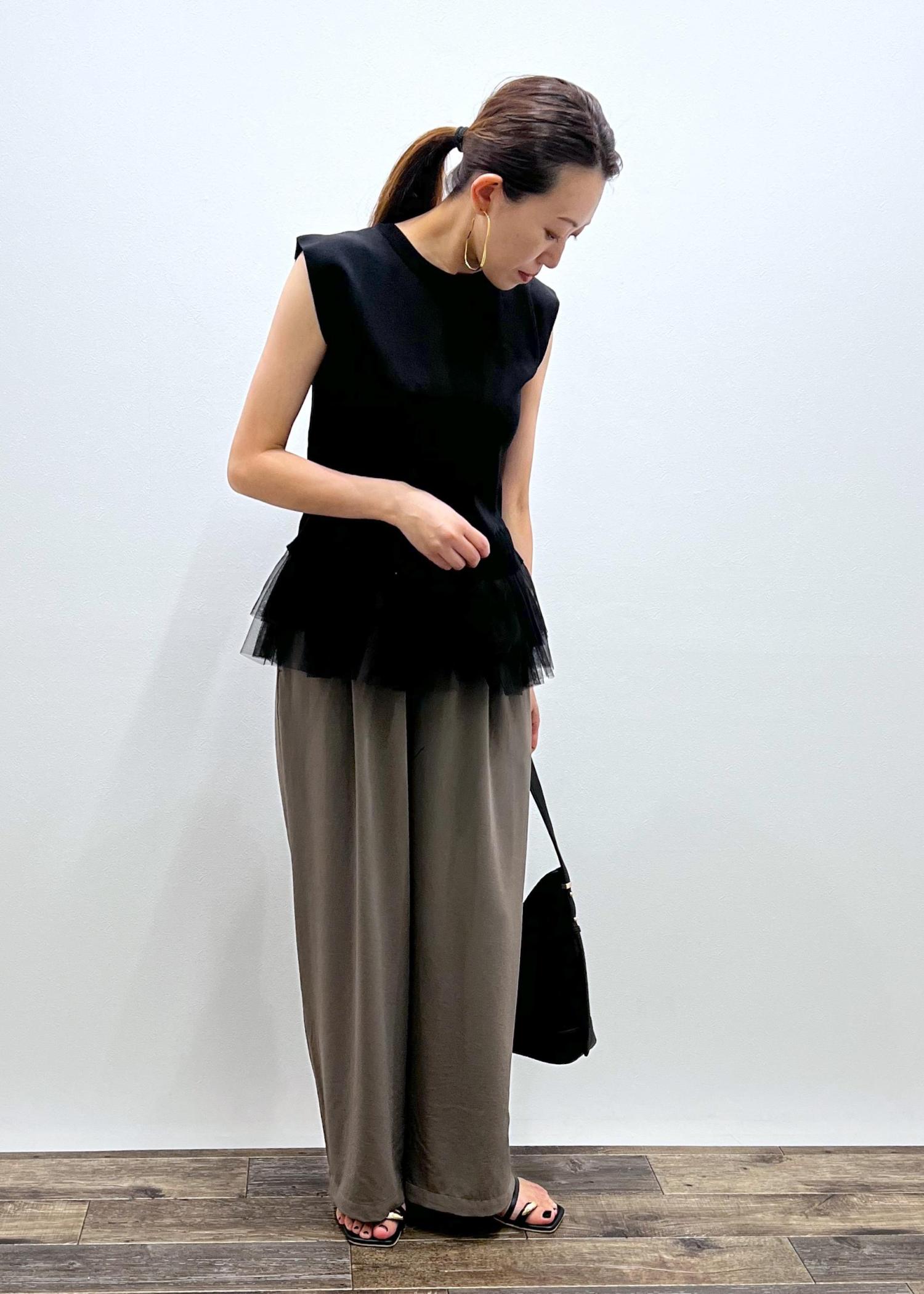 ブラック×カーキで落ち着いた雰囲気にまとめつつ、ウエストのフリルが華やかさを出してくれます。