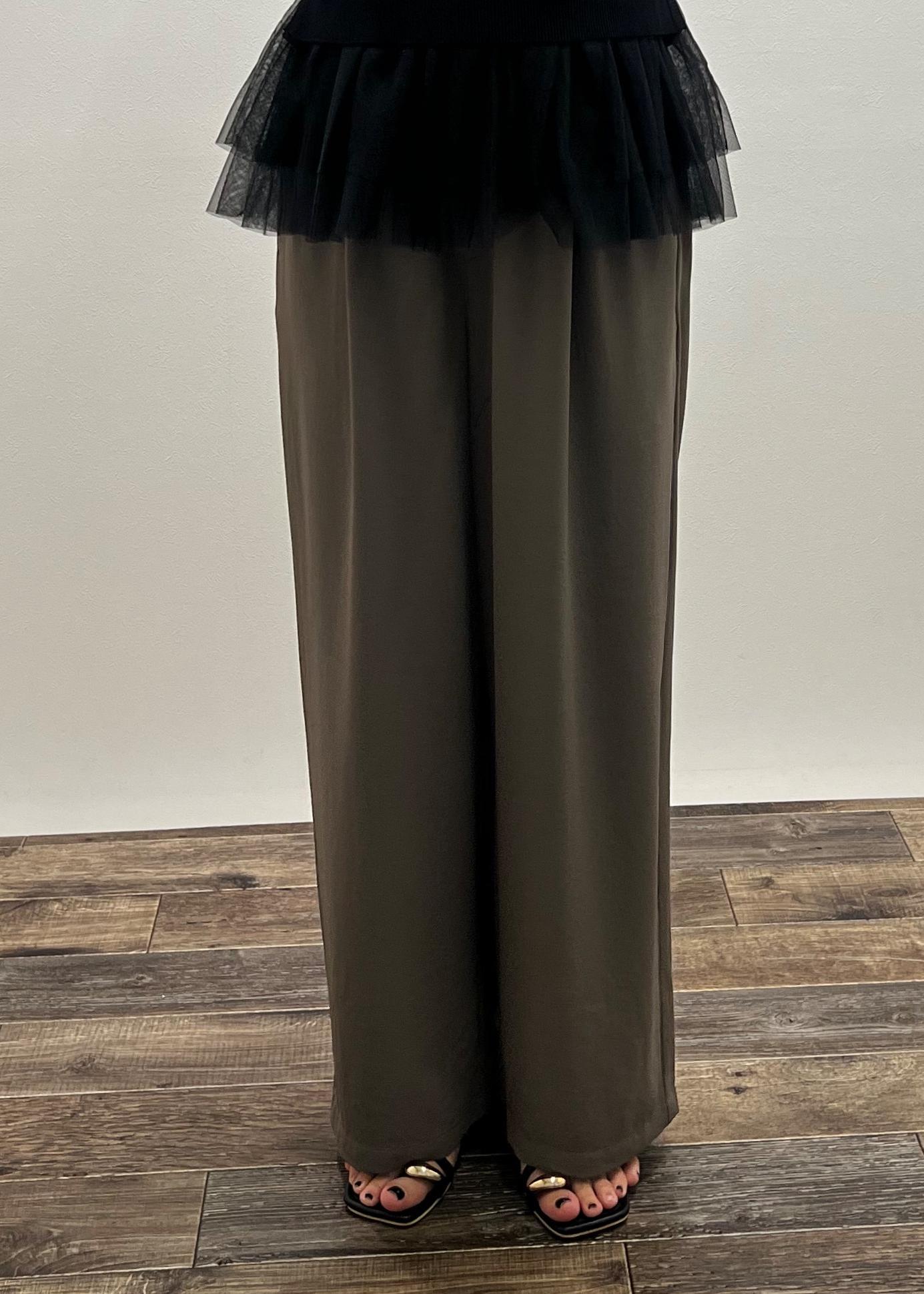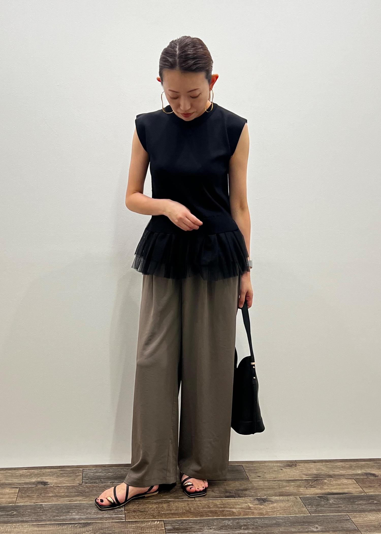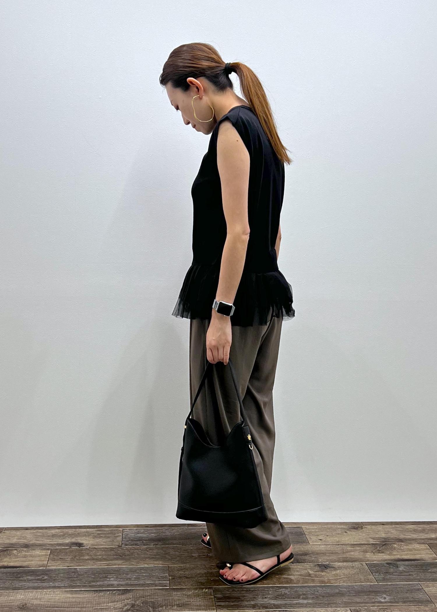 ブラック×カーキで落ち着いた雰囲気にまとめつつ、ウエストのフリルが華やかさを出してくれます。