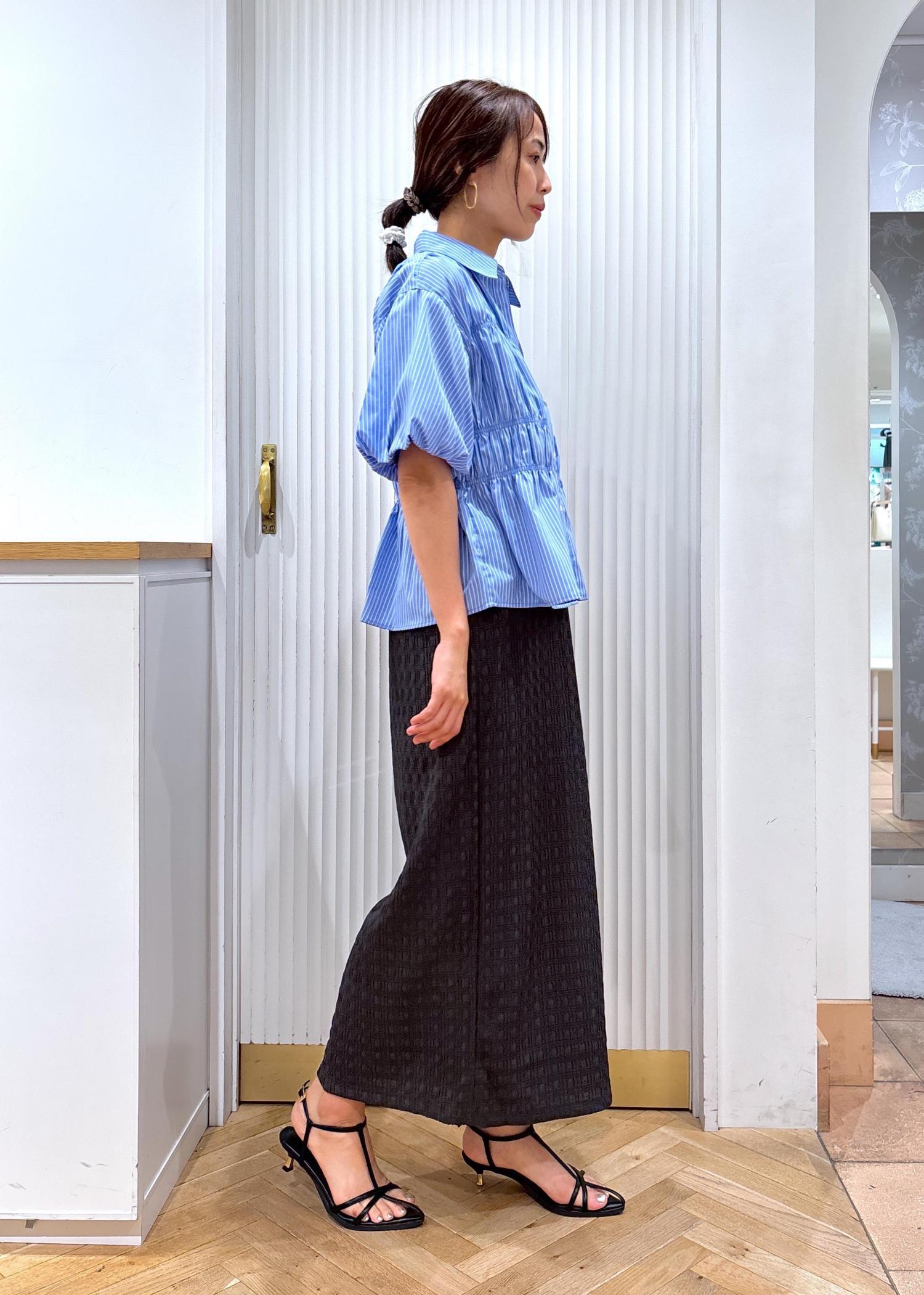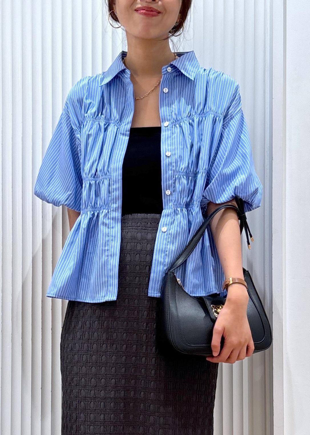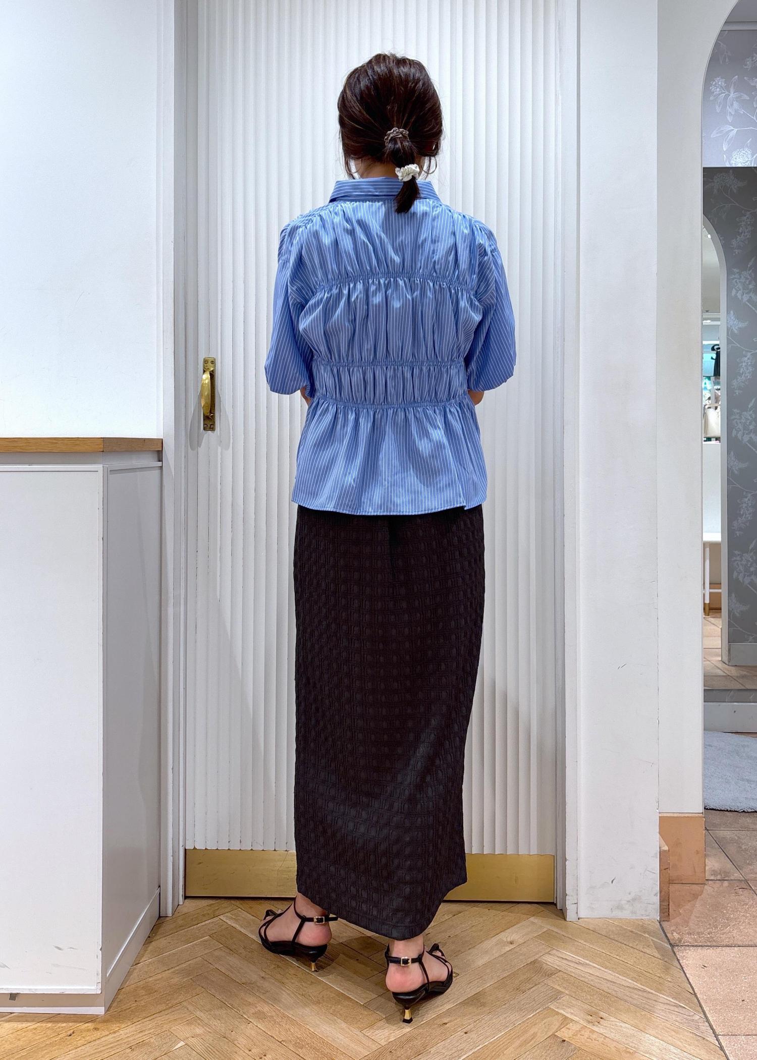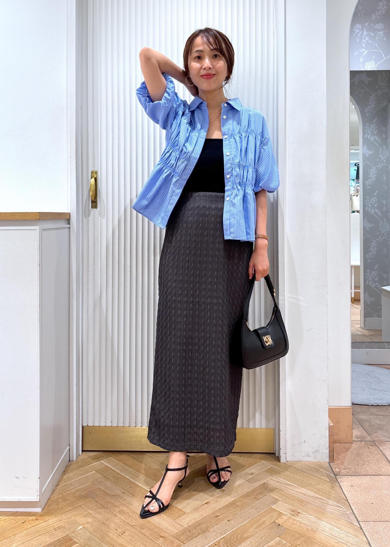 ストライプが爽やかなシャーリングシャツにタイトスカートを合わせたスタイリングです。