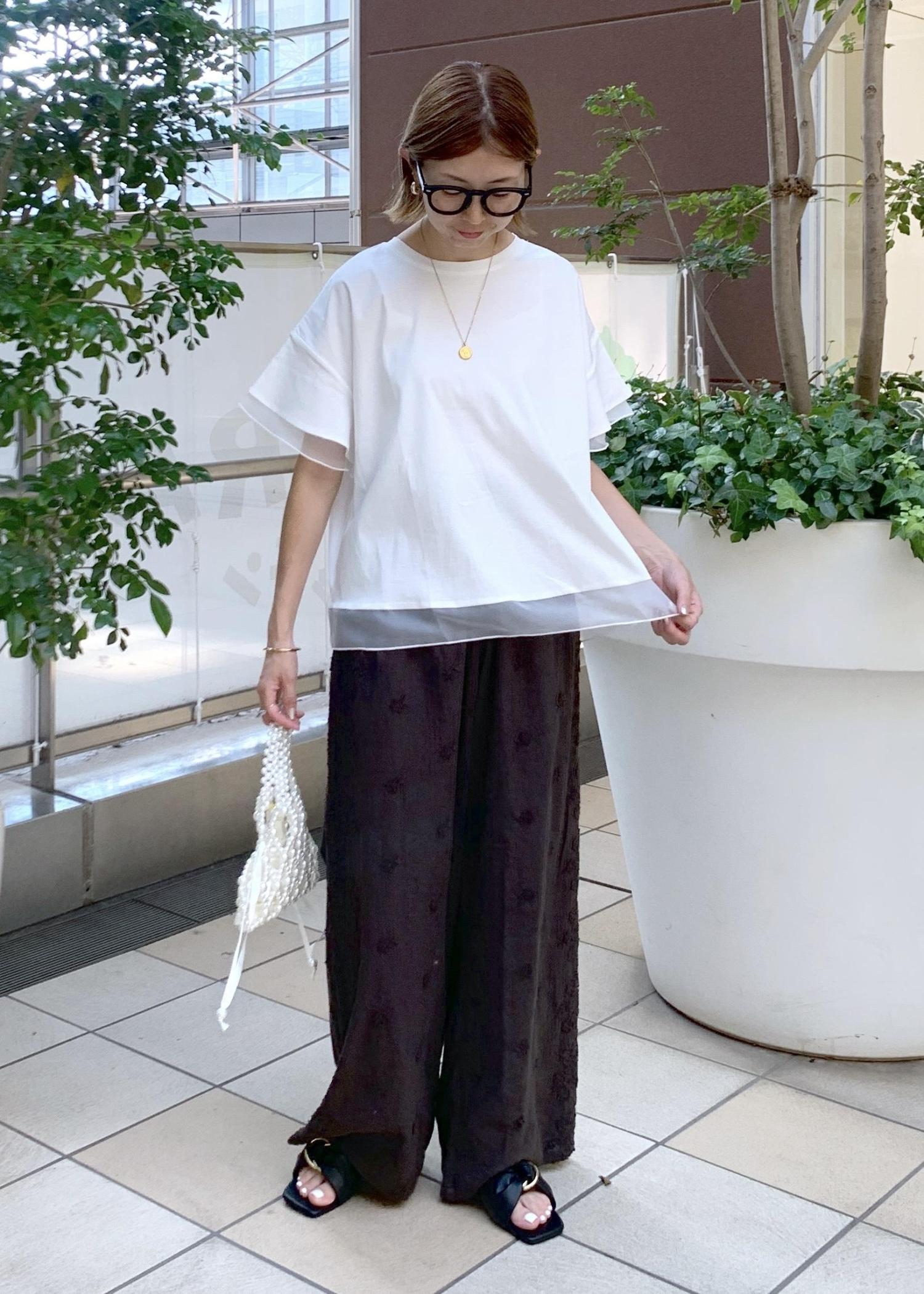 着心地のよい綿素材にシルケット加工を施し、カジュアルになり過ぎずに着られる夏トップス