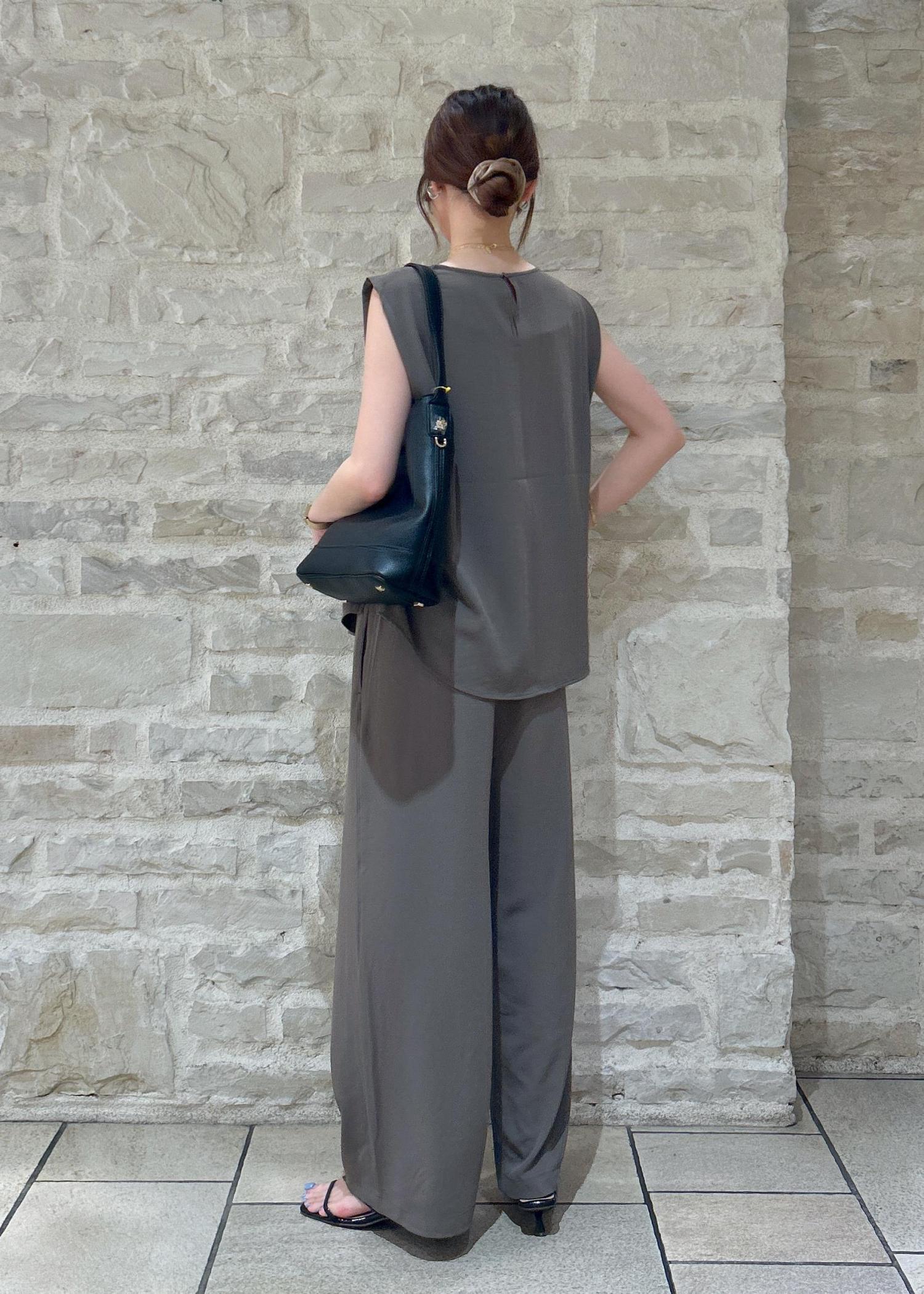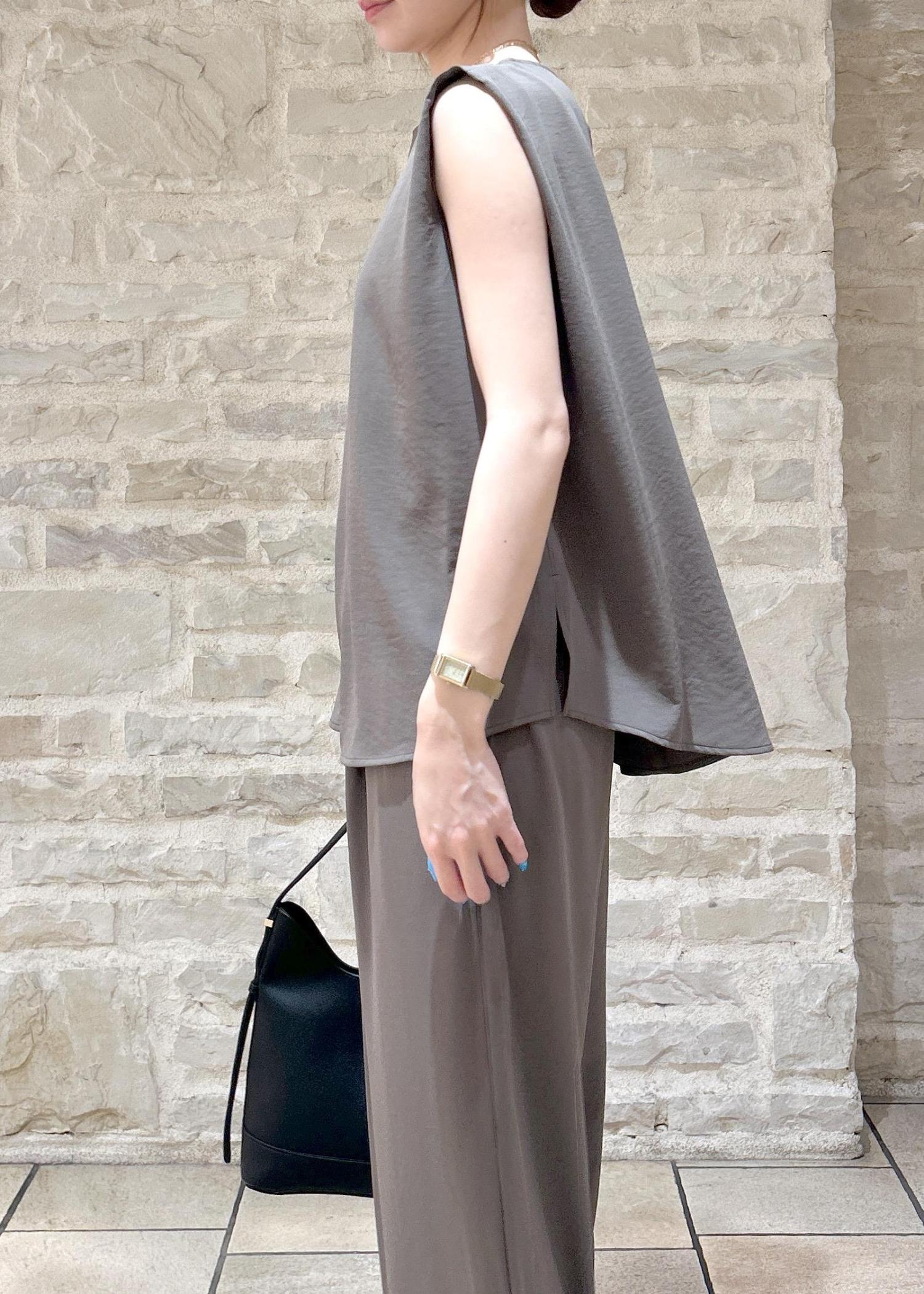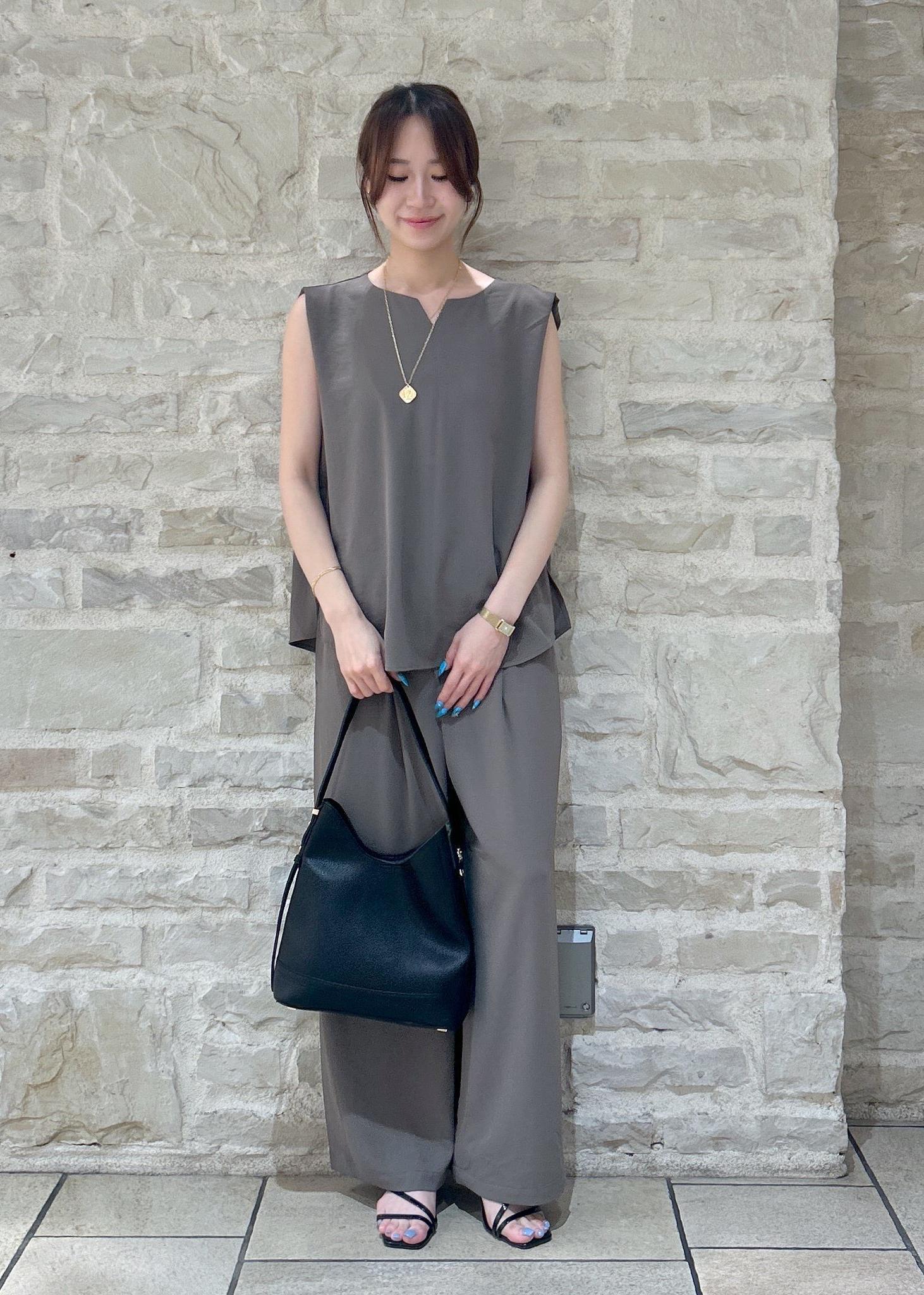 カーキの落ち着いたカラーで大人っぽいワントーンのセットアップスタイリングにしました。