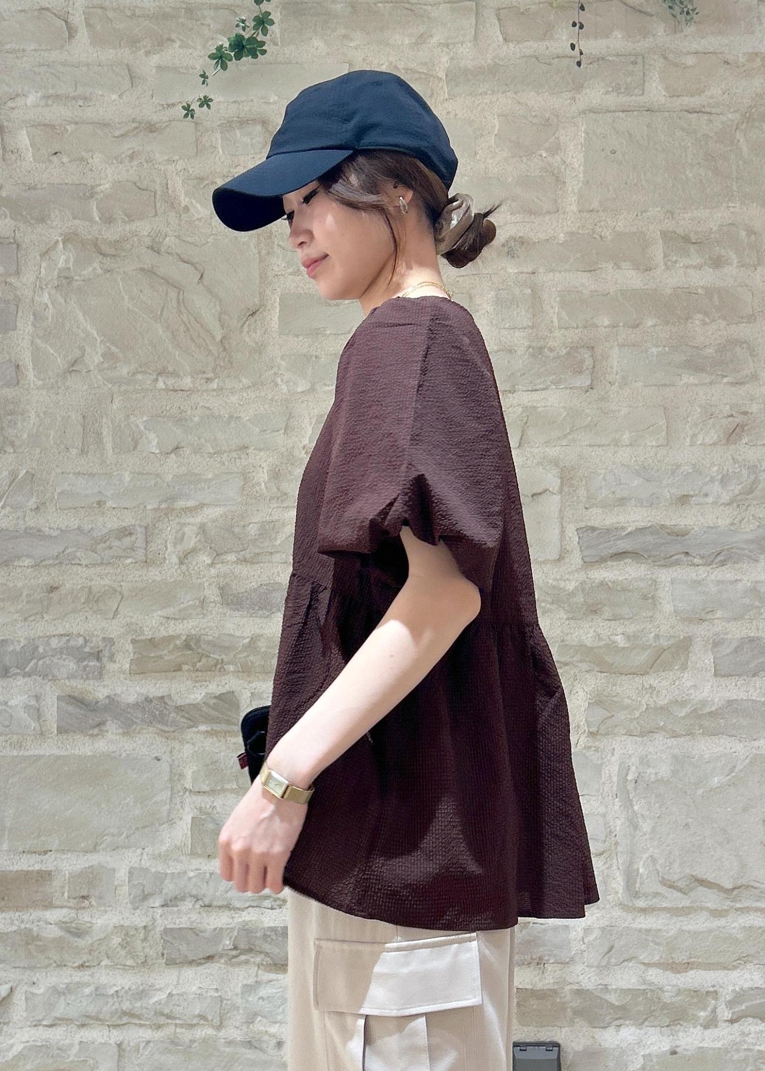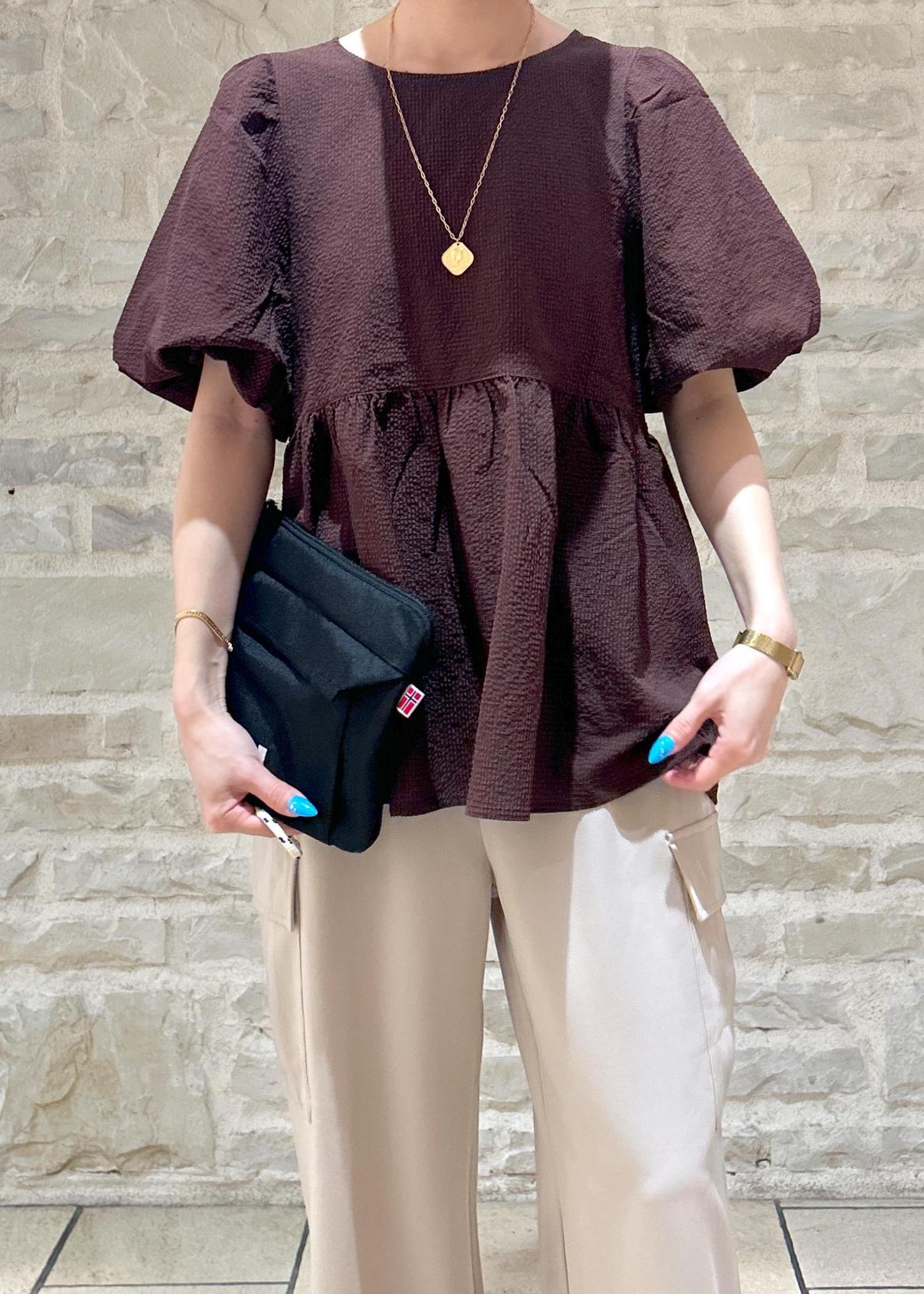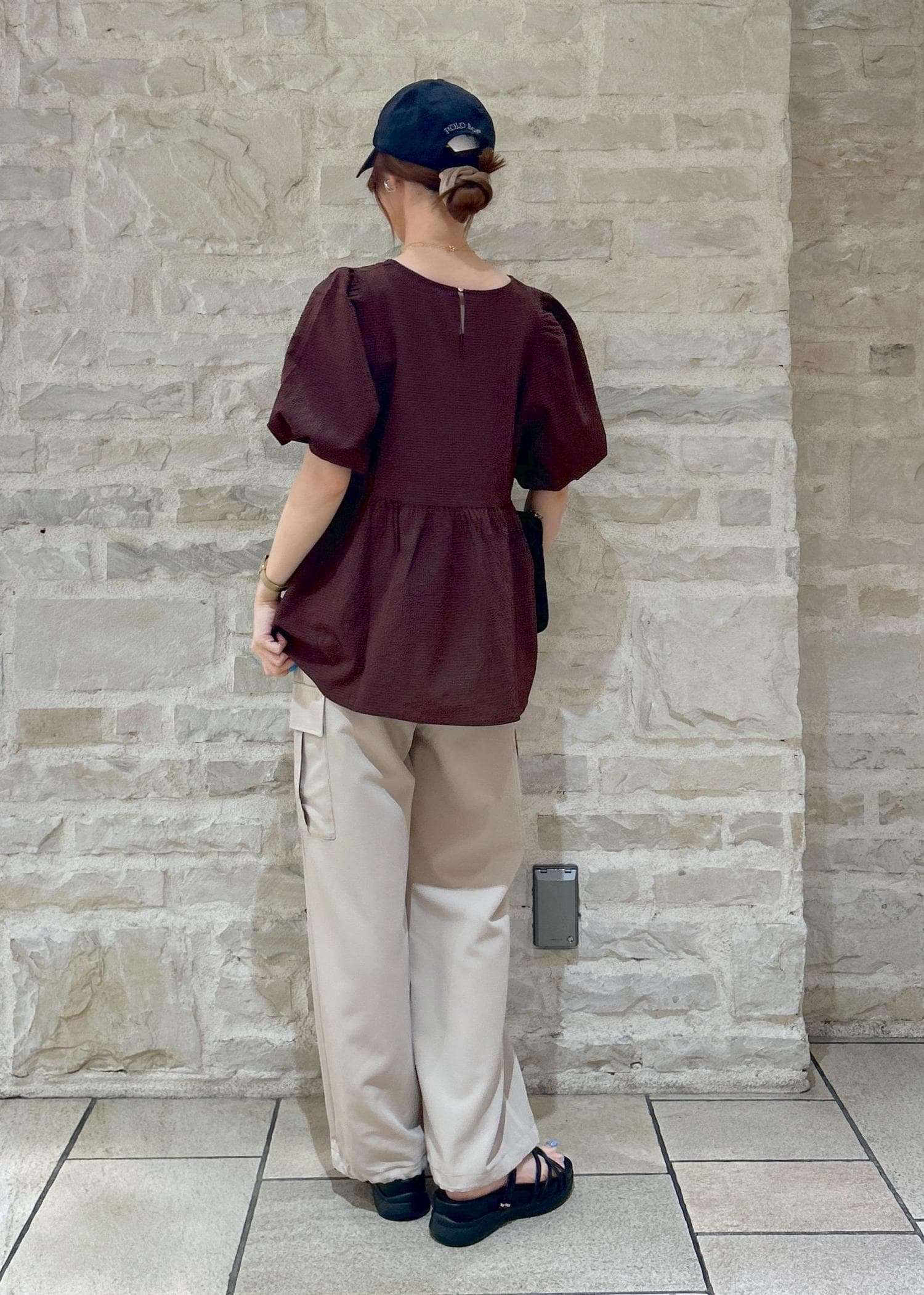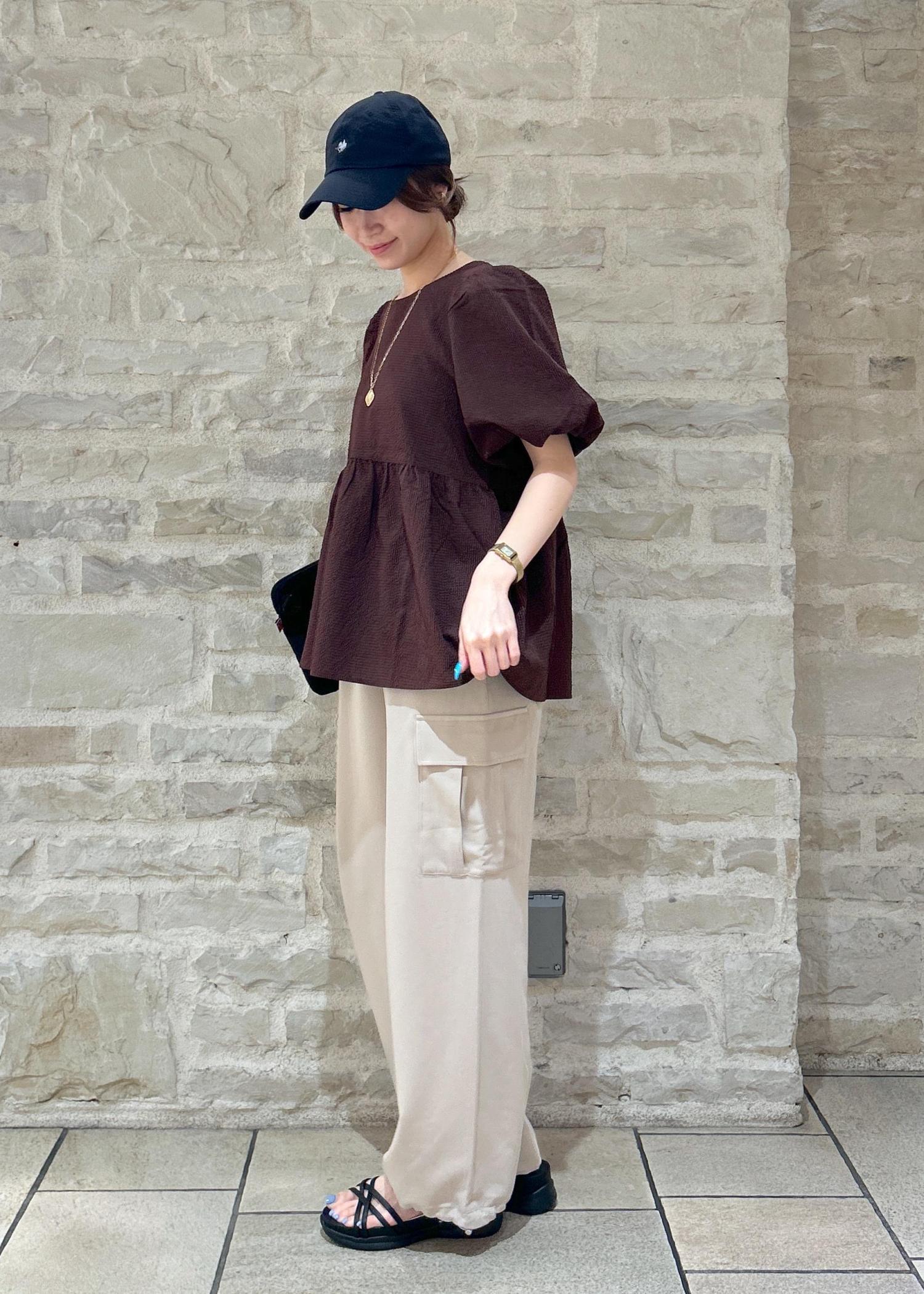 バルーンペプラムブラウスにカーゴパンツでカジュアルなアウトドアなスタイリングにしました。