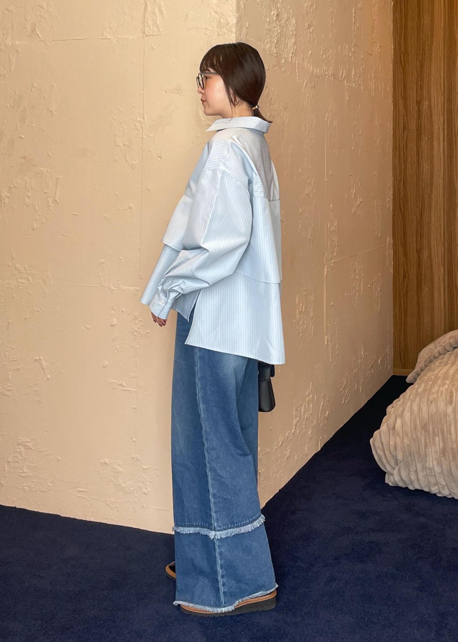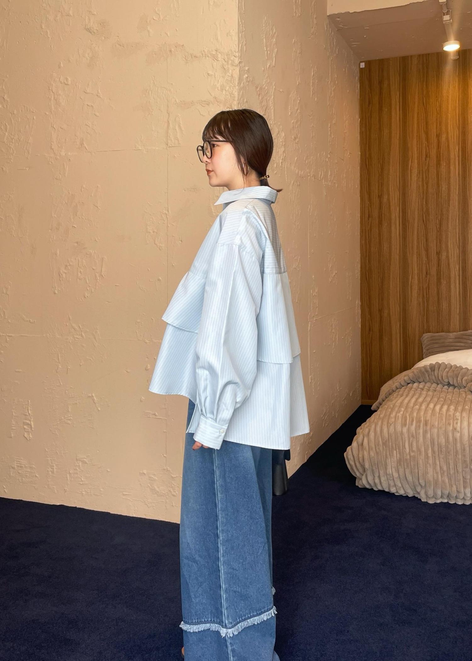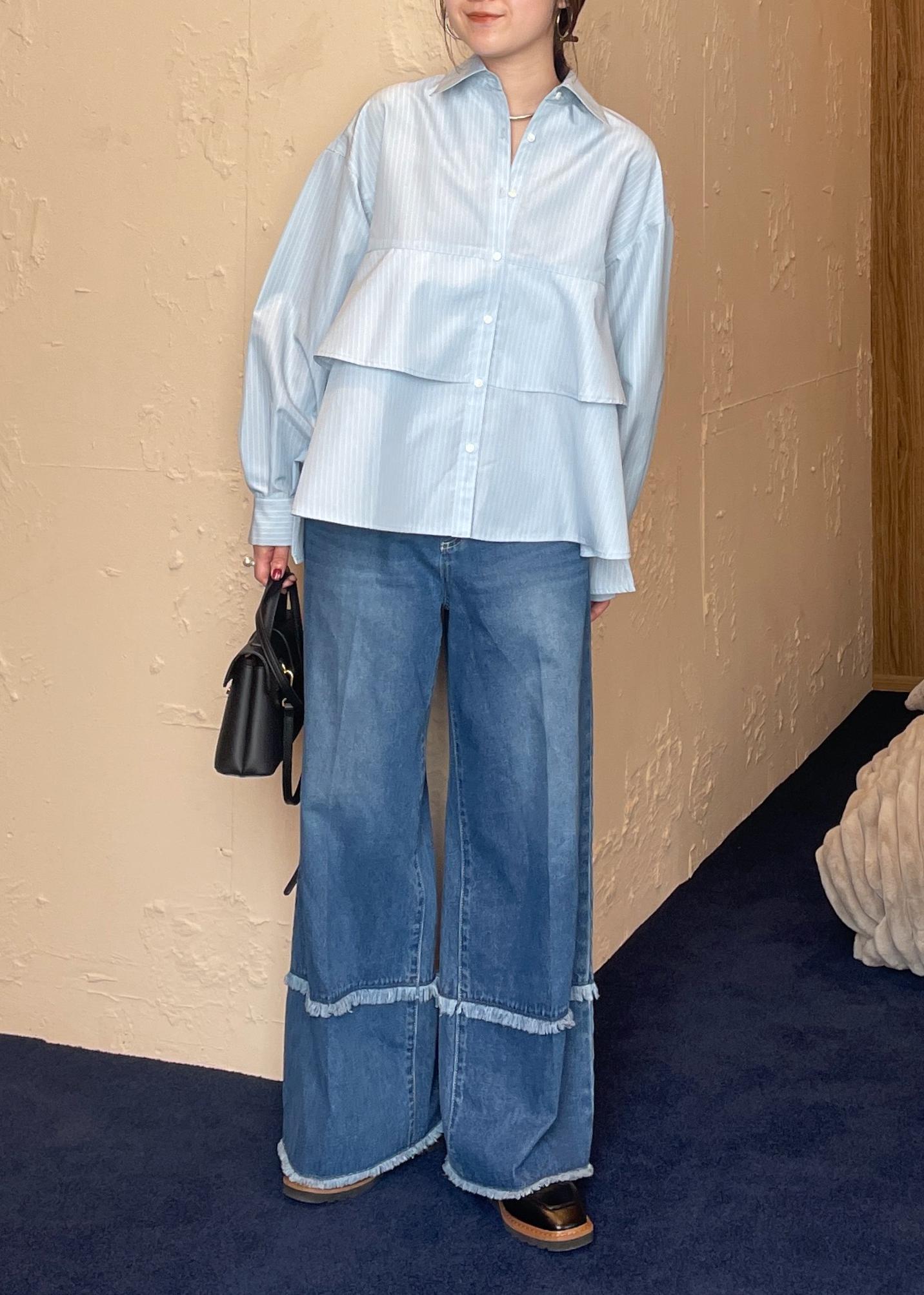 VIS裾ティアードオーバーシャツ/UVケア・イージーケアサックス / F¥2,965レビュー1枚で着映えするボリュームシャツ♡ふわっと広がるティアードデザイン、ゆるっと今年らしいシルエットで着て頂けます。身長159cmでヒップが隠れる着丈、前後差があるので膨張して見えず◎釦を1.2個開けてデコルテ見せすると、よりスッキリ見えが狙えます!