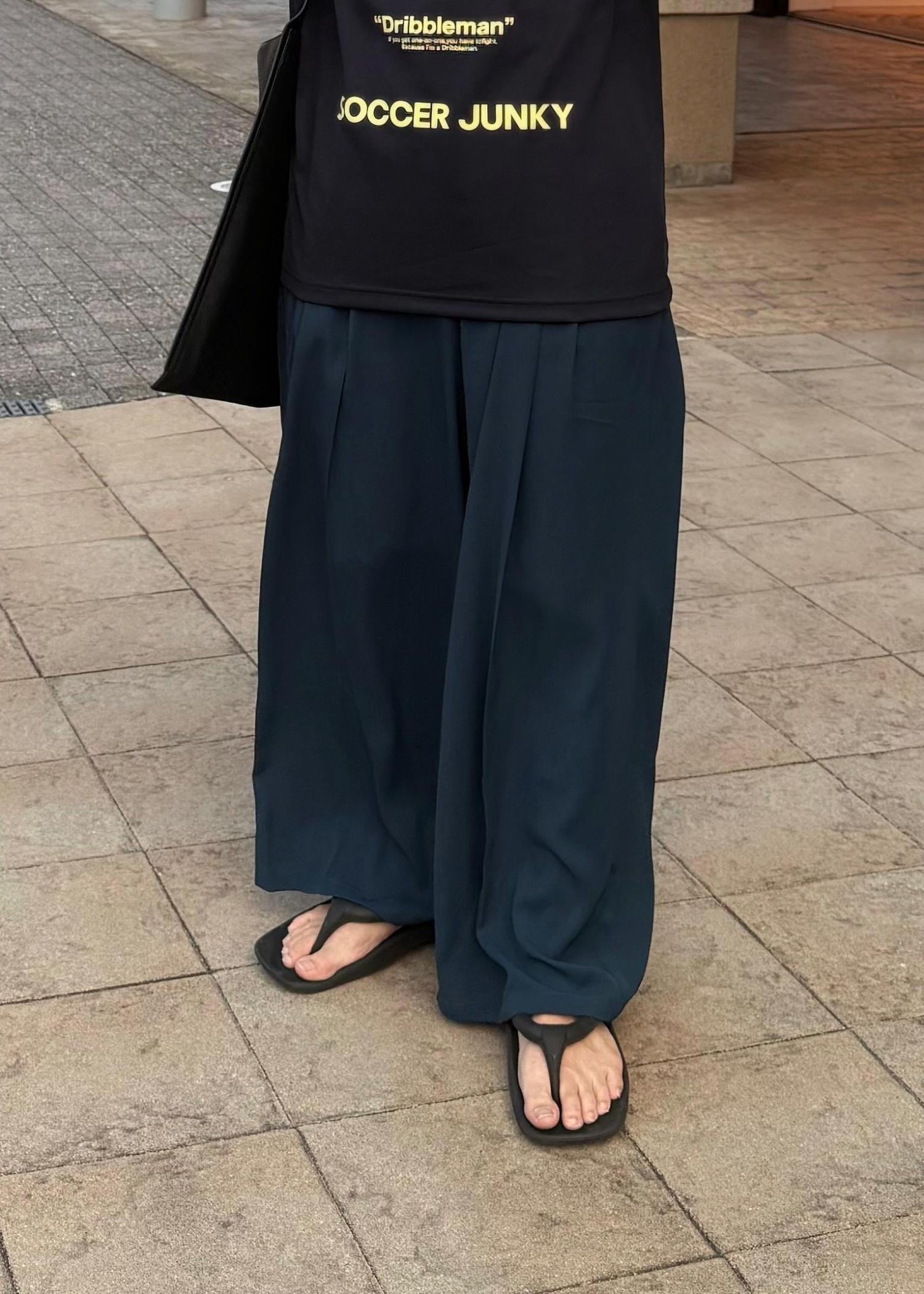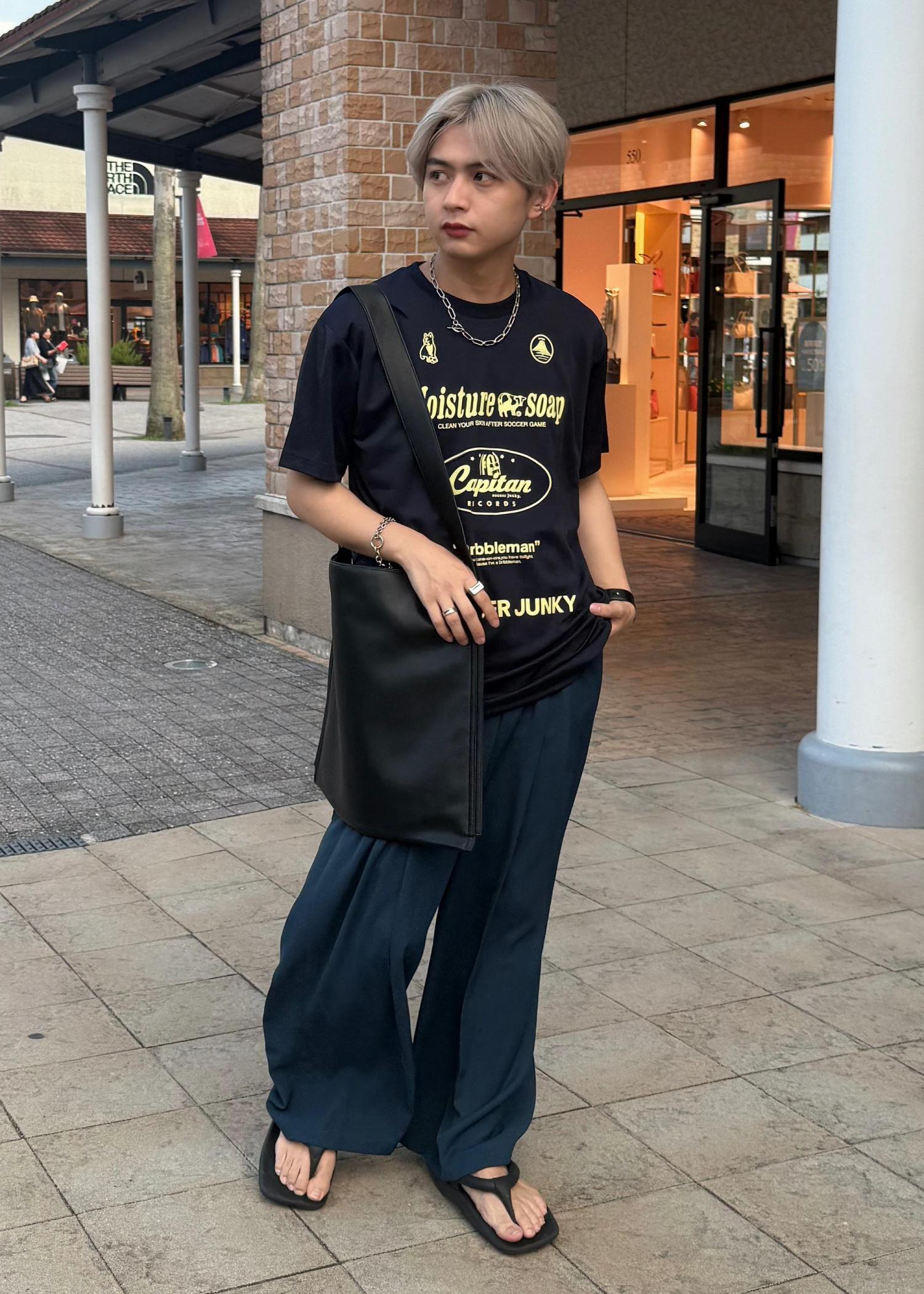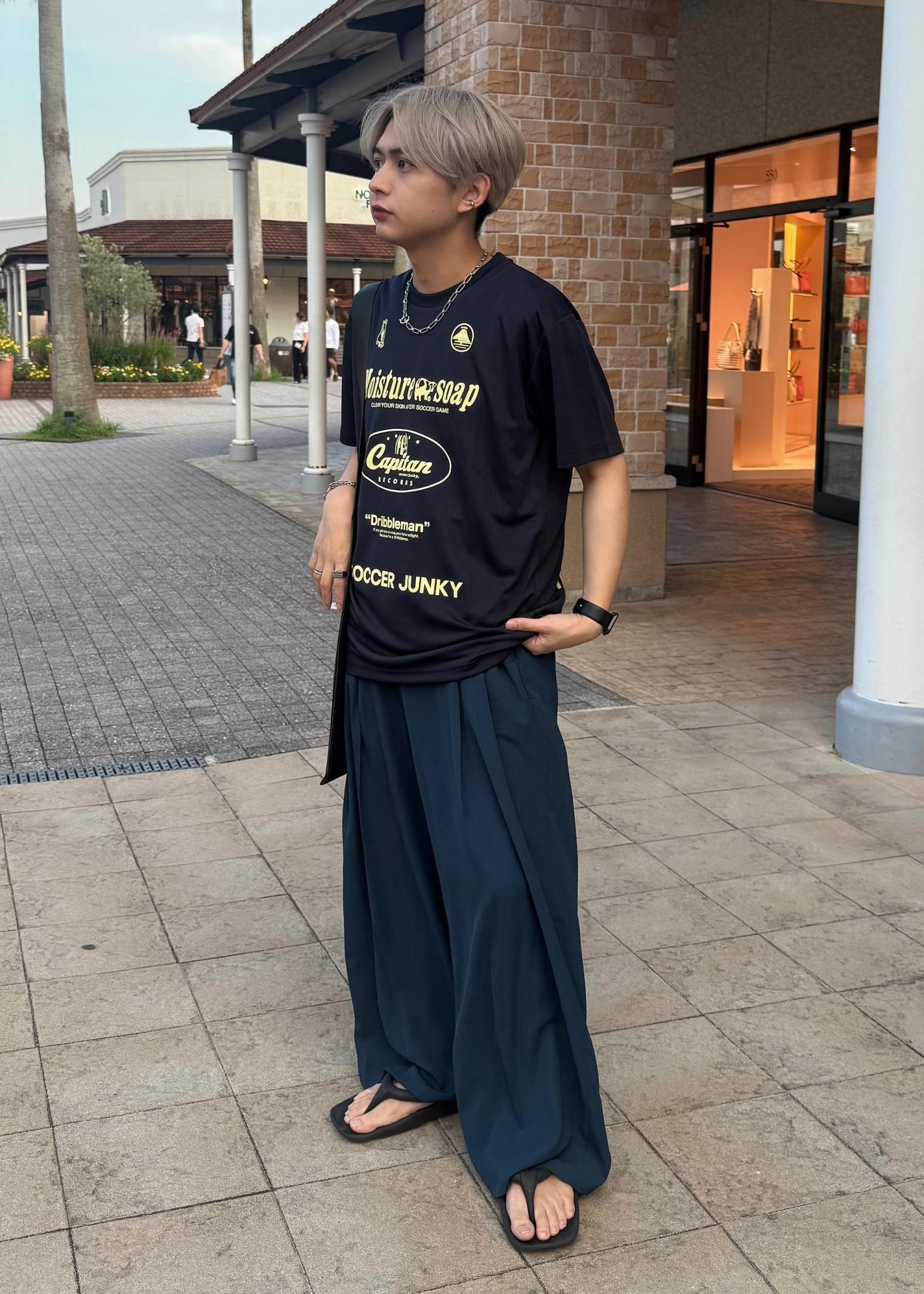 今回はMOISTURE SOAP ワークアウトTEE を使ったスタイリングです。スポーティーなTシャツを太めのスラックスと合わせてゲームシャツ風にスタイリングしてみました!