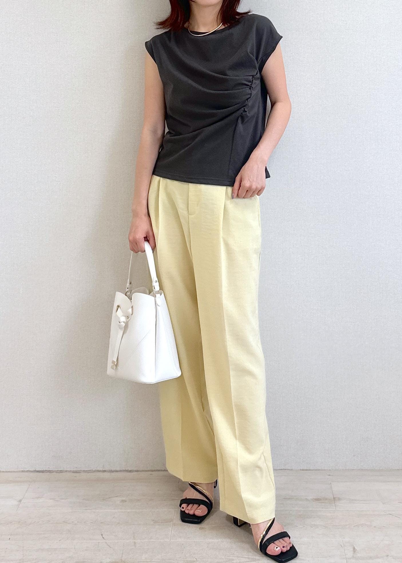 VIS【美easy】ワンタックワイドスラックスパンツ/洗えるイエロー系 / M¥5,489レビュー162cmでMサイズを着用しており、踵が見えるぐらいの長さです。ハイウエストでスッキリ見えのワイドパンツ。さらっとした素材でシワにもなりにくいのでお手入れも楽ちんです♪