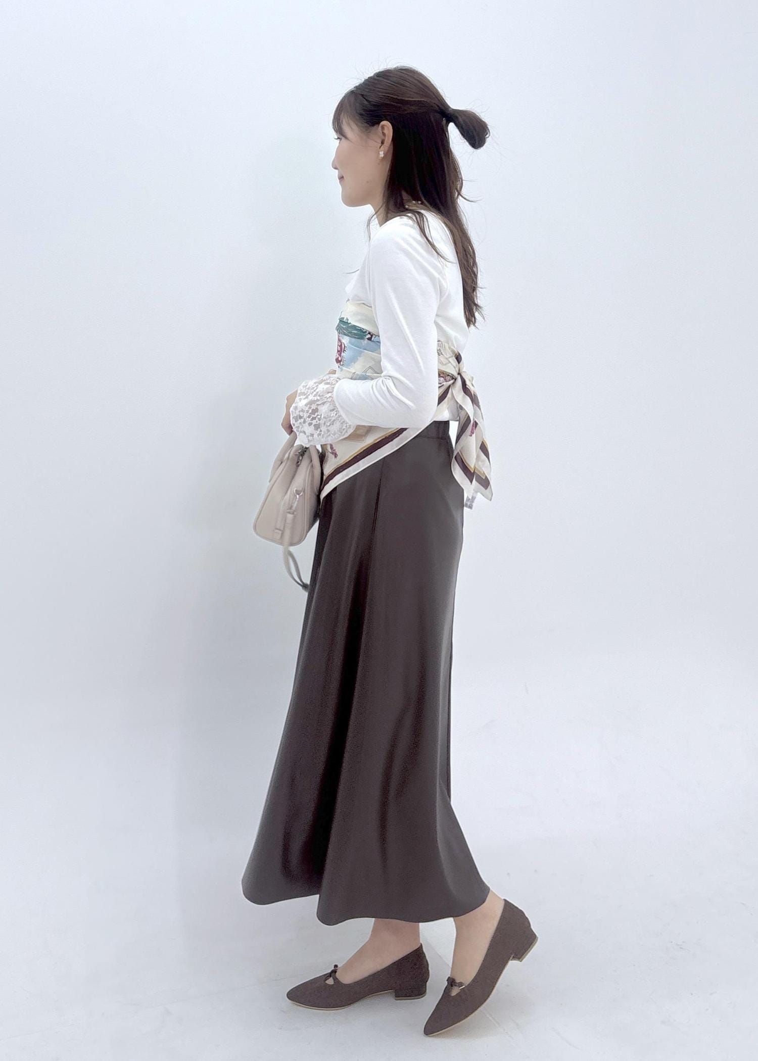 ブラウン×アイボリーでトレンドと、秋っぽいコーディネートです◎スカーフは大判でアレンジがしやすいです◎