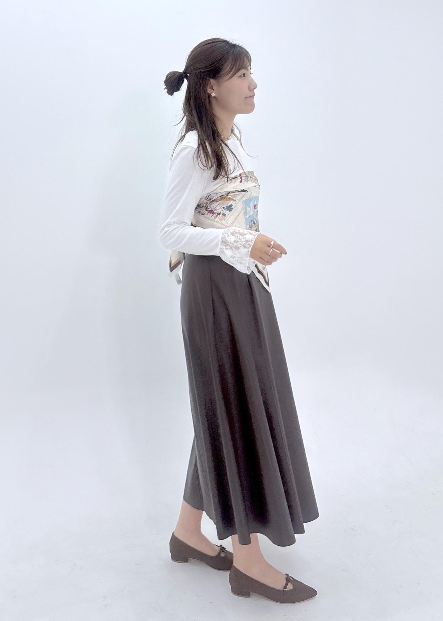 ROPÉ PICNICシンセティックレザーフレアロングスカートダークブラウン / M¥4,994レビューシンセティックレザーで柔らかく程よい張りのある素材感です。ふくらはぎにかかる裾丈です。お腹周りもゆとりがあり、ウエストも後ろゴムなので楽に着用いただけます。