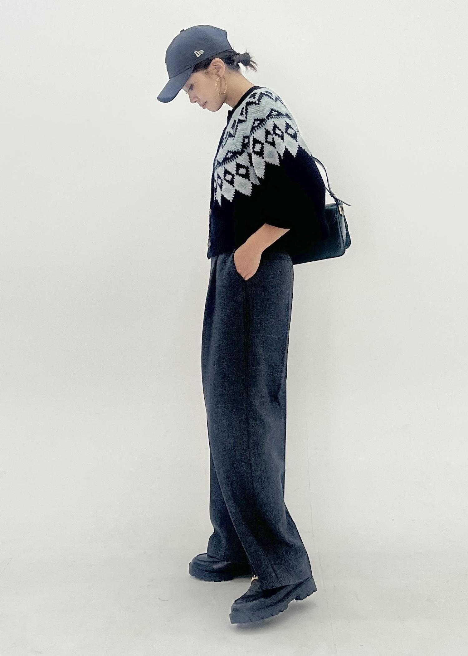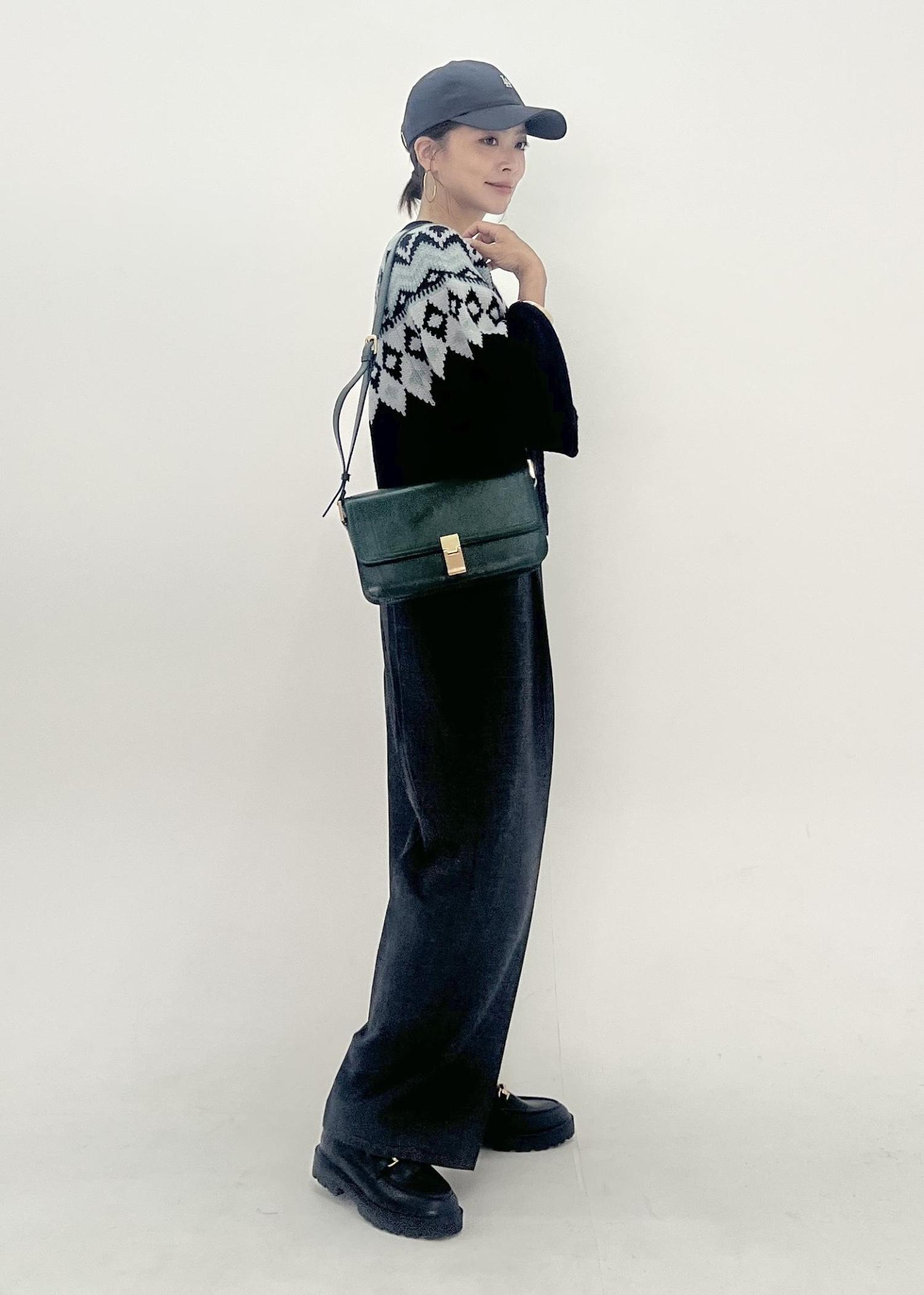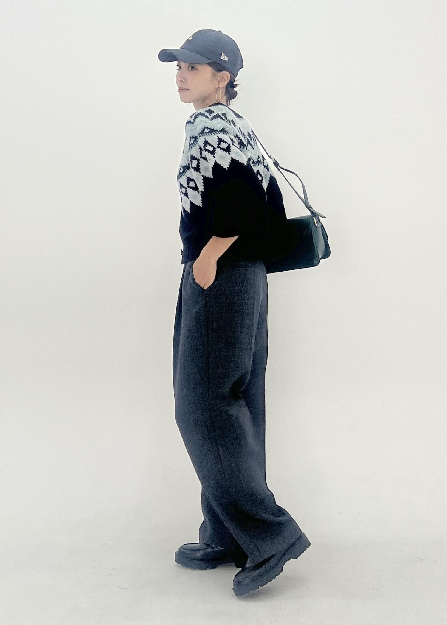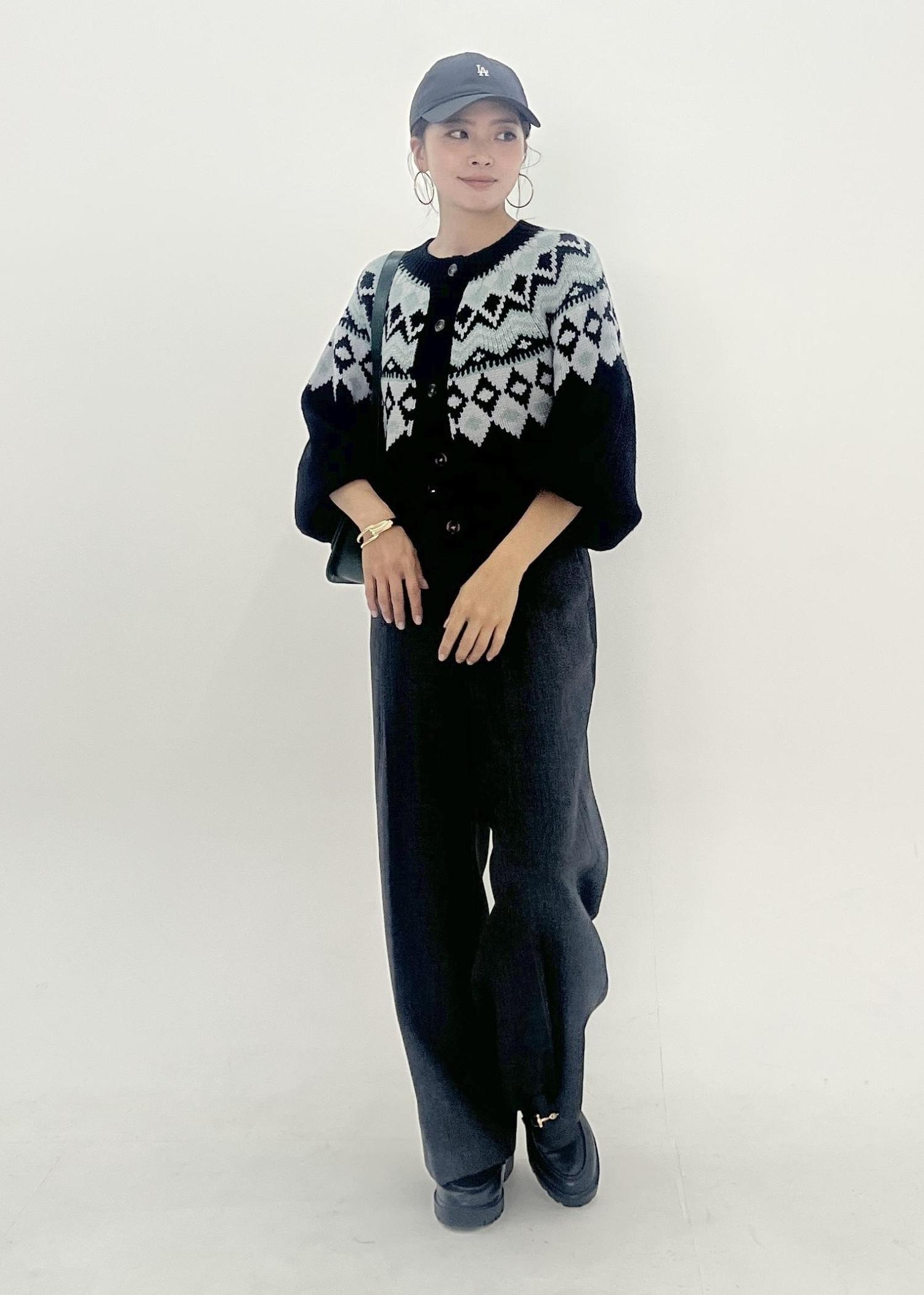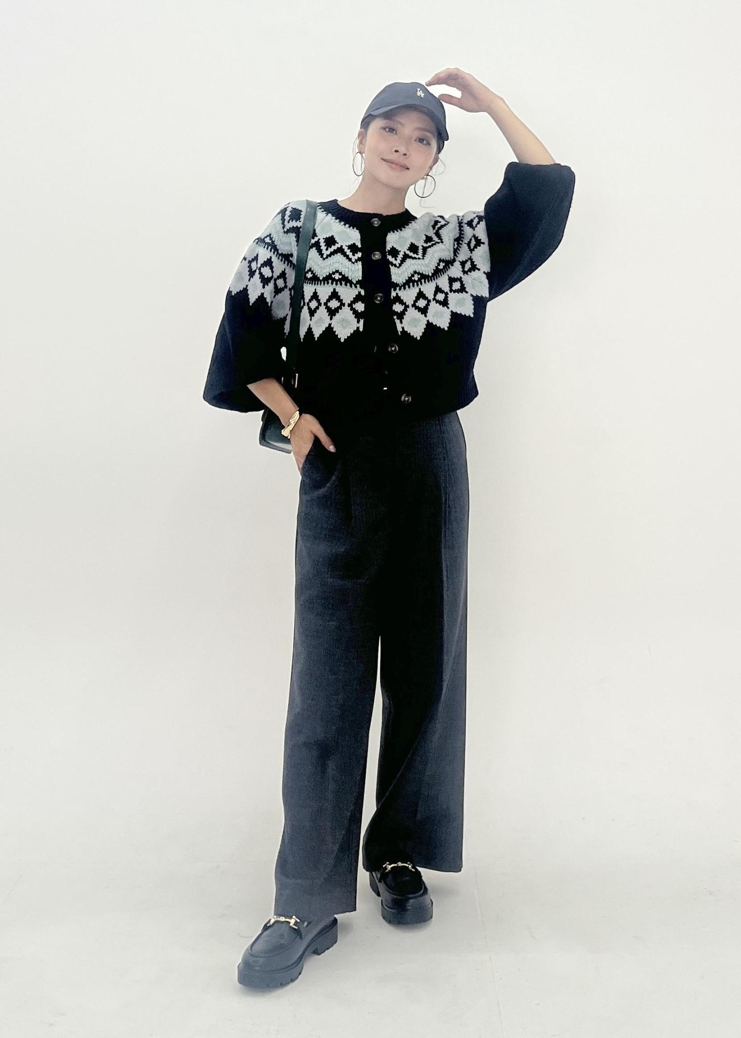 可愛い印象のある柄なのであえてメンズライクな着こなしで、秋冬の大人カジュアルなスタイリングにしました。