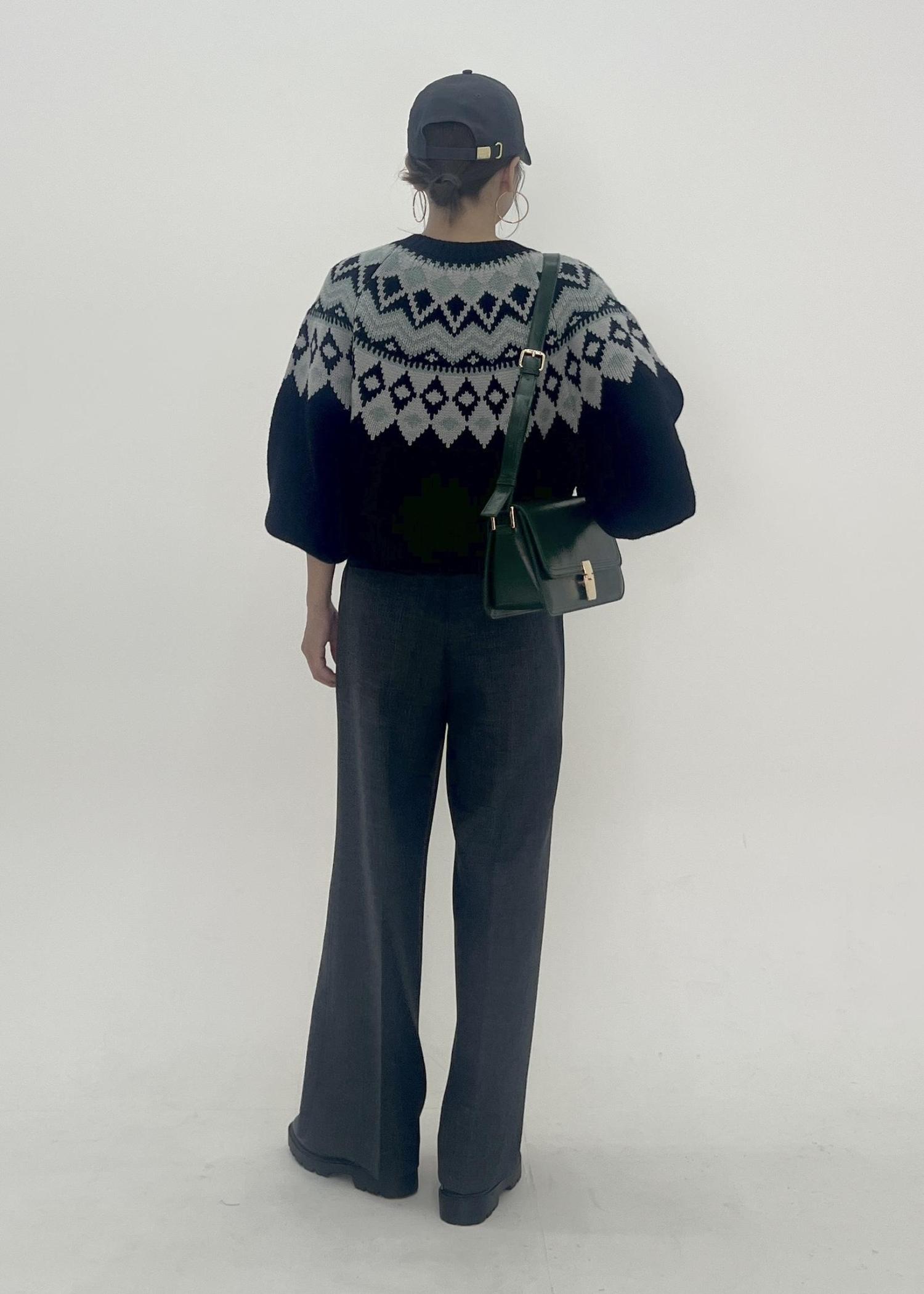 秋冬らしいついドーパンツを合わせて、グリーンのバッグを持つのがポイントです◎。