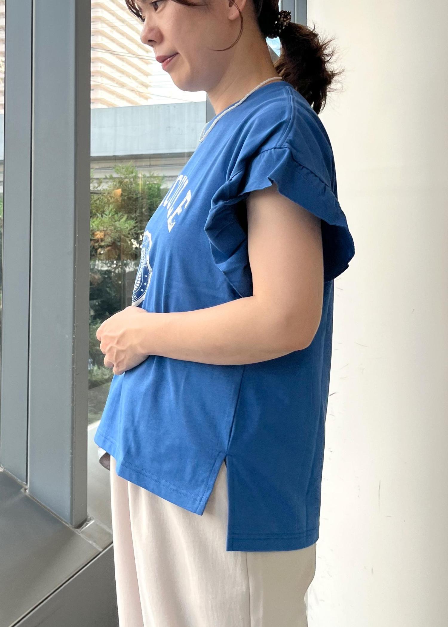 綿混の肌触りの良い生地感、袖のフリルデザインがかわいいカレッジTシャツです! -