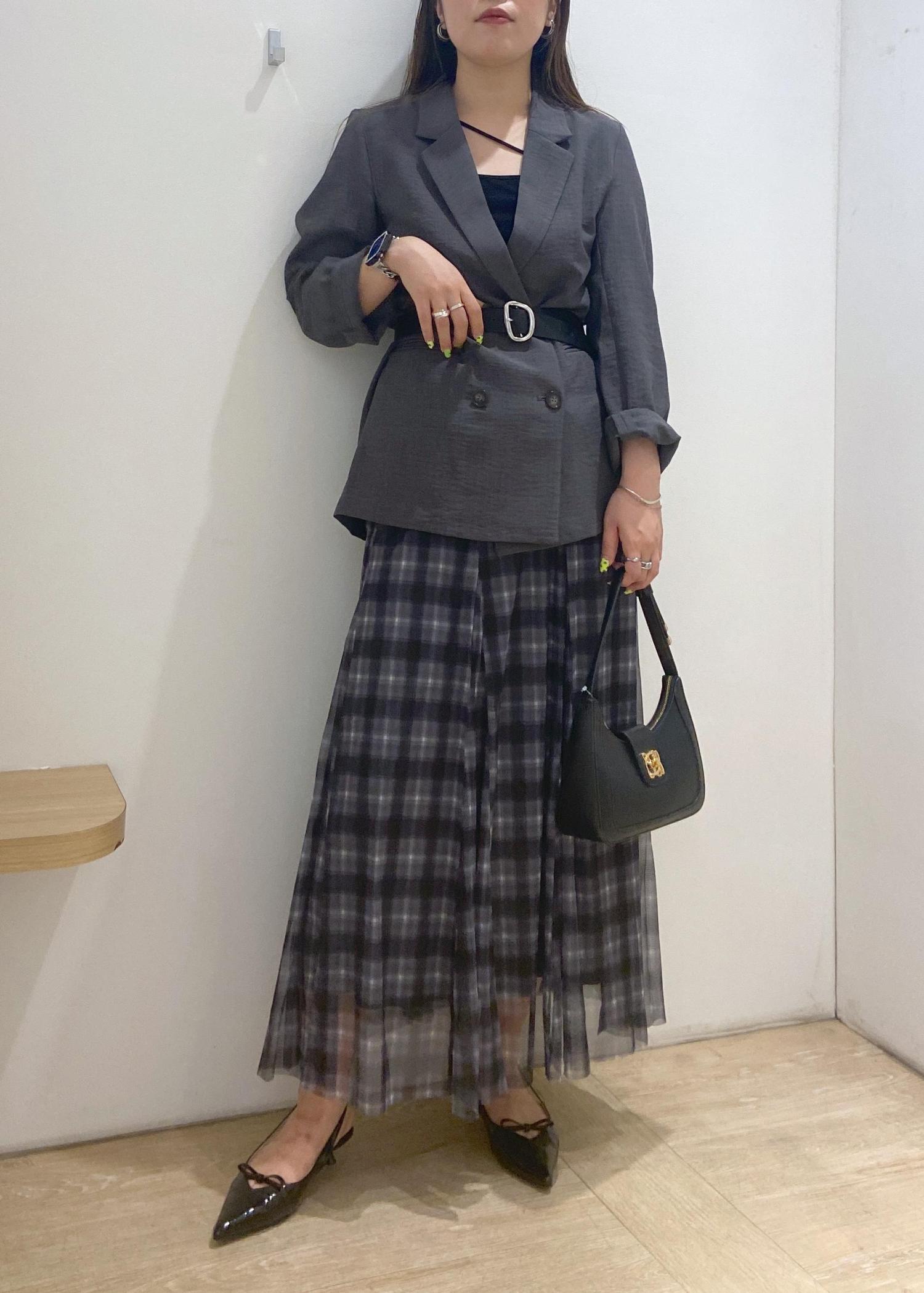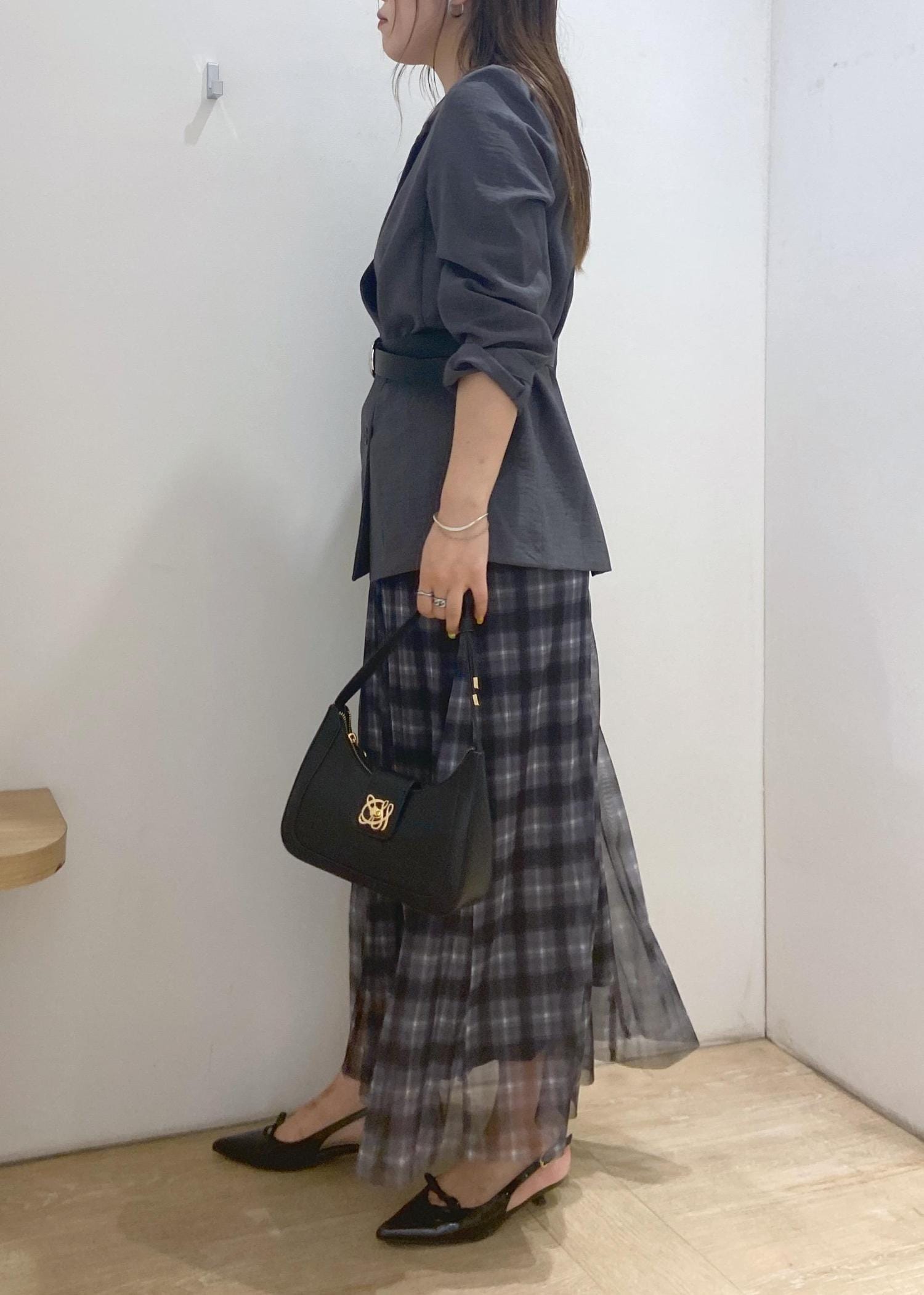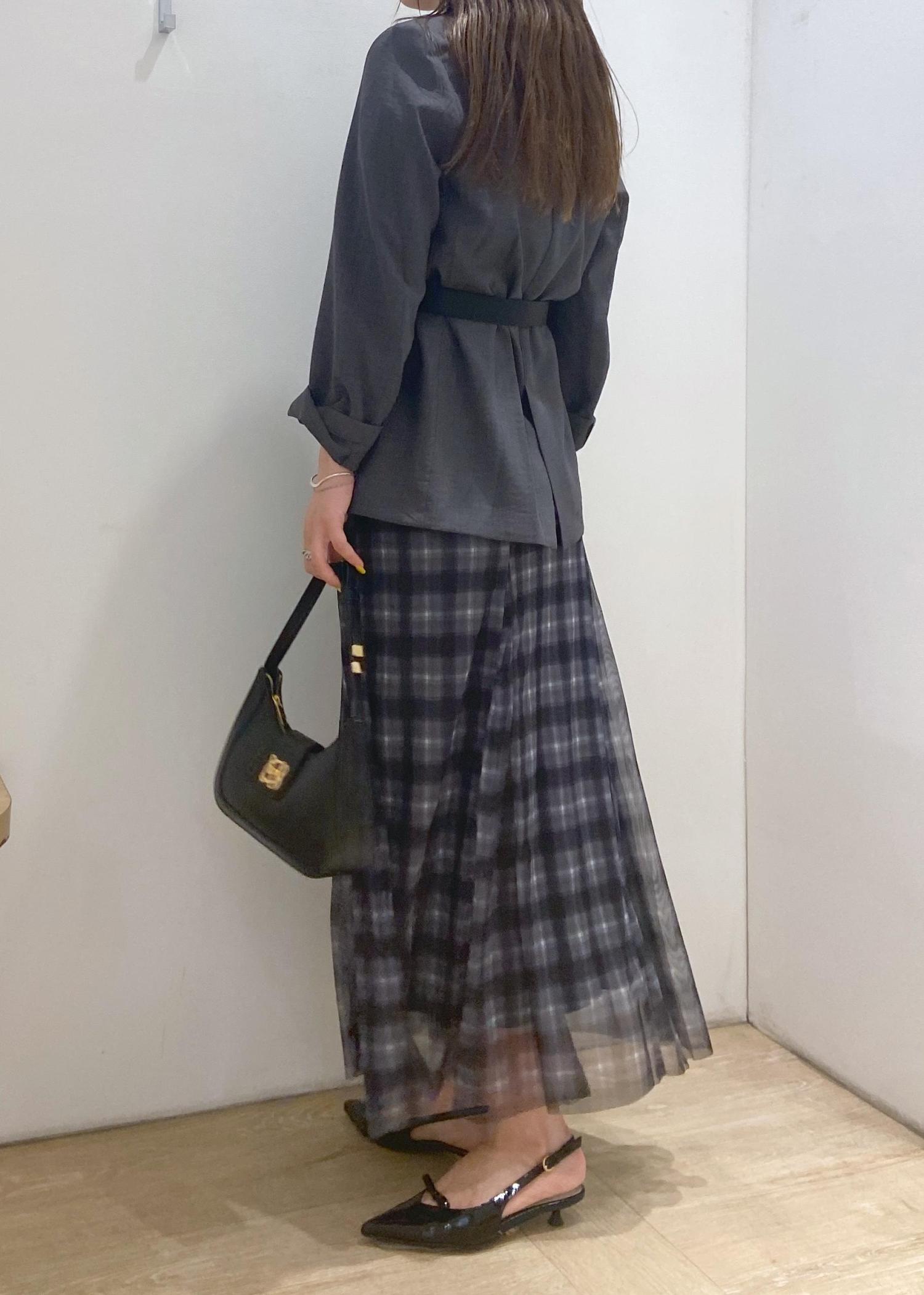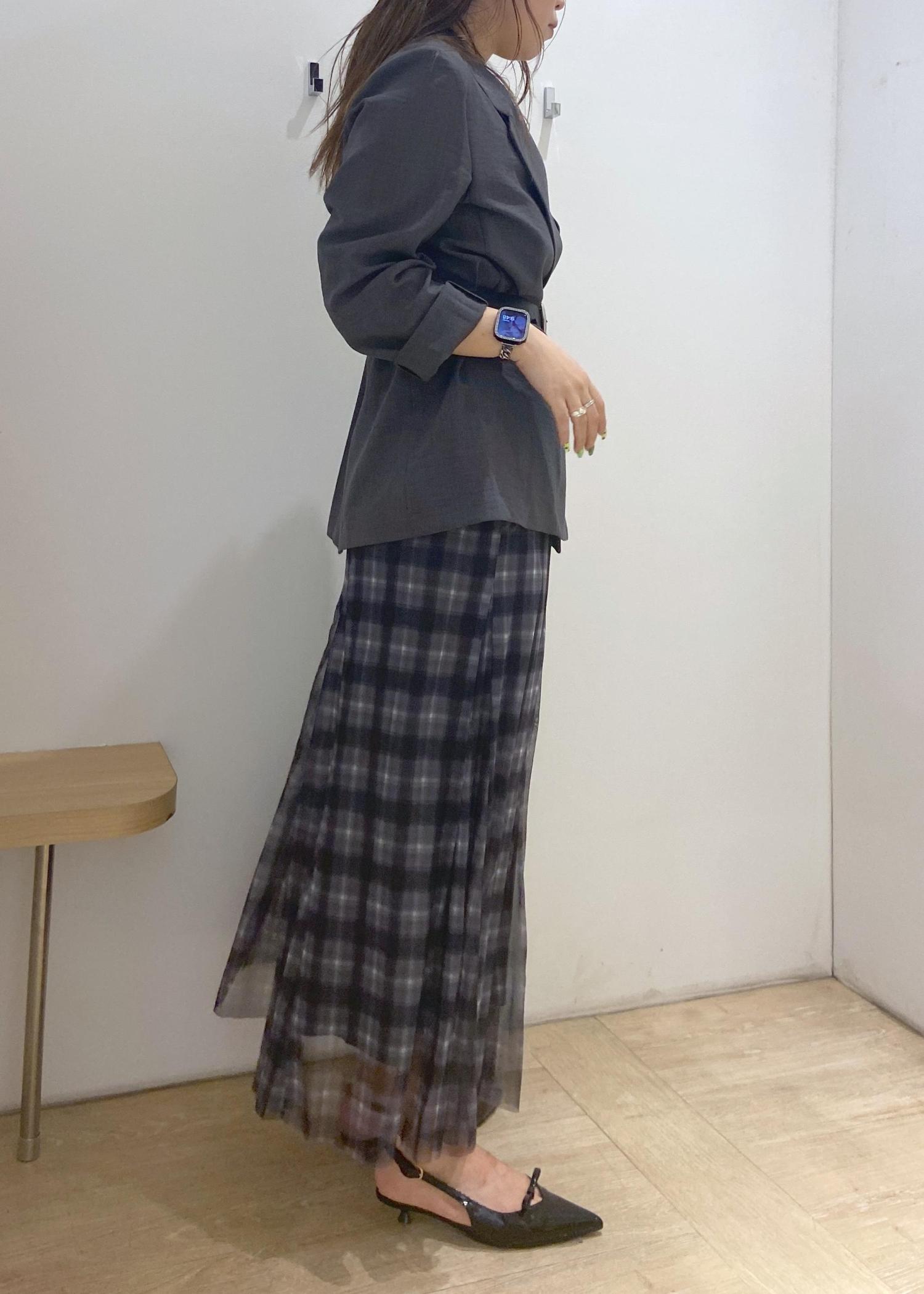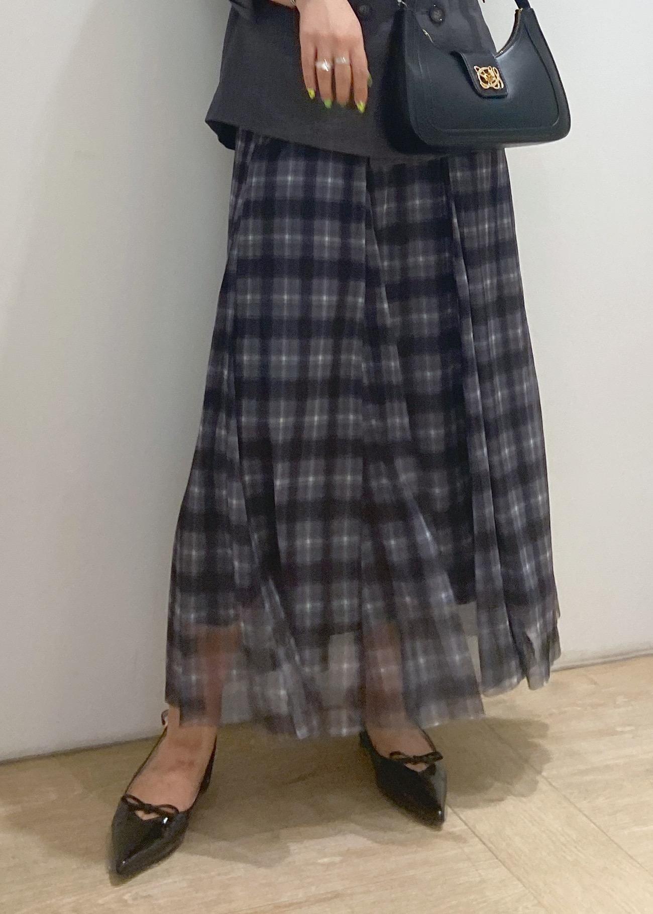 VIS【洗える】チュールプリントチェックスカートブラック系 / F¥4,612レビュー後ろがゴム仕様でとても軽い着心地のスカートです。