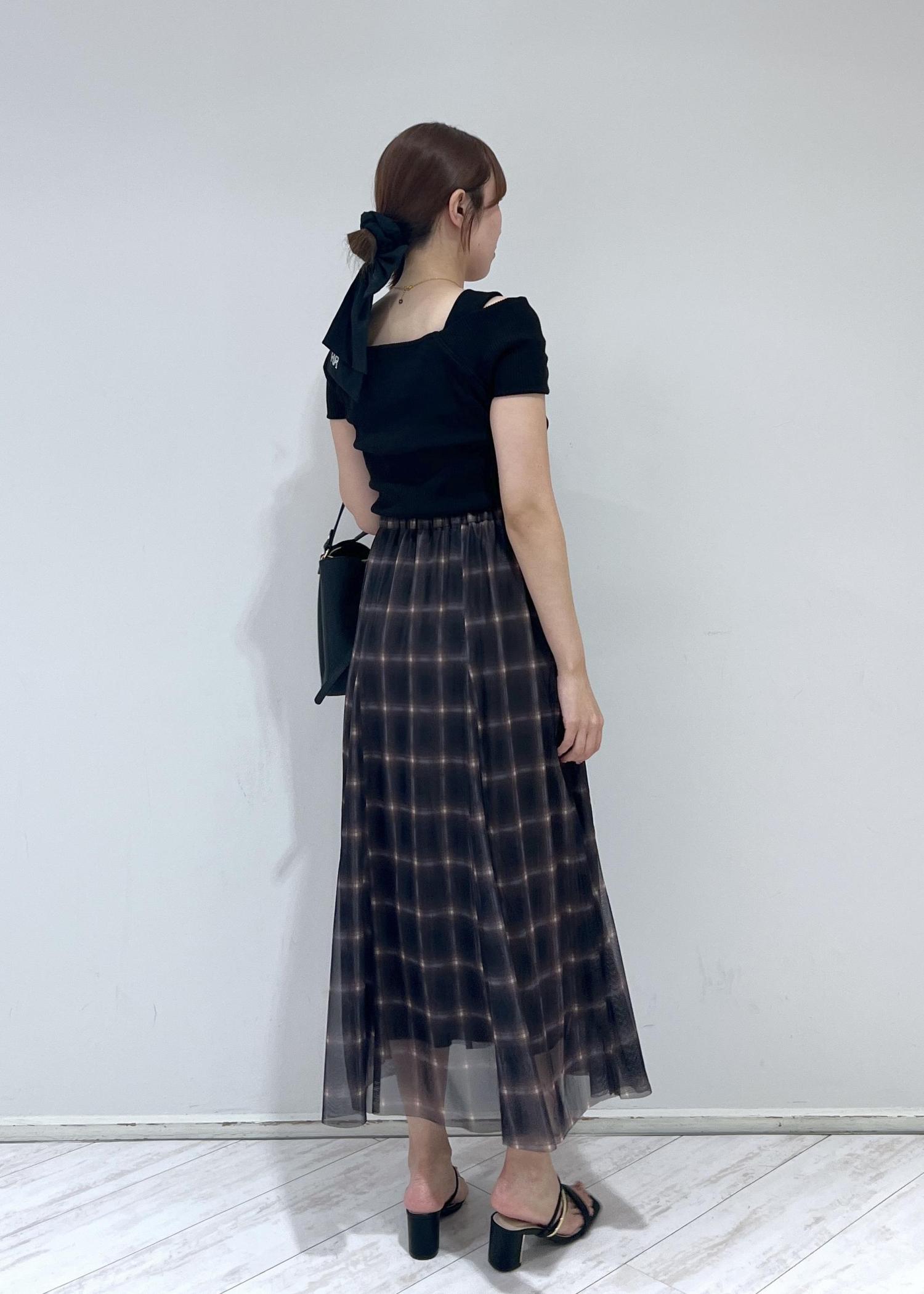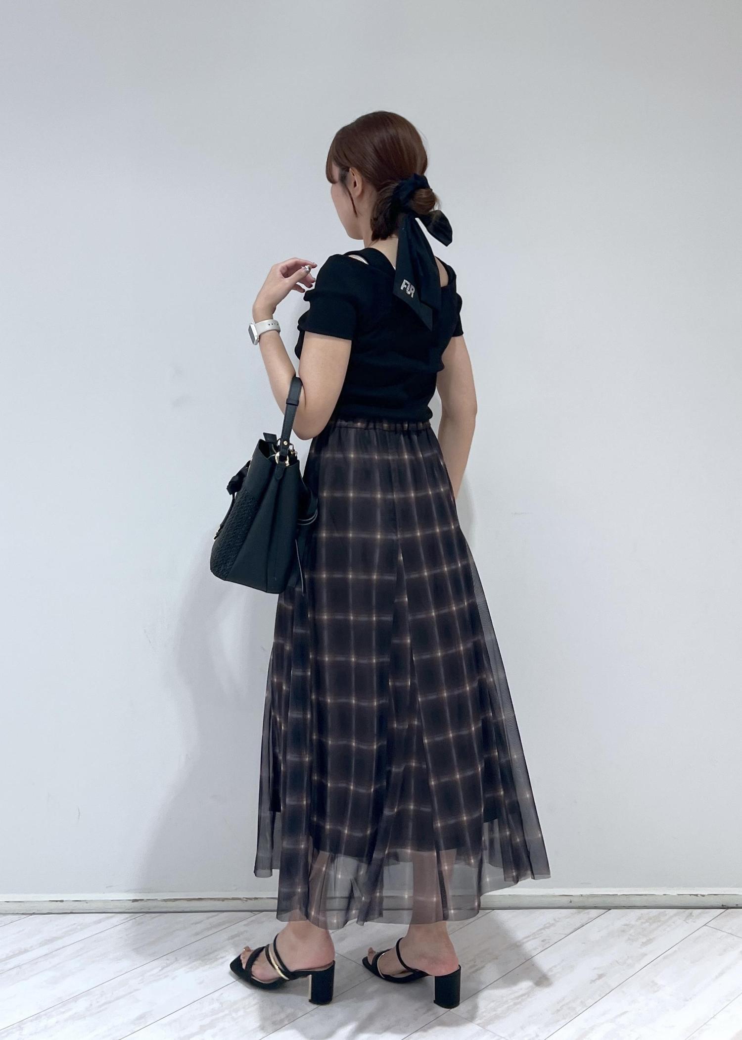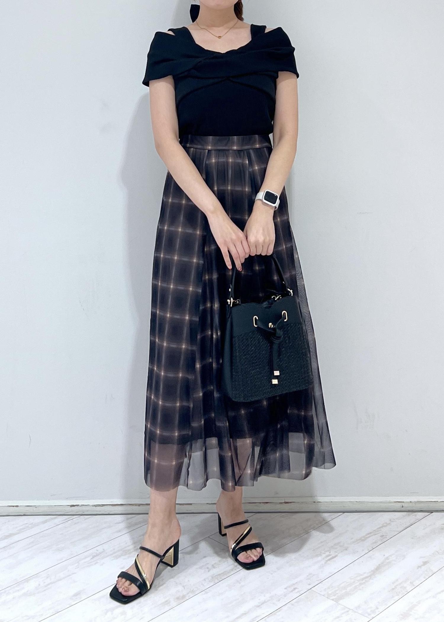 VIS【洗える】チュールプリントチェックスカートダークブラウン系 / F¥4,612レビューウエストの後ろはゴムなので着心地が楽です◎生地感は薄手なので秋口も着回せます。身長164cmで、着丈はくるぶしの少し上でした!