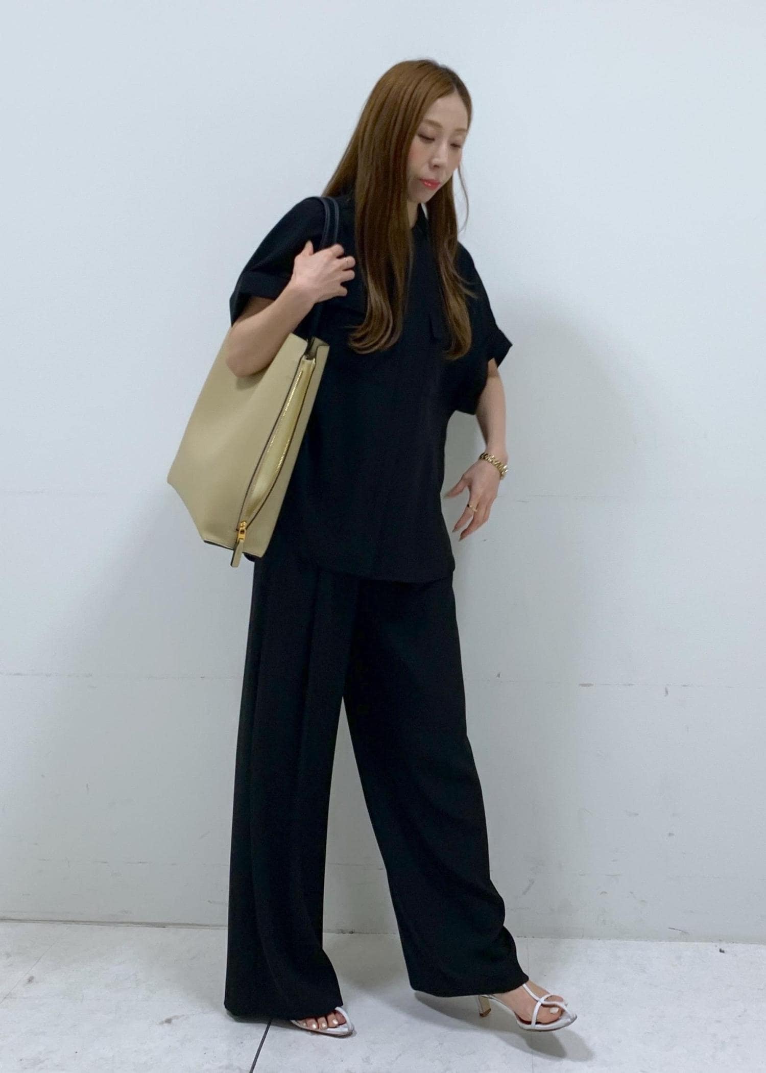 同素材のワイドパンツと合わせて、セットアップでも着れますし、テーパードパンツやタイトスカート合わせもお勧めです。 -
