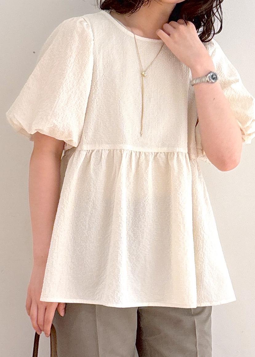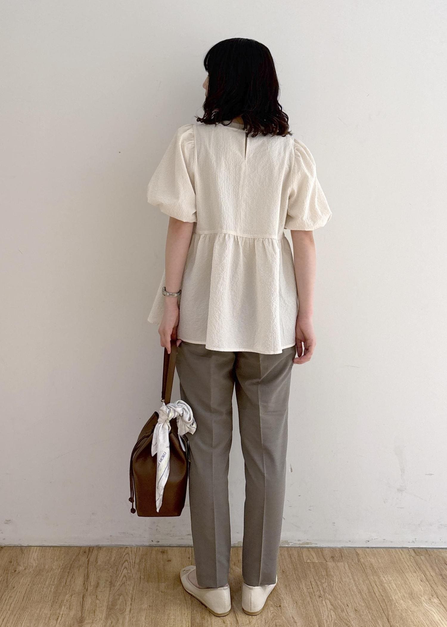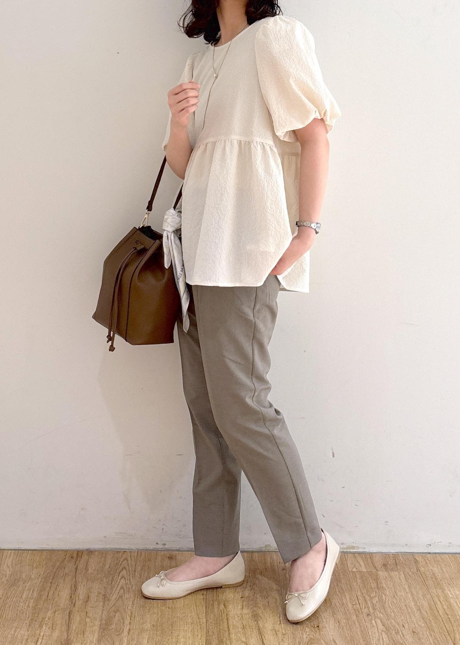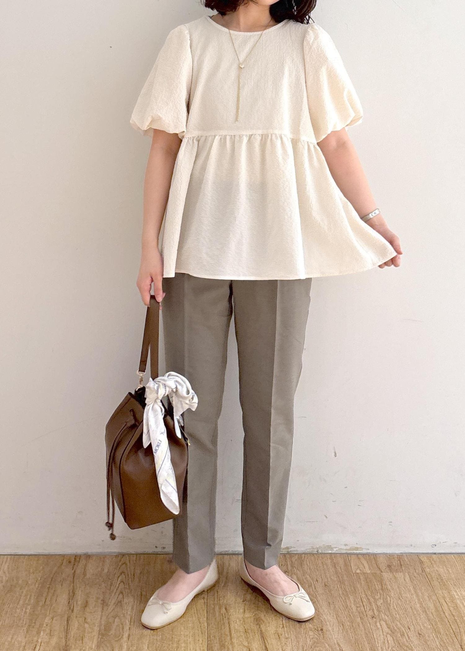 お腹まわりをカバーしてくれるトップスを使った、オフィスカジュアルコーディネートです。トップスがボリュームシルエットなのでパンツはコンパクトに◎