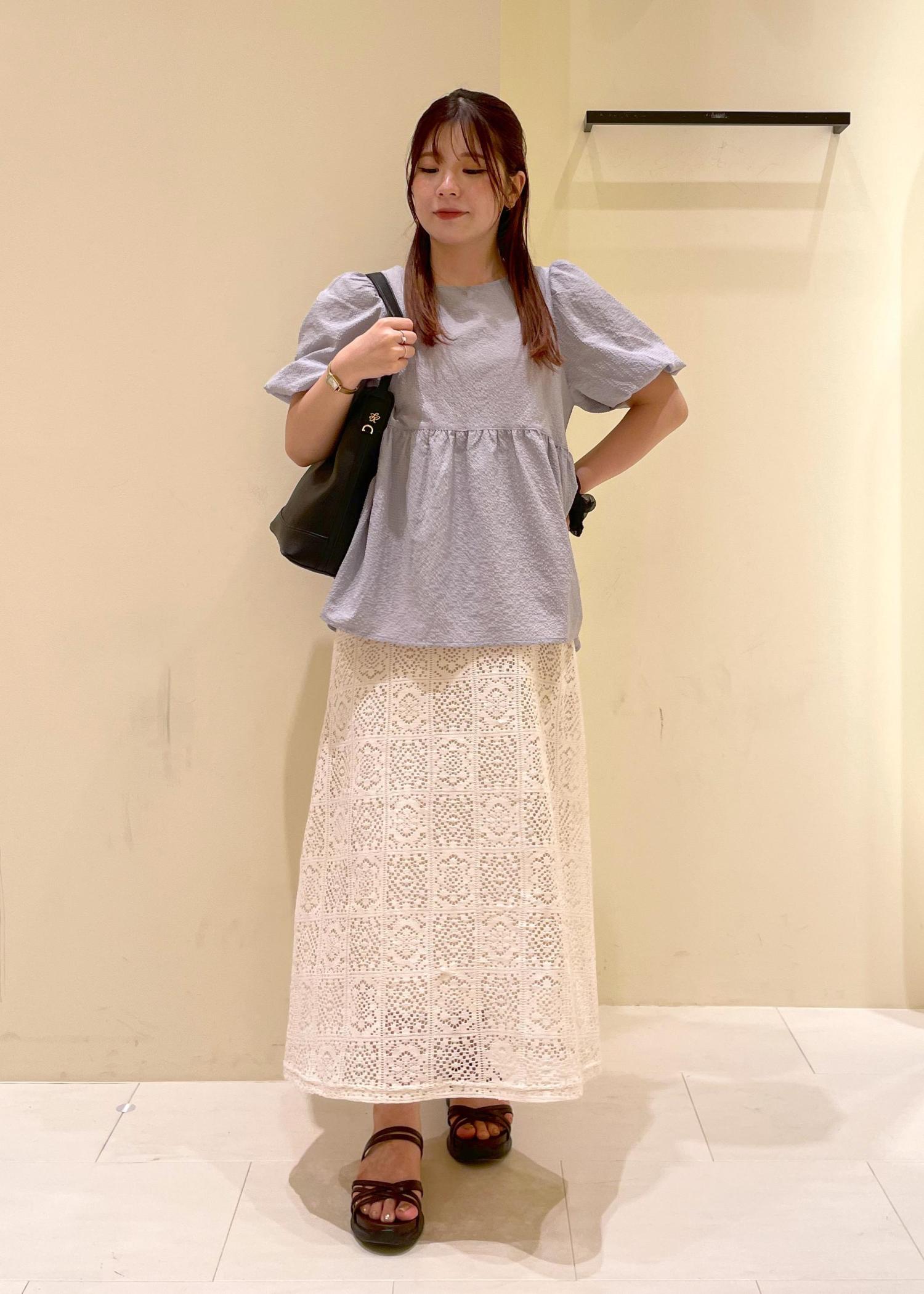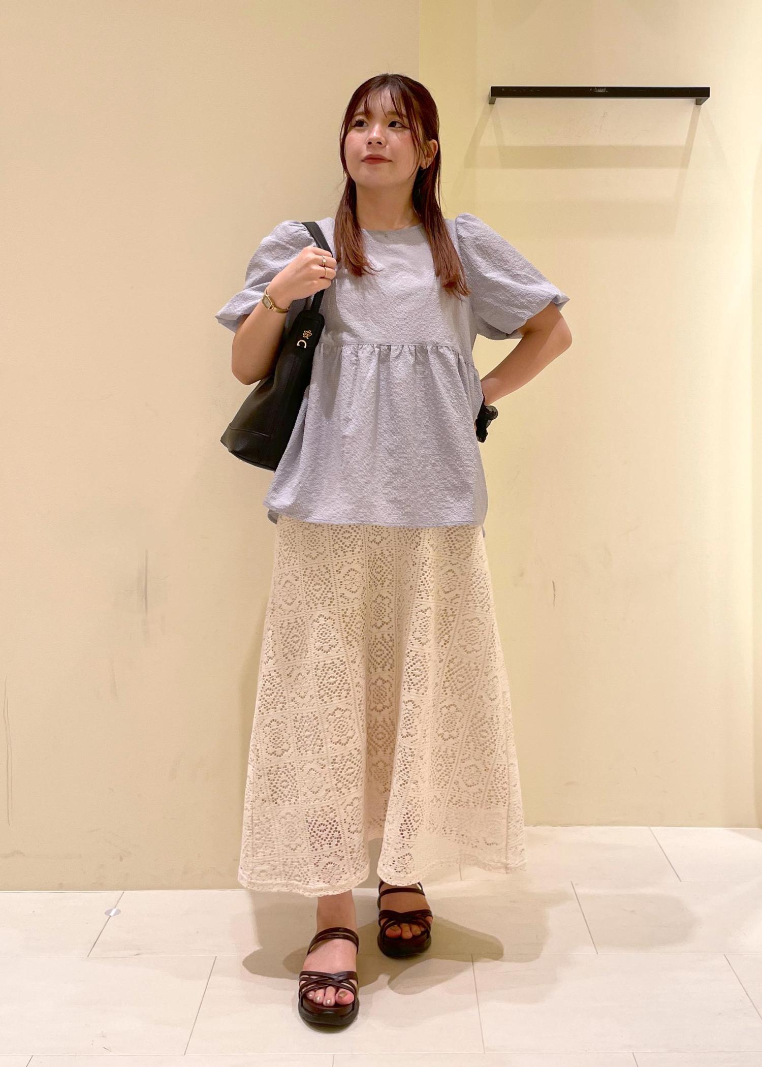 人気のペプラムバルーントップスにワンピースを合わせた綺麗めコーデ!ブルーで映えるコーデです。