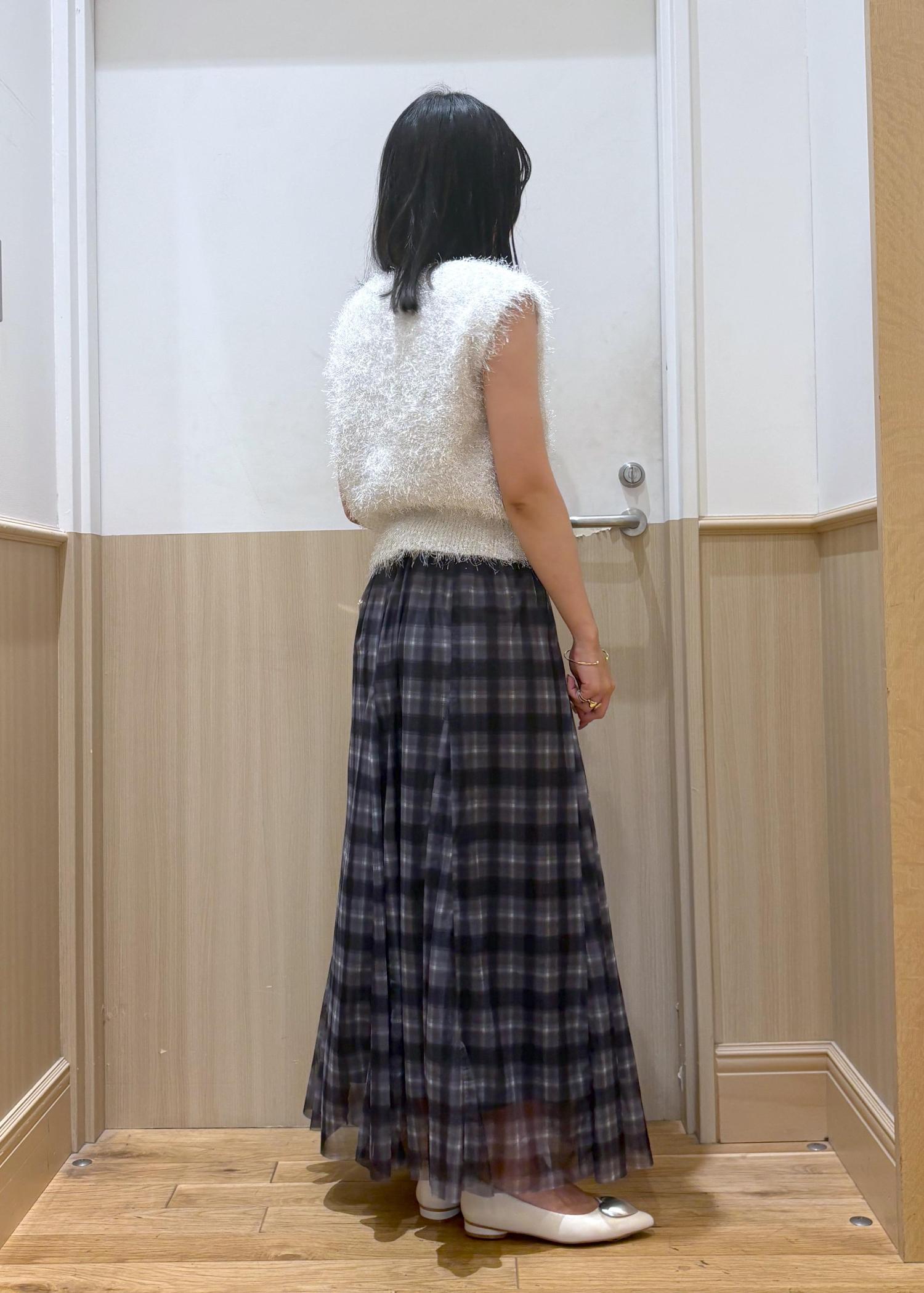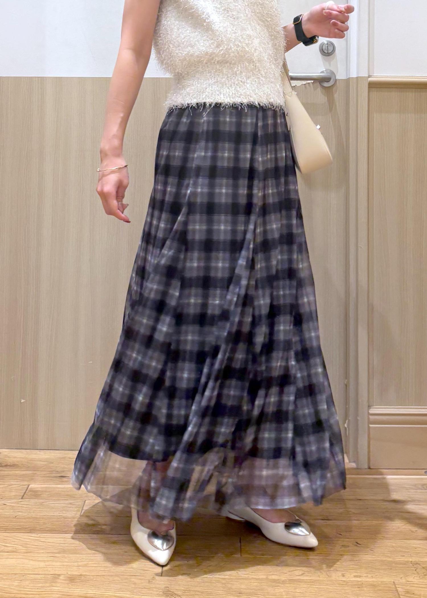 トップスの厚みをチェックスカートのほどよいAラインのシルエットが着痩せして見せてくれるので、とても綺麗なバランスで着用できるコーデでした!
