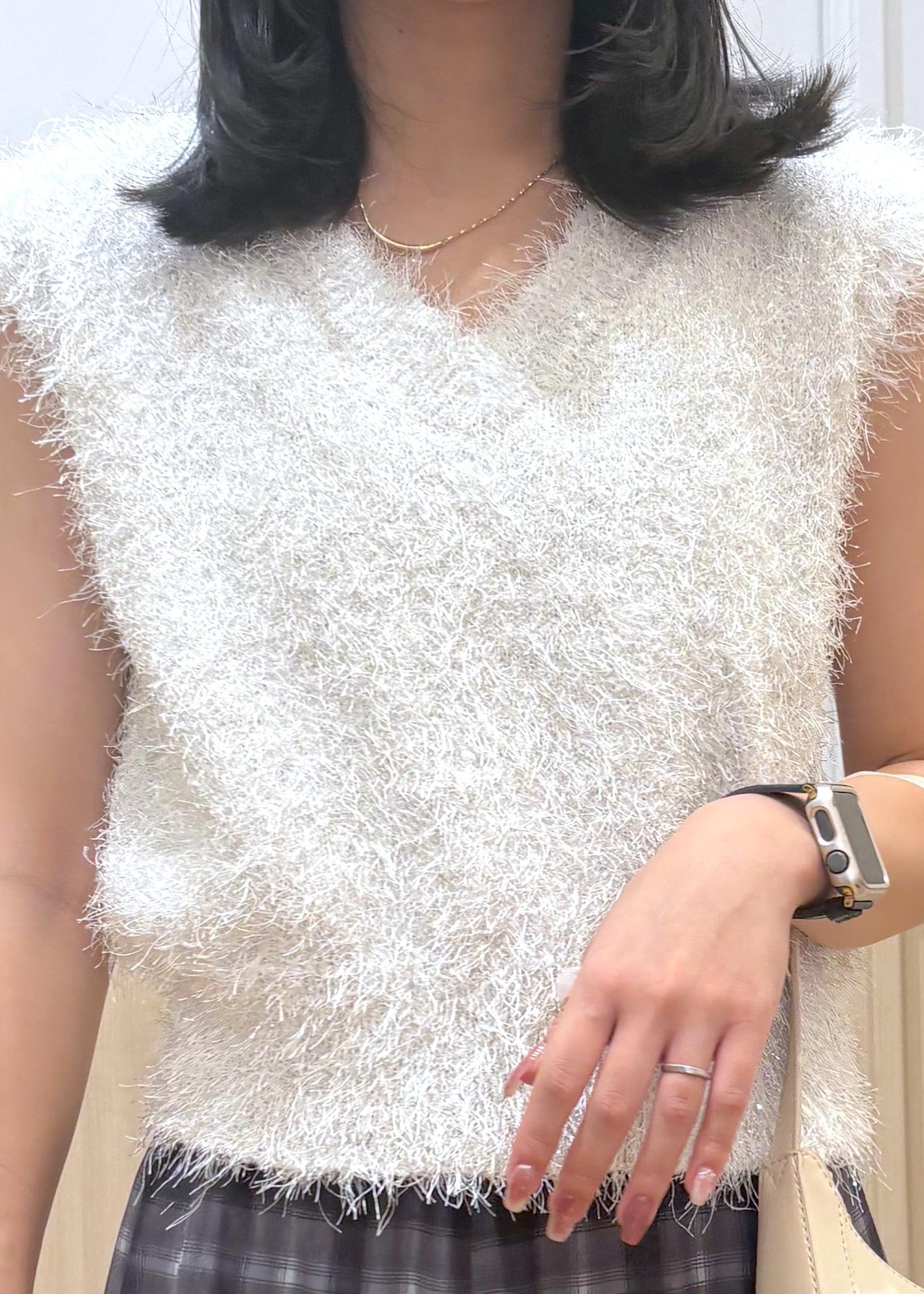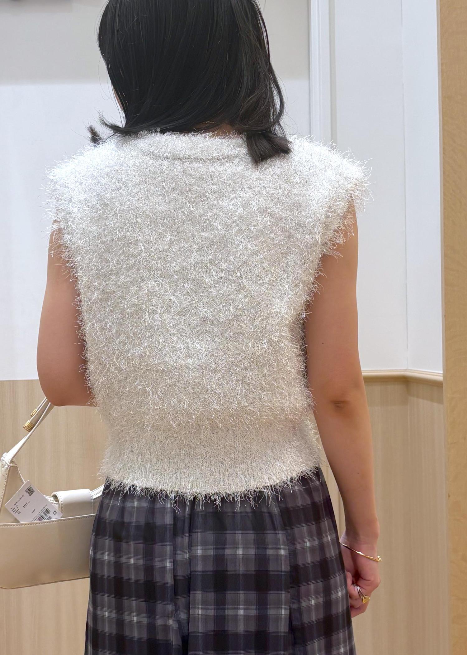 フェザーのトップスは厚みがありますが、ノースリーブと涼しめなローゲージニット素材で夏でも可愛く着用できます◎