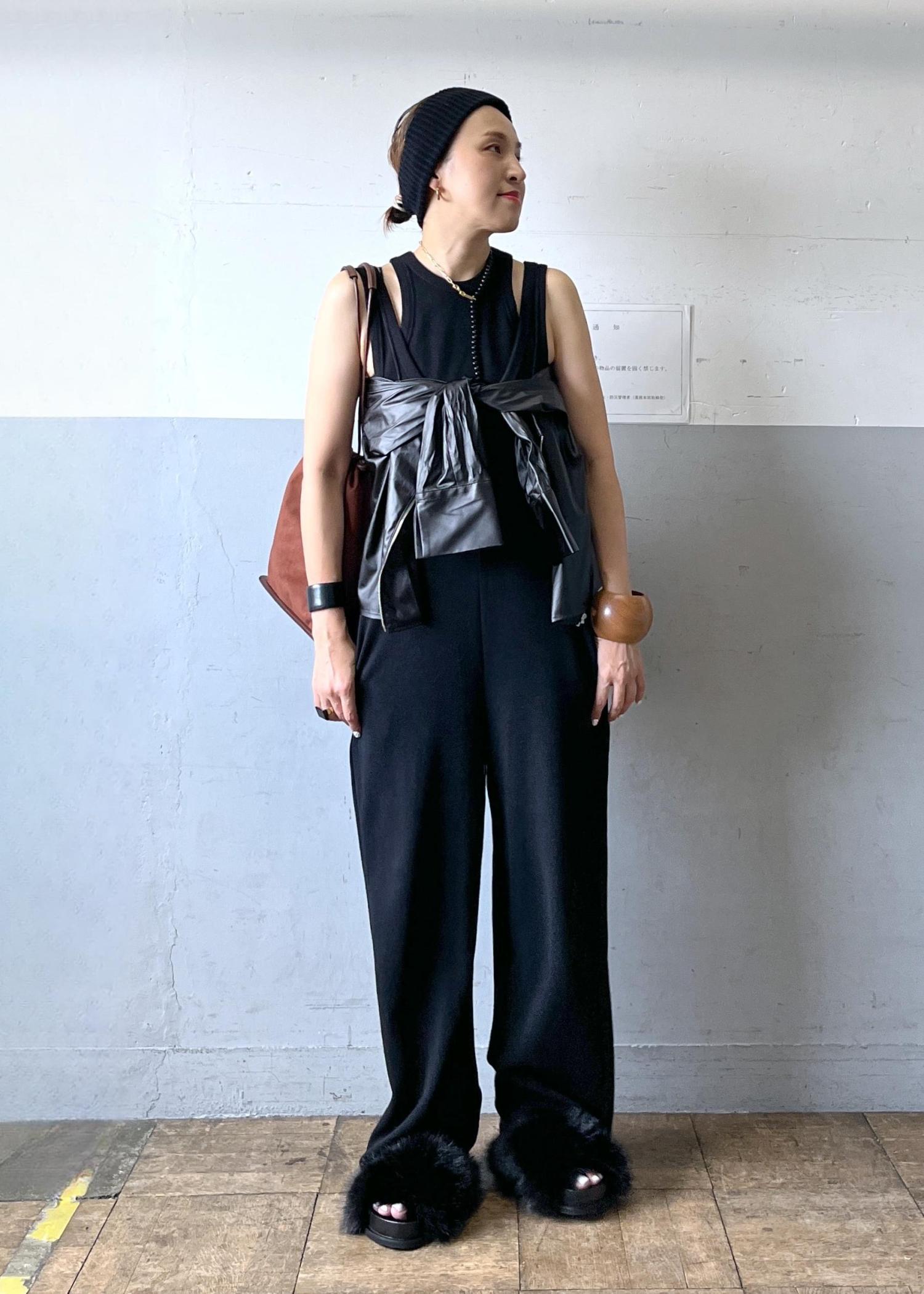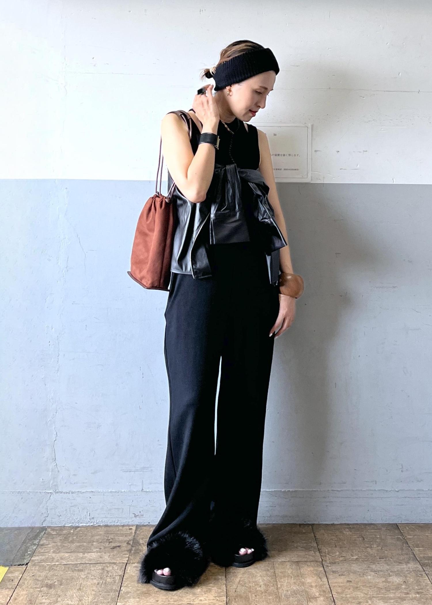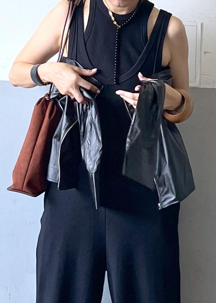 ブラックのワントーンもレザーのような素材を合わせるだけでモード感高まります♡とても軽いのも嬉しい♫