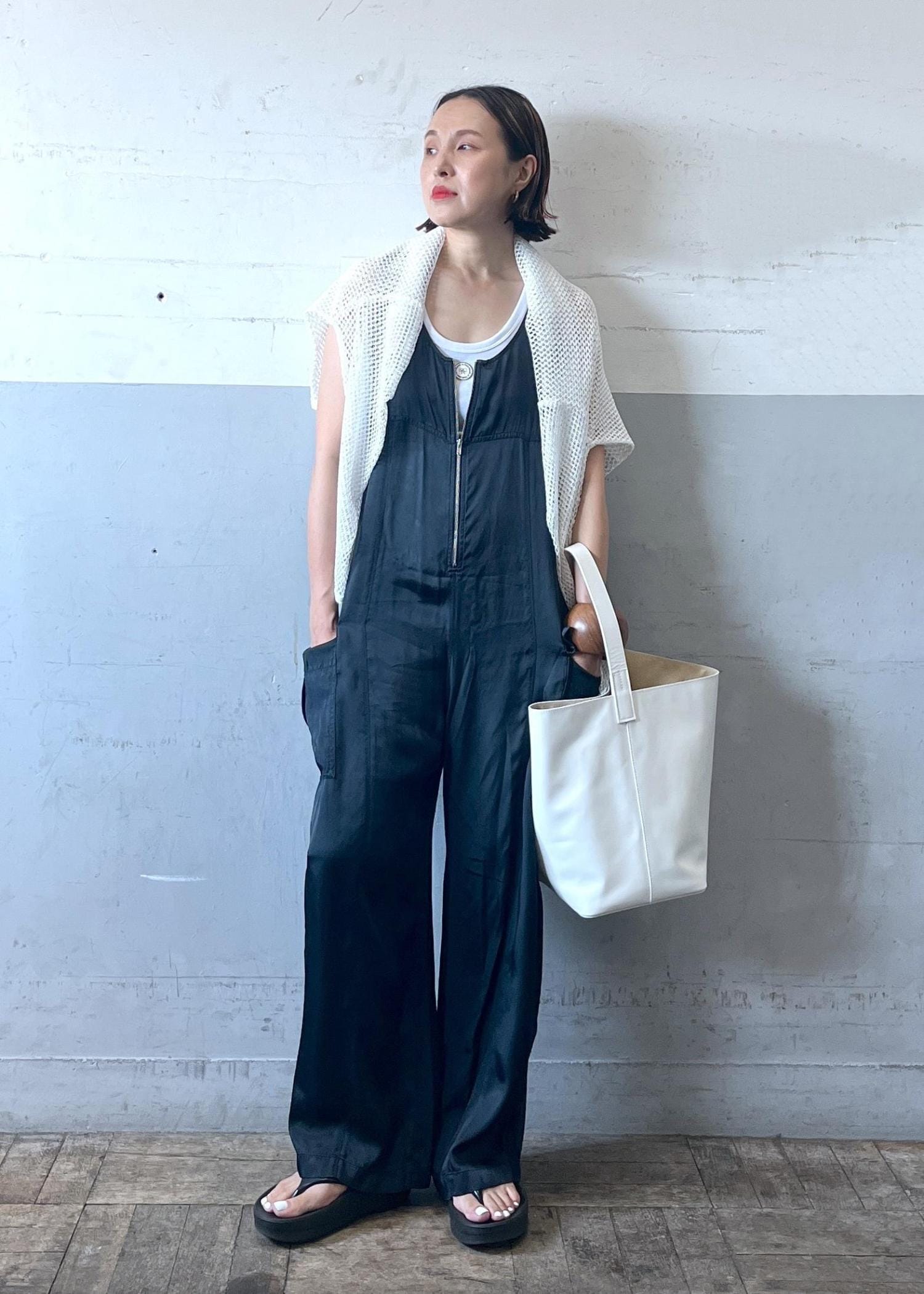 MA-1のようなミリタリー感のあるサロペットです。キャプラ素材でとても軽く、張り感もないのでスッキリ着用できます。ゆとりもあるのでとっても楽ちん。ウエストの両サイドにスナップボタンが付いているので少し絞って着たり、ゆったり着ても◎ インナーのバランスで変えてみてください!