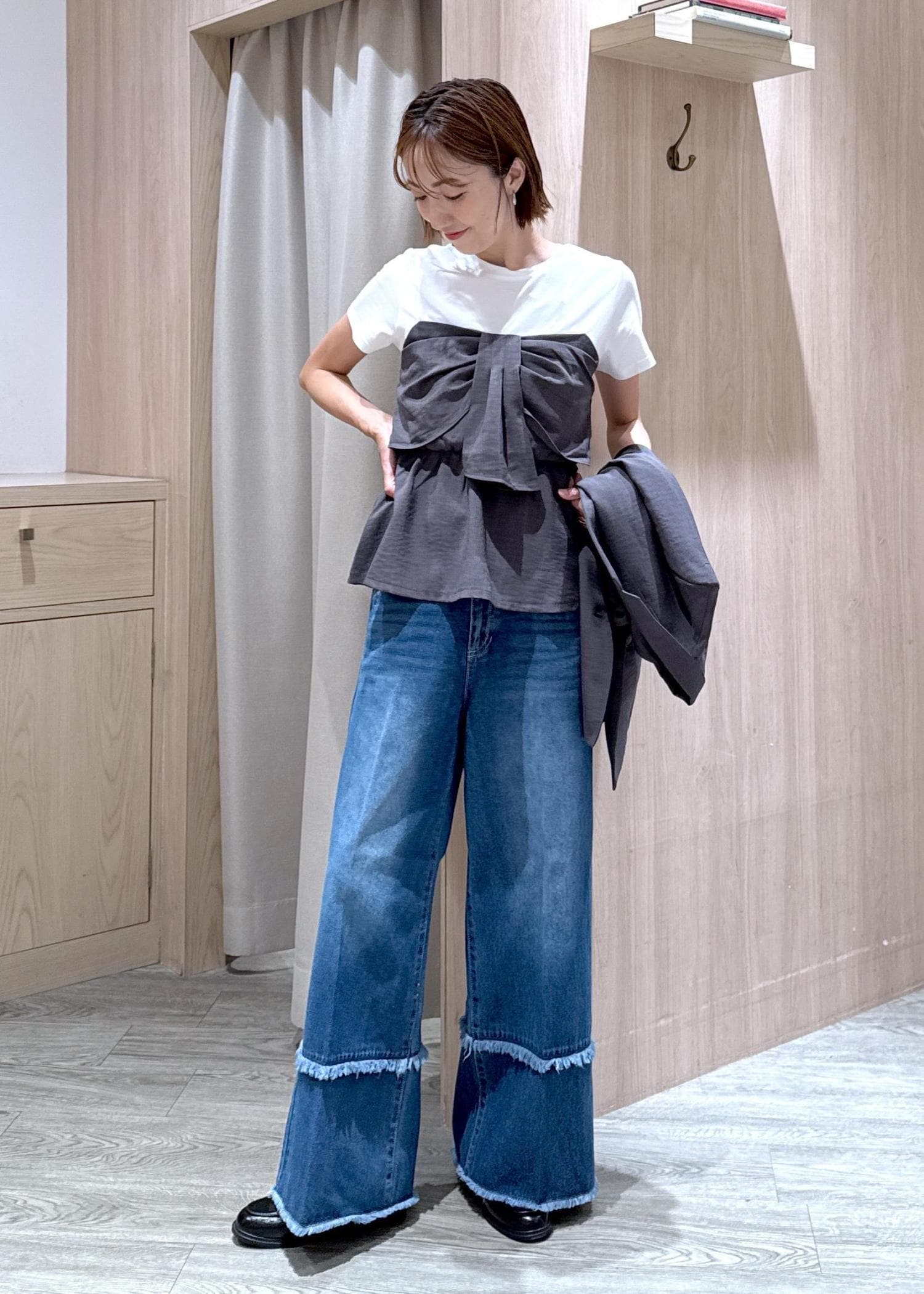 グレーの美easy2ピースにフレアデニムを合わせた、秋まで着られるキレイめカジュアルスタイルです!