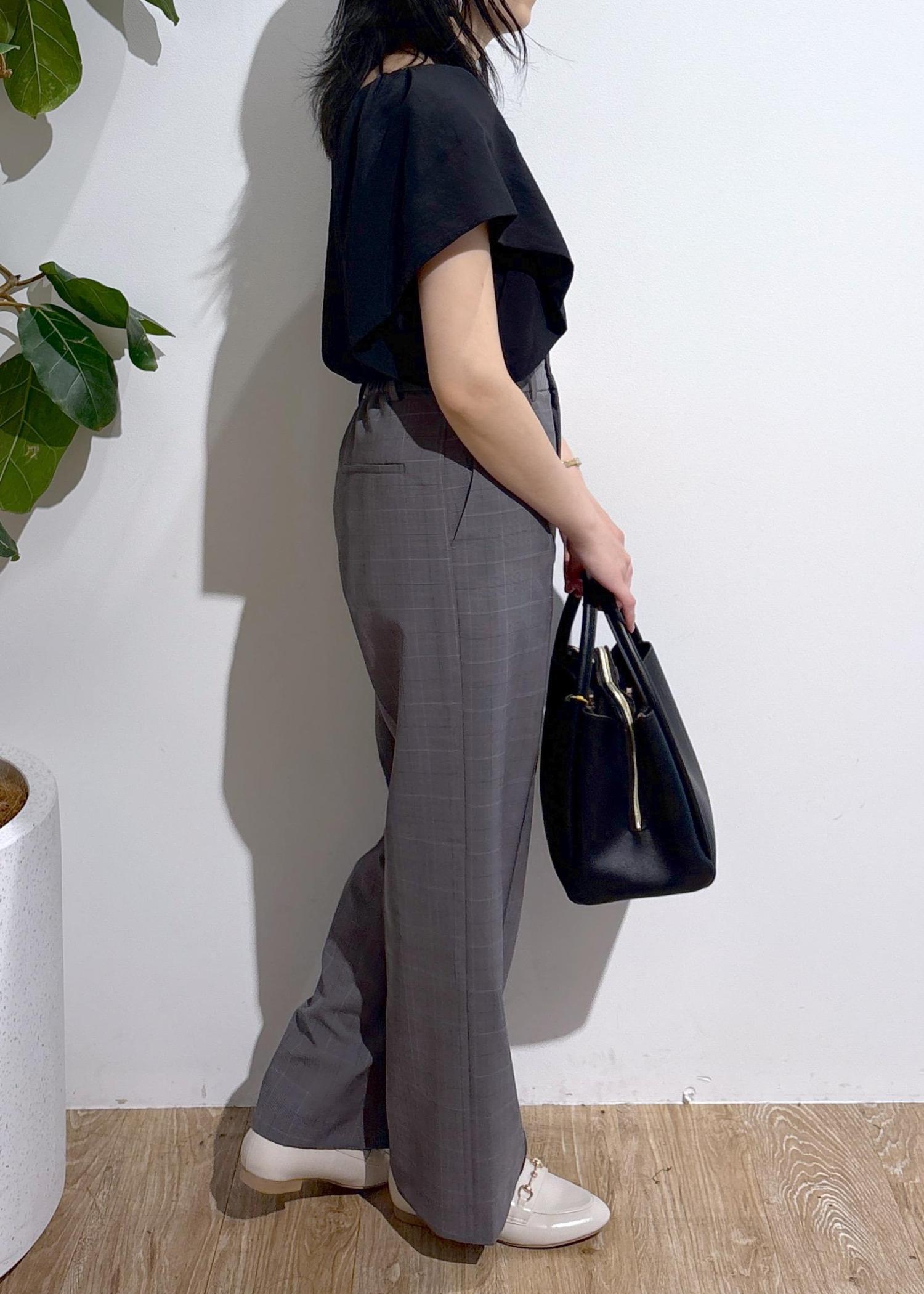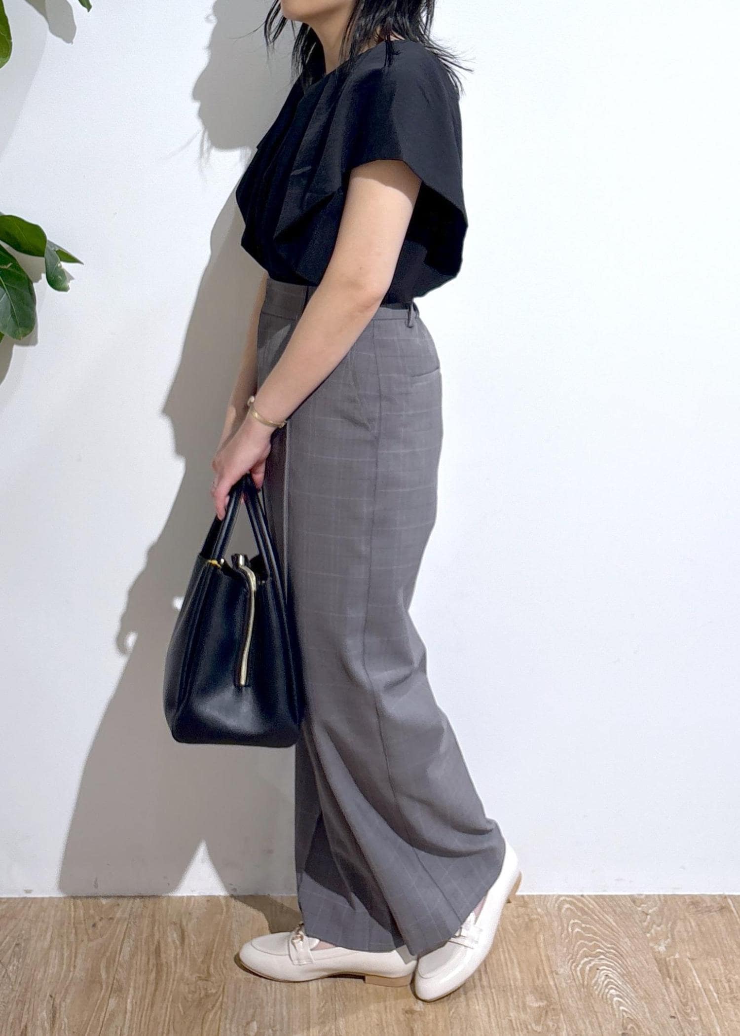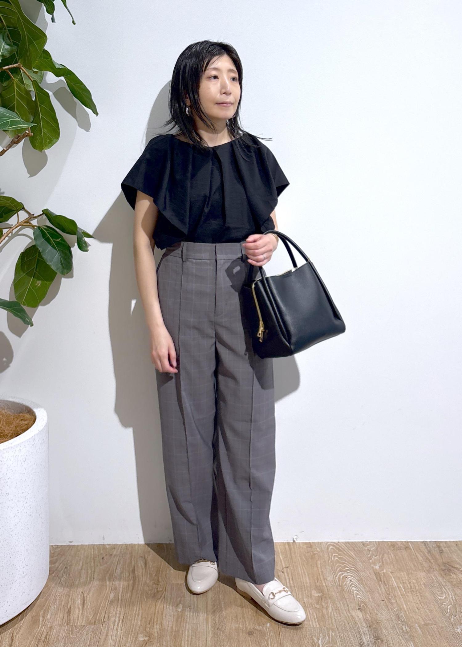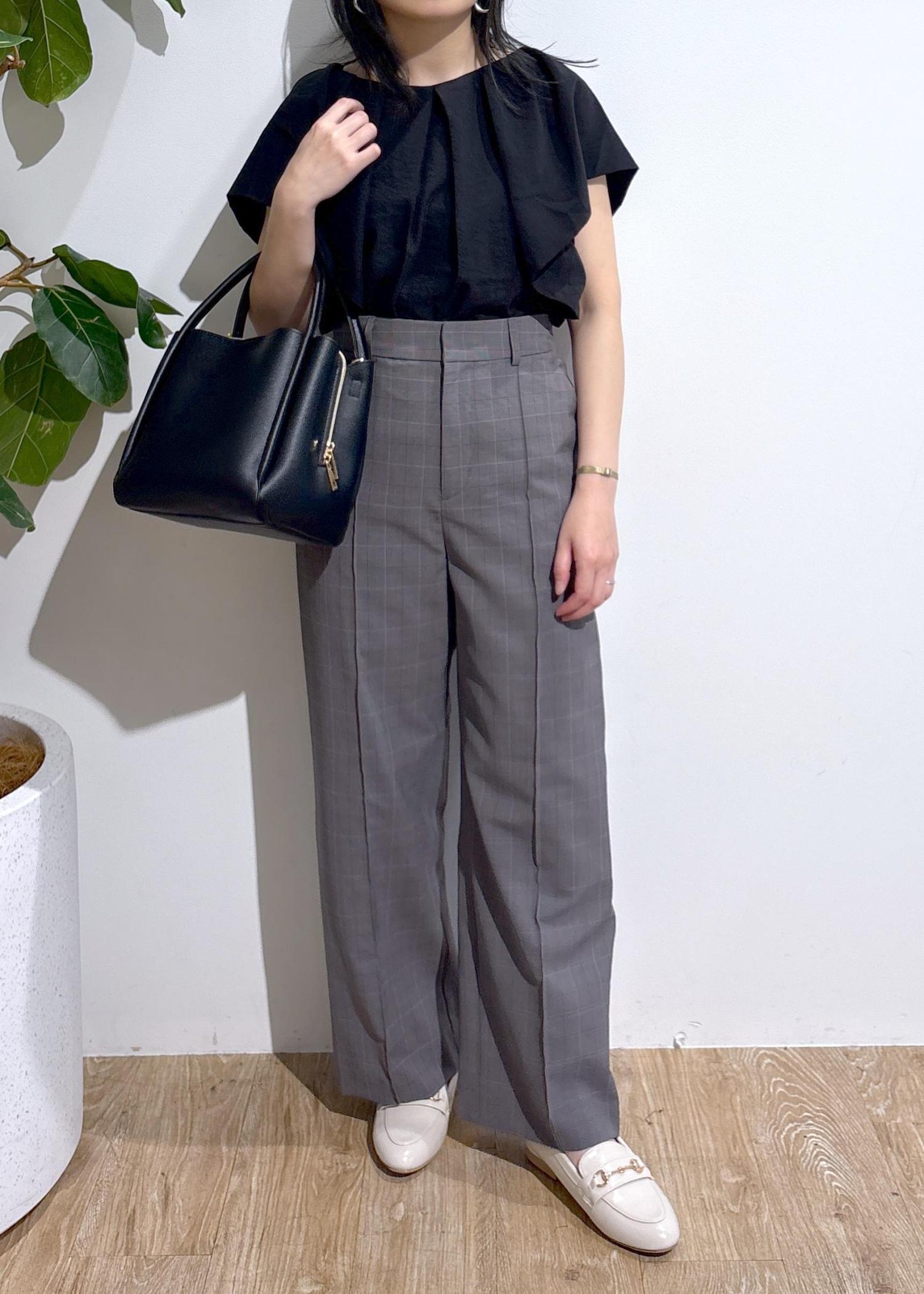 色味が重たくならないようボトムスはチェック柄のスラックスパンツ、キナリ色のローファーを合わせて大人可愛いオフィスカジュアルコーデにしてみました。