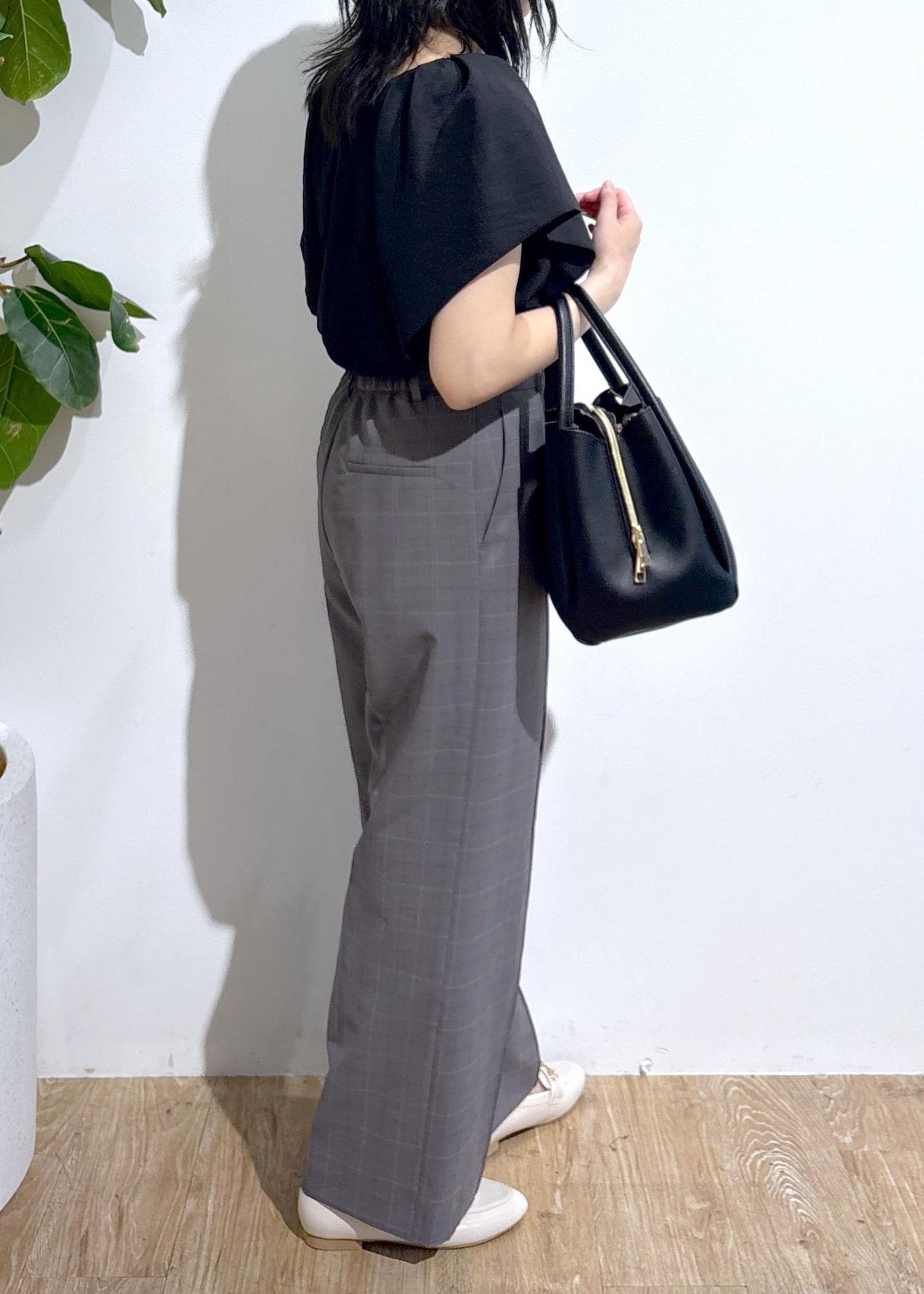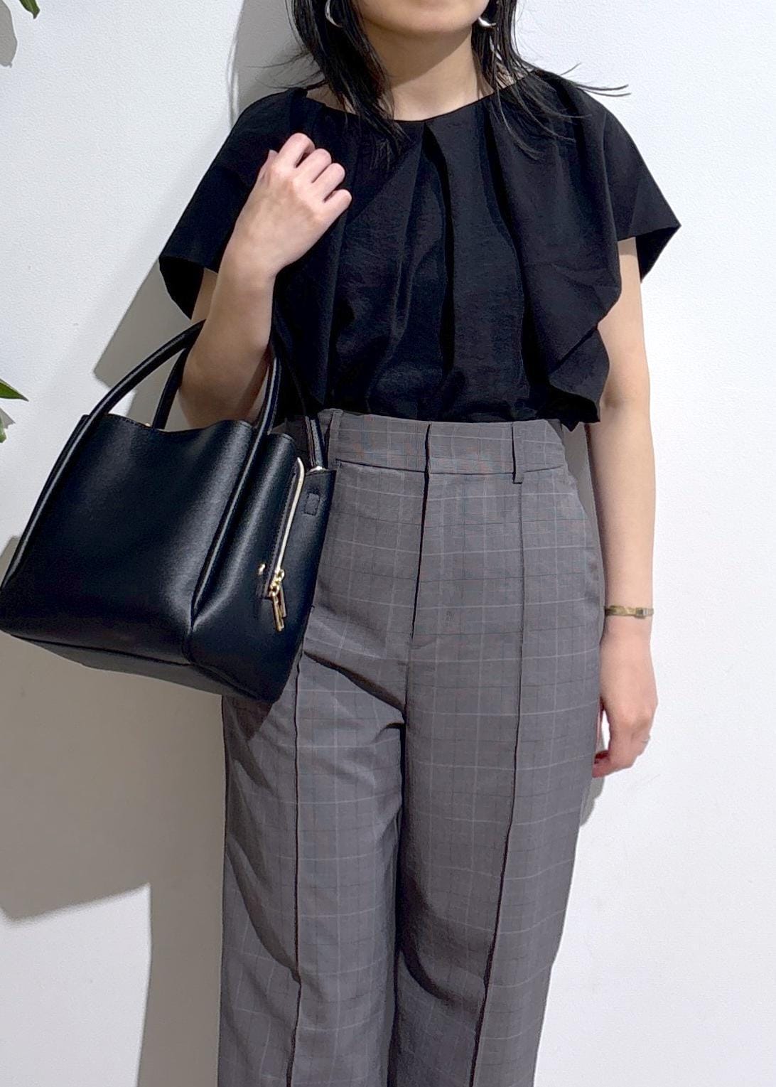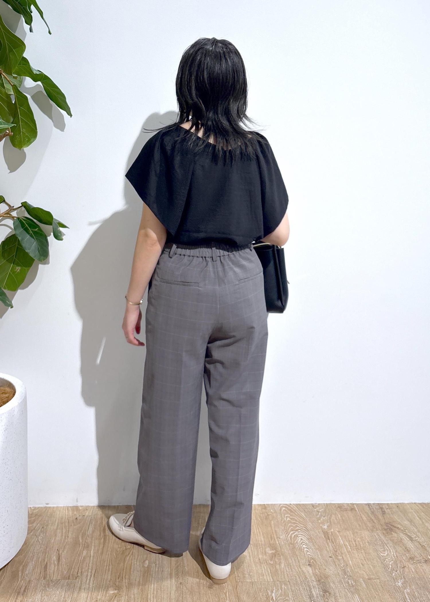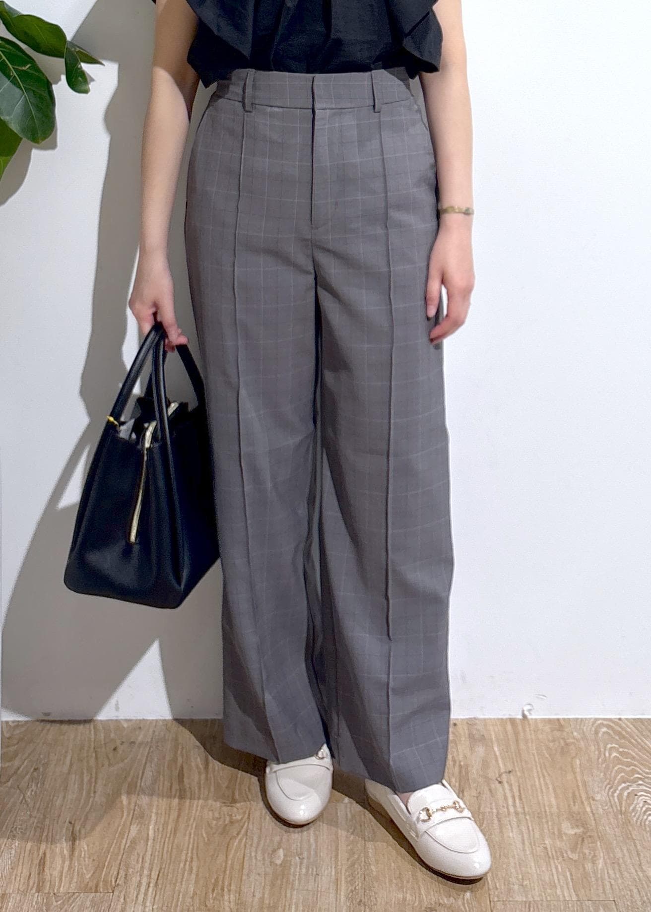 色味が重たくならないようボトムスはチェック柄のスラックスパンツ、キナリ色のローファーを合わせて大人可愛いオフィスカジュアルコーデにしてみました。