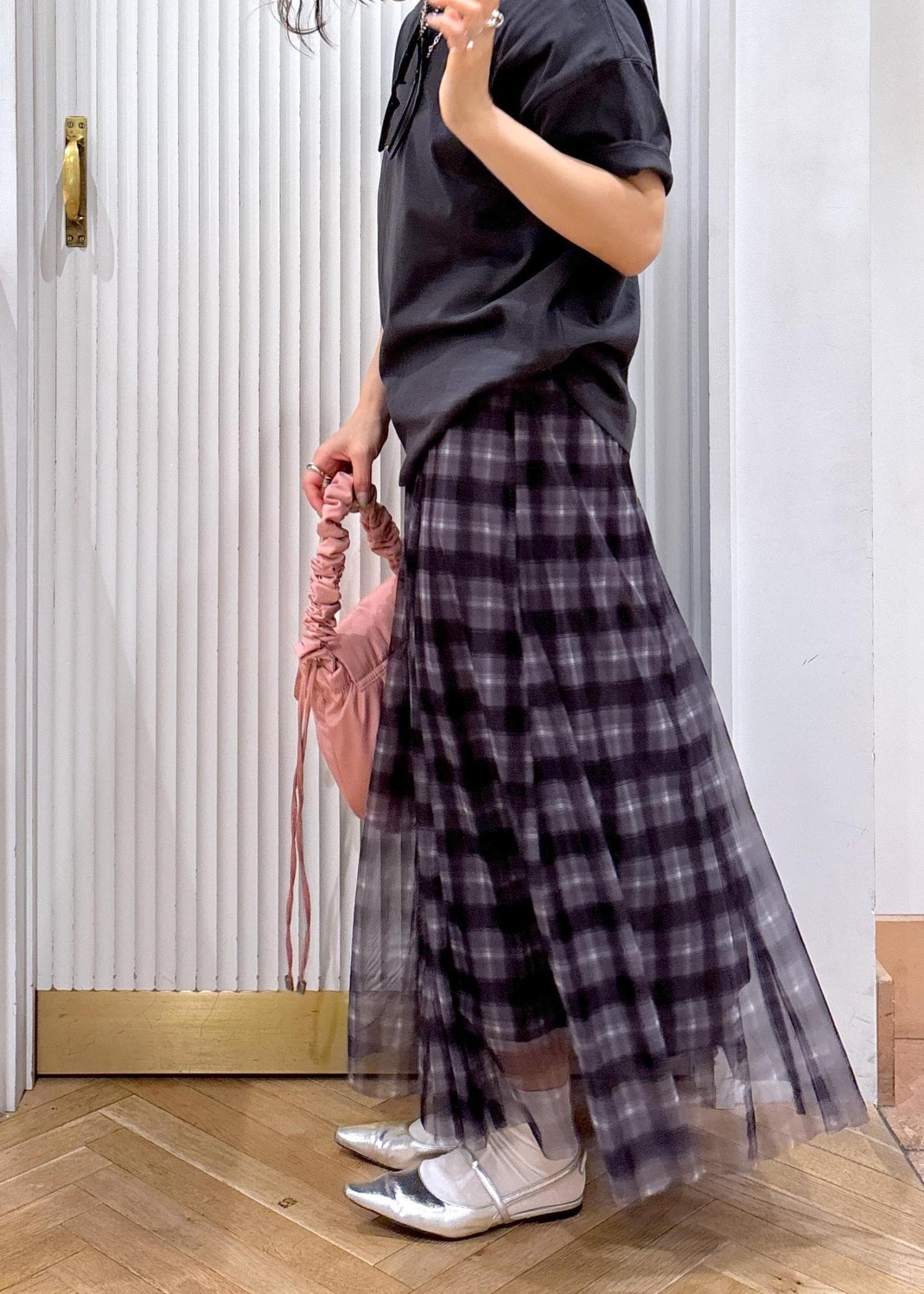 VIS【洗える】チュールプリントチェックスカートブラック系 / F¥4,612レビューフリーサイズでウエストゴムの履きやすいスカートです。伸縮性があり足捌きもとっても楽!裾に透け感があるので軽やかな印象です。