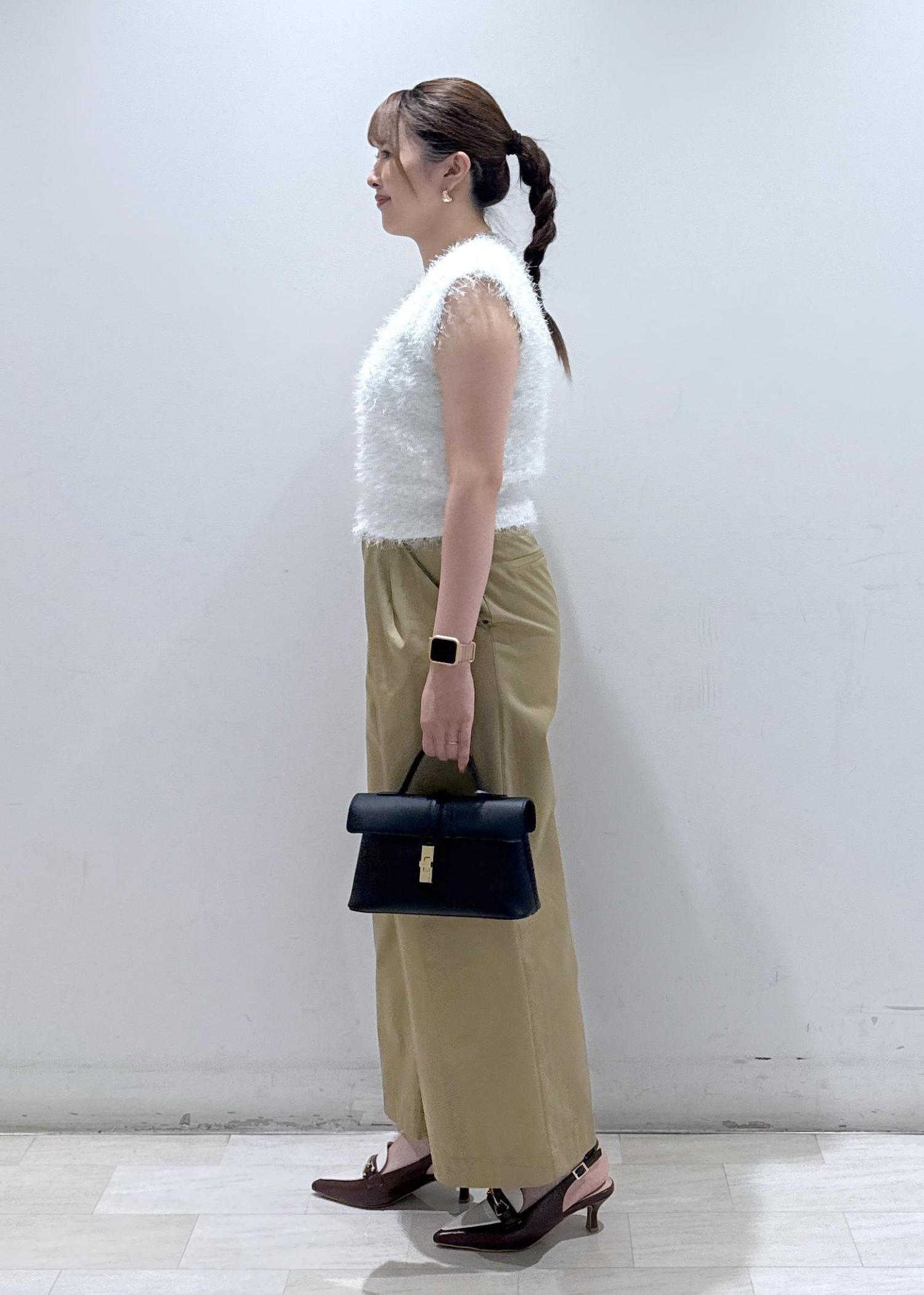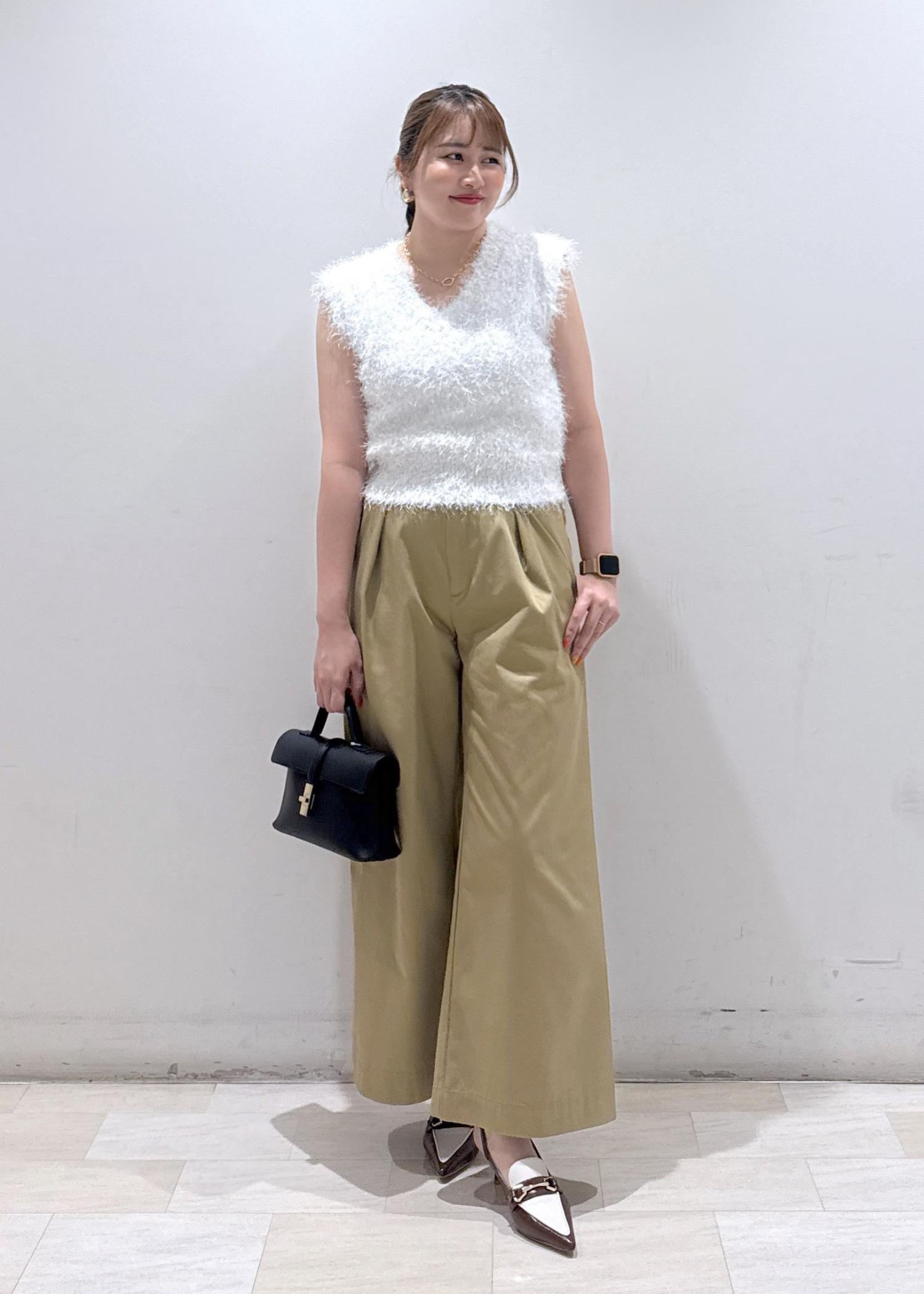 チクチク感もなく柔らかい素材なので今から秋までも長く使えるトップスです。シルエットが綺麗なハイウエストのバギーパンツと合わせて少しカジュアルに。お時間や女子会の時も映えるコーディネートです。