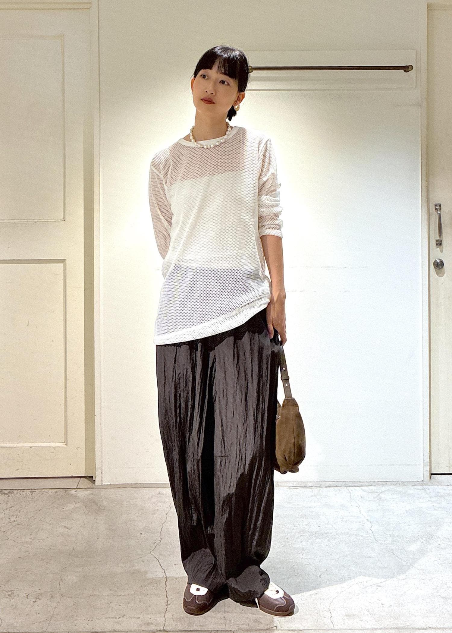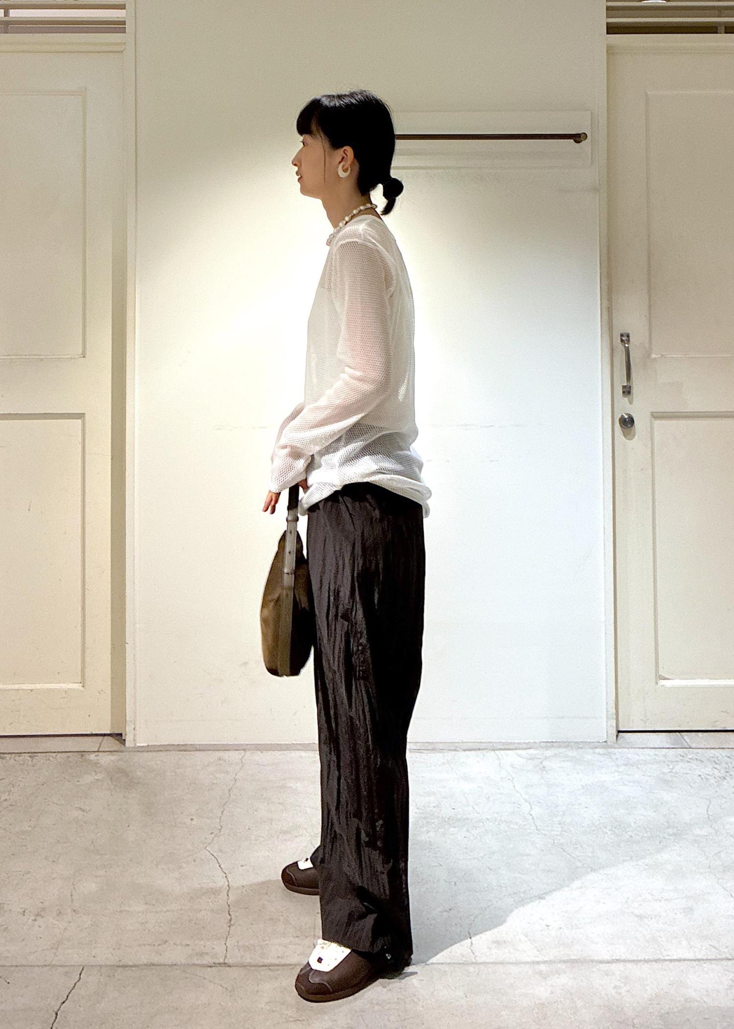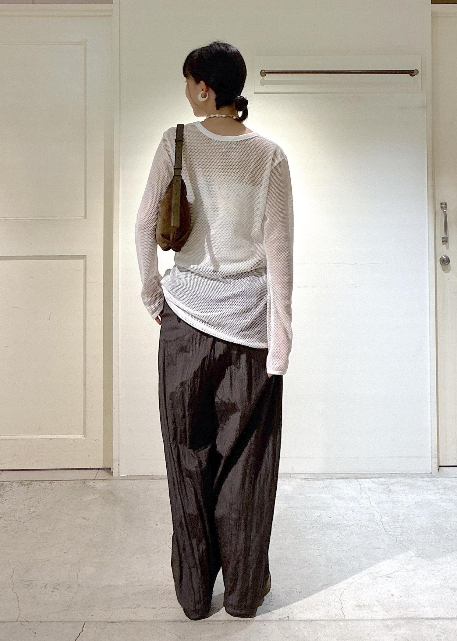 IRONINGのメッシュトップスとオリジナルのウールナイロンパンツでスタイリングしました。
