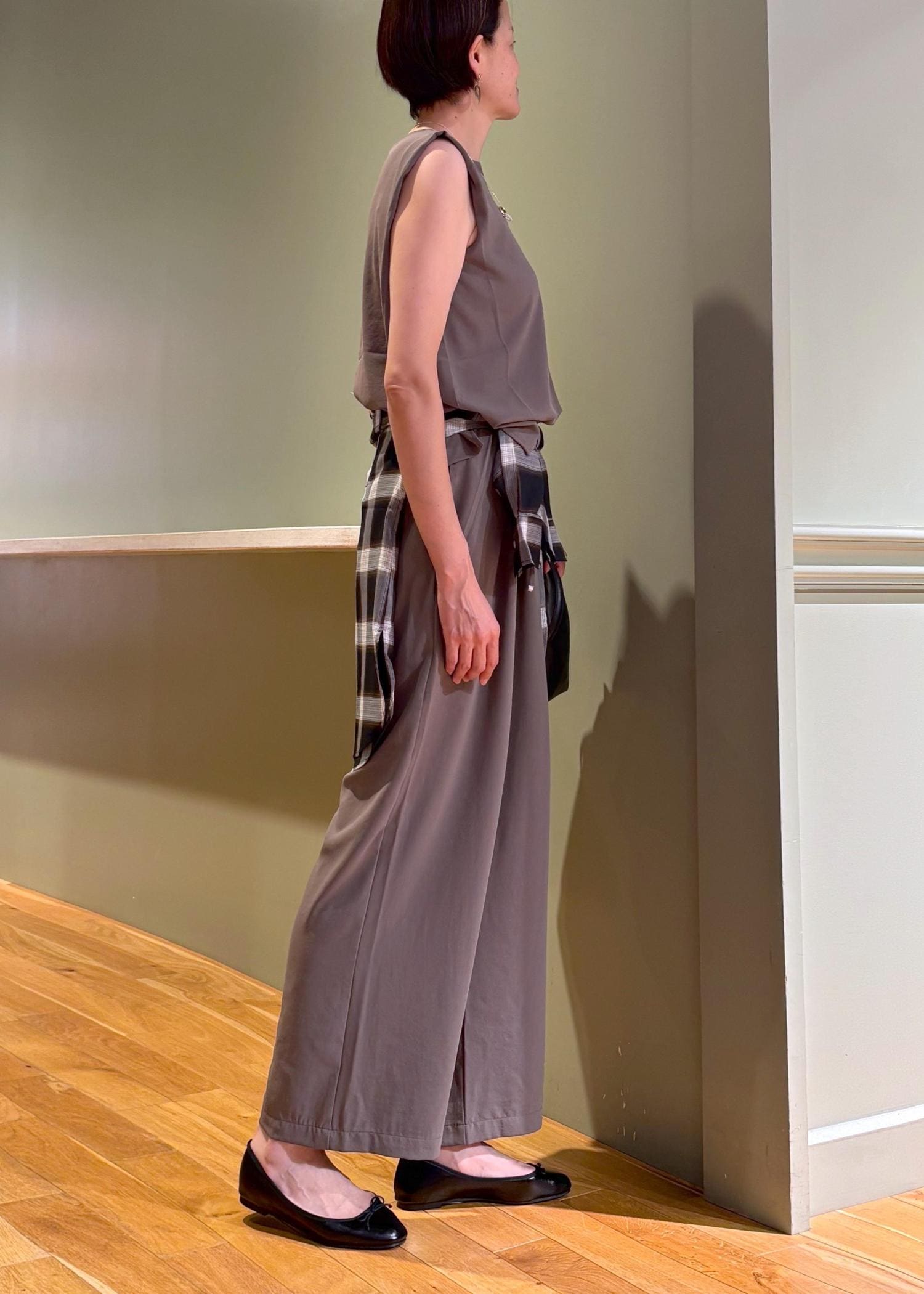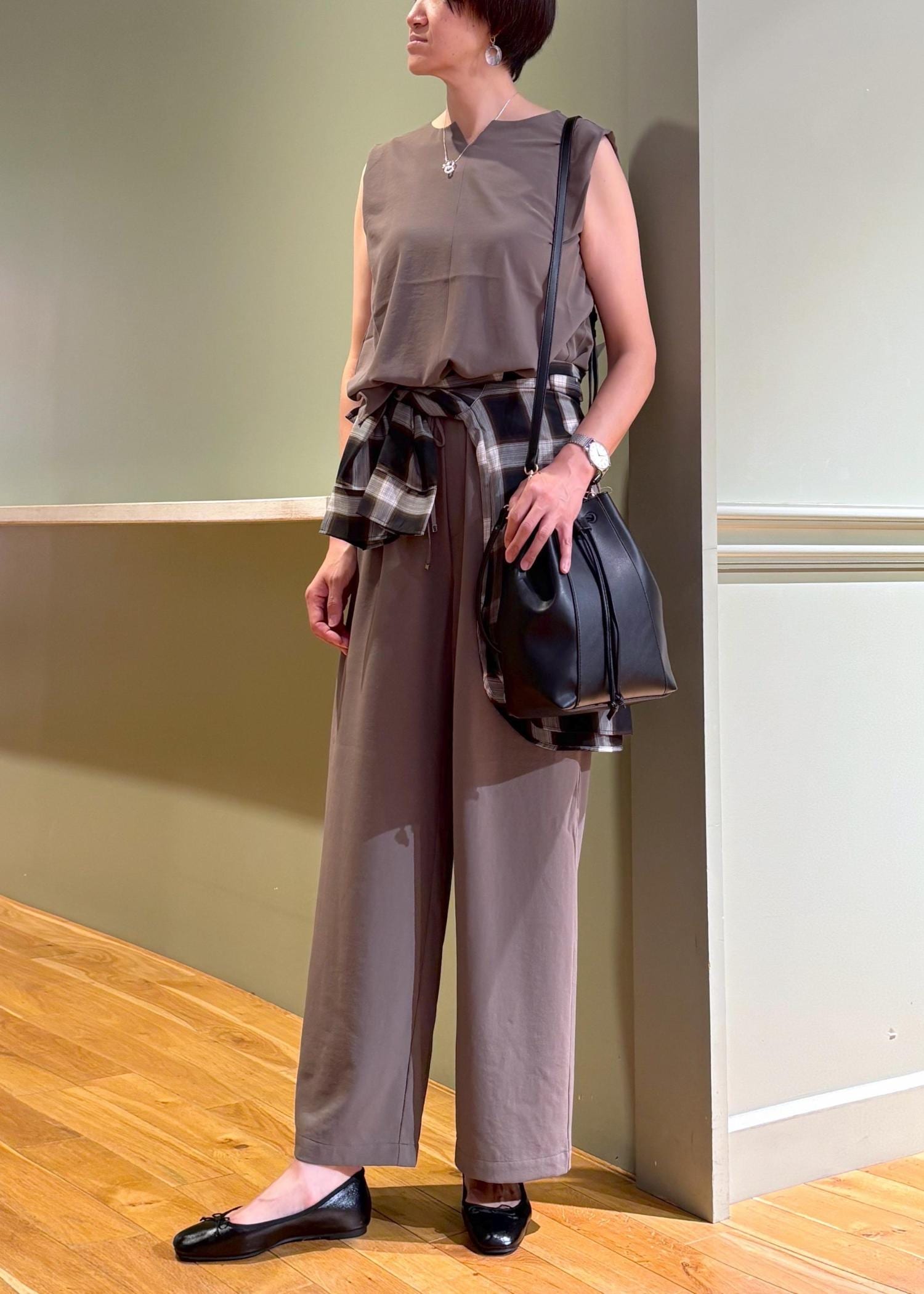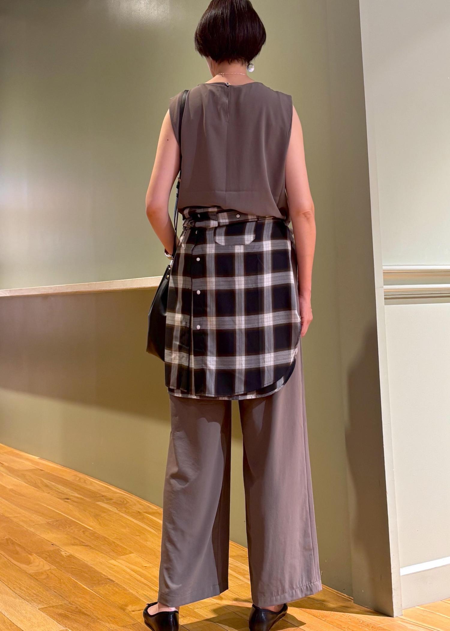 とろみのあるセットアップは、着心地良くコーデを考えなくても様になるアイテムでおすすめです。チェックシャツを小物風にアレンジすると、一足早い秋スタイルが楽しめます。