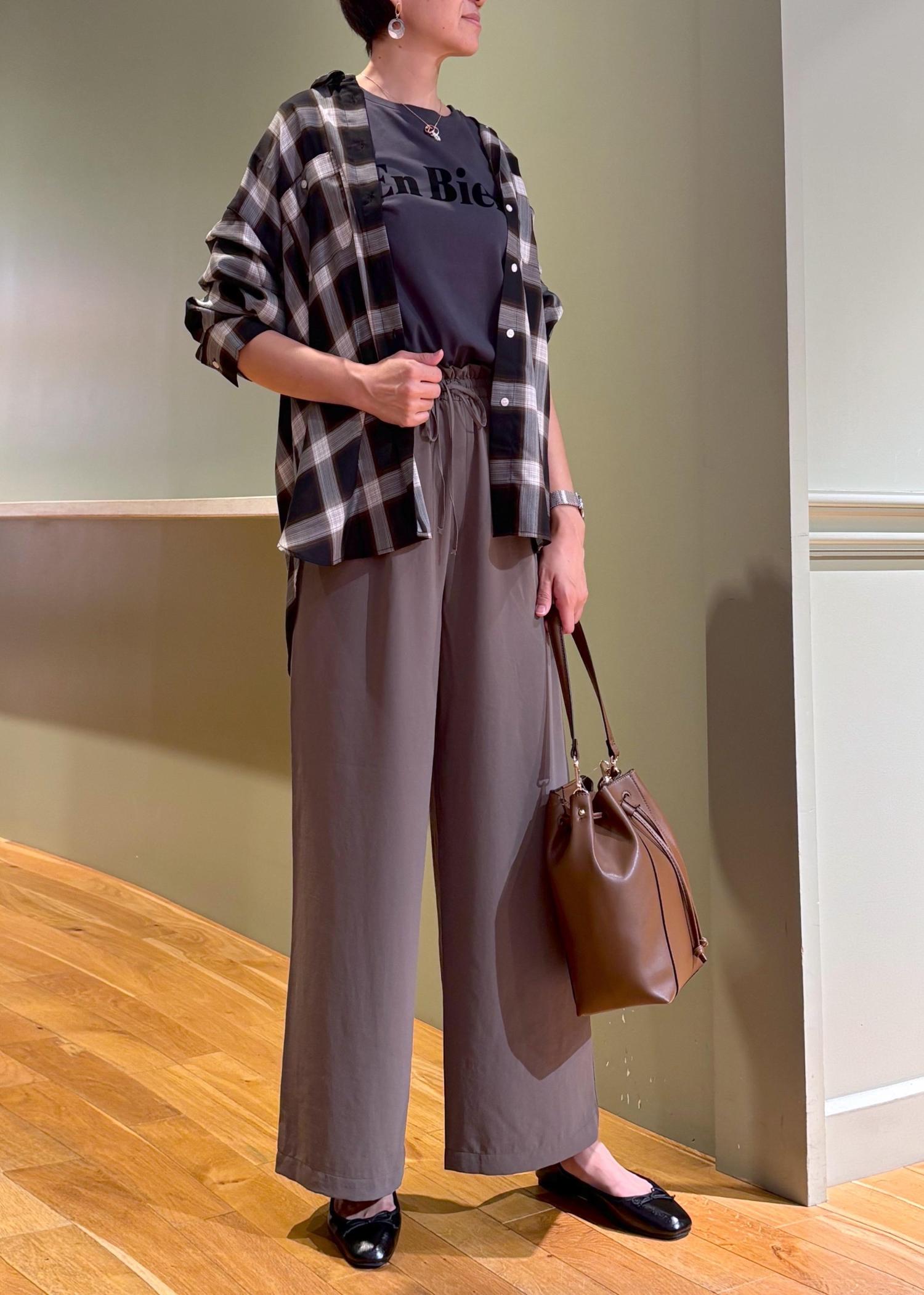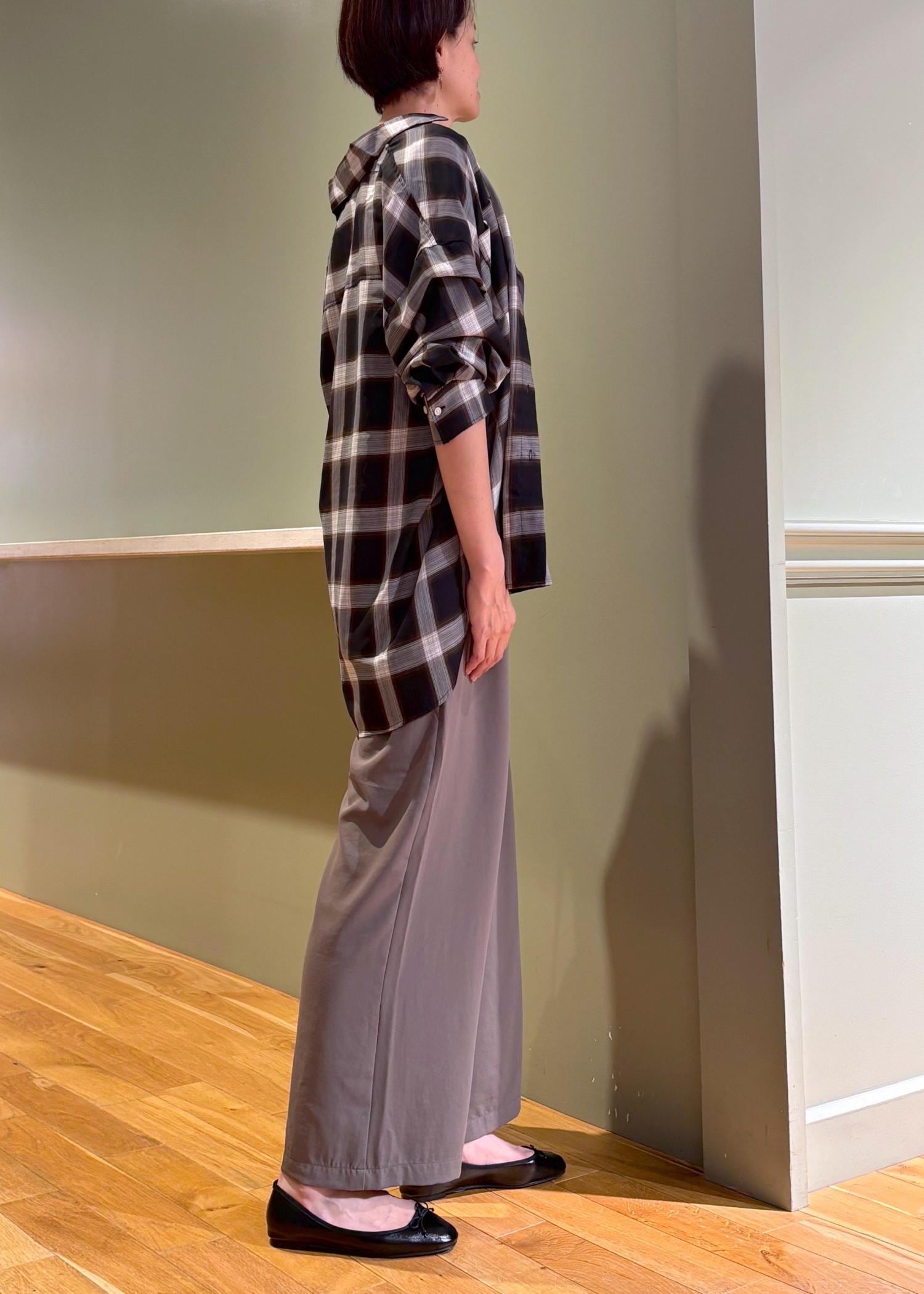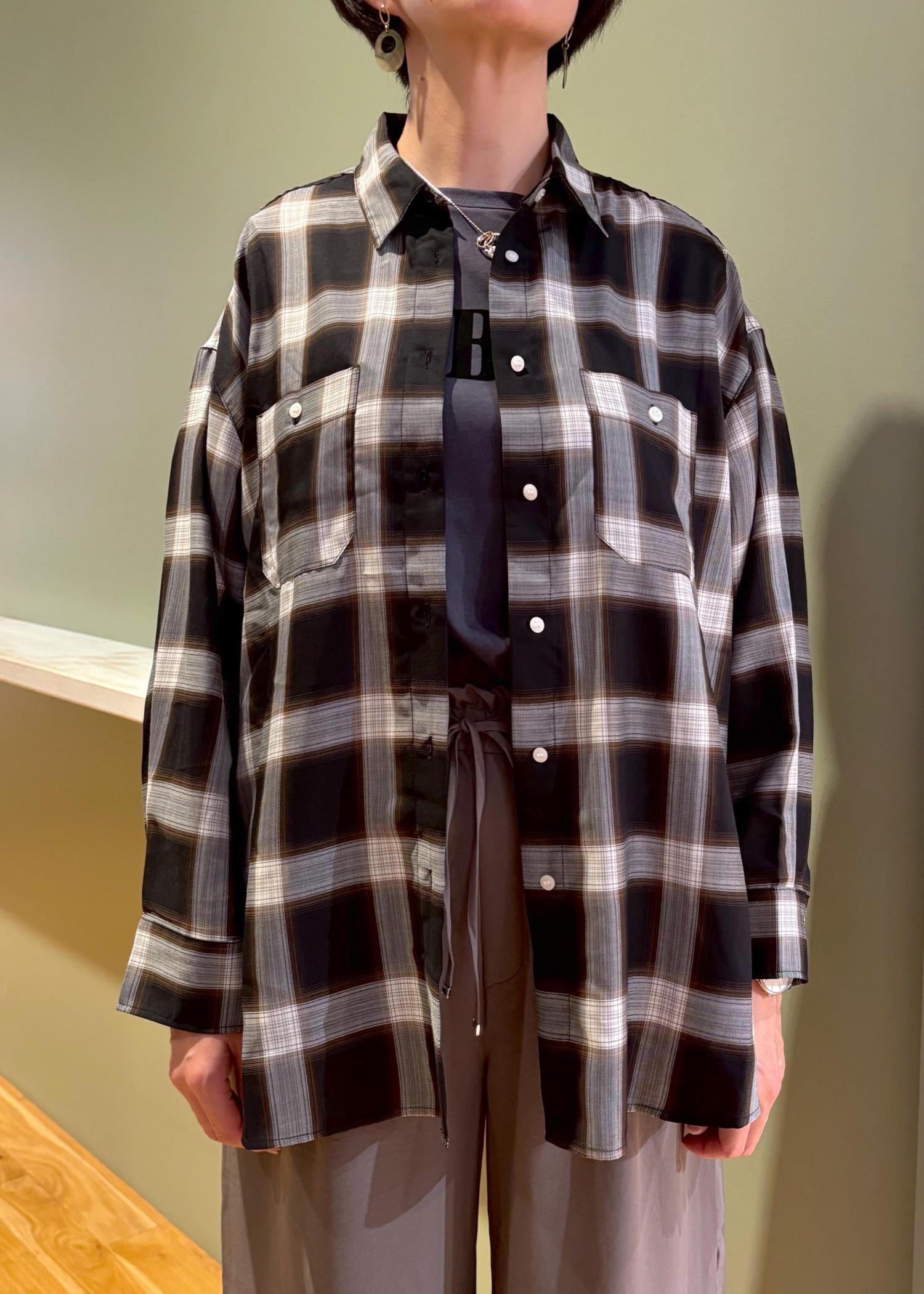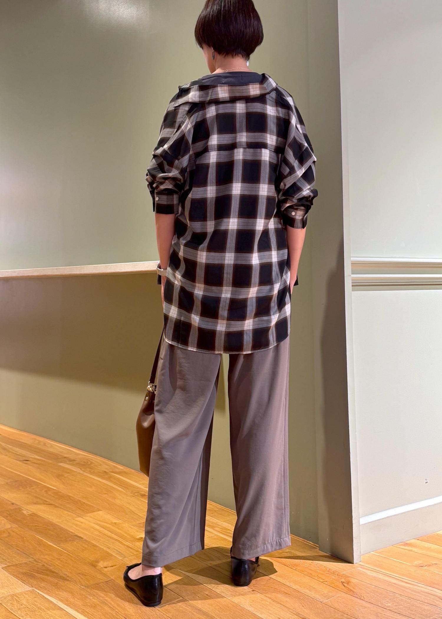 チェックシャツは、1枚羽織るだけで一足早い秋スタイルが楽しめます。シャツはオーバーサイズなので抜襟したルーズな着こなしや、小物のように腰に巻いたりしたスタイルもおすすめです。