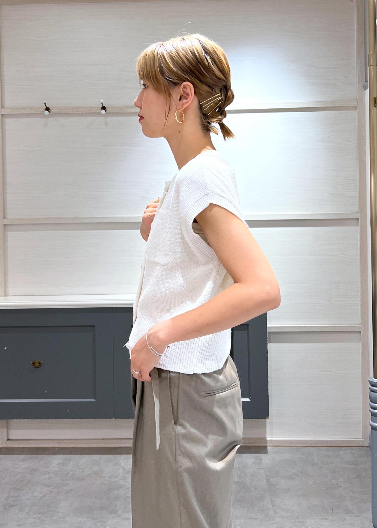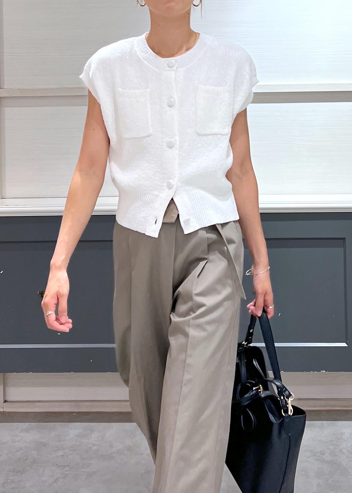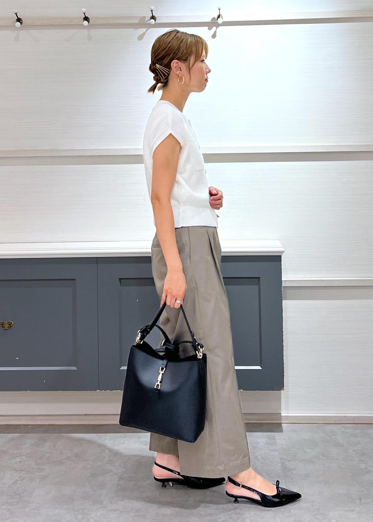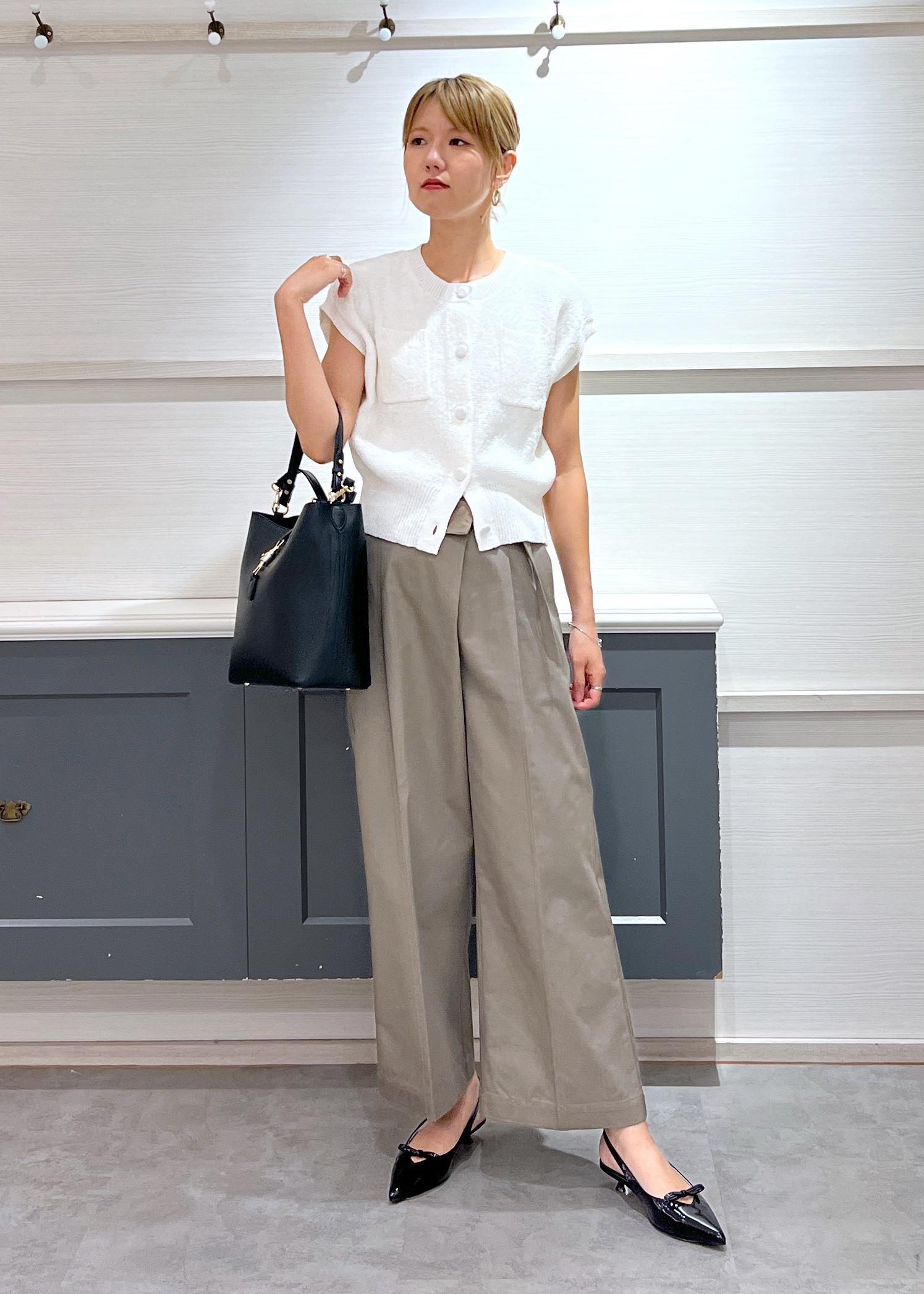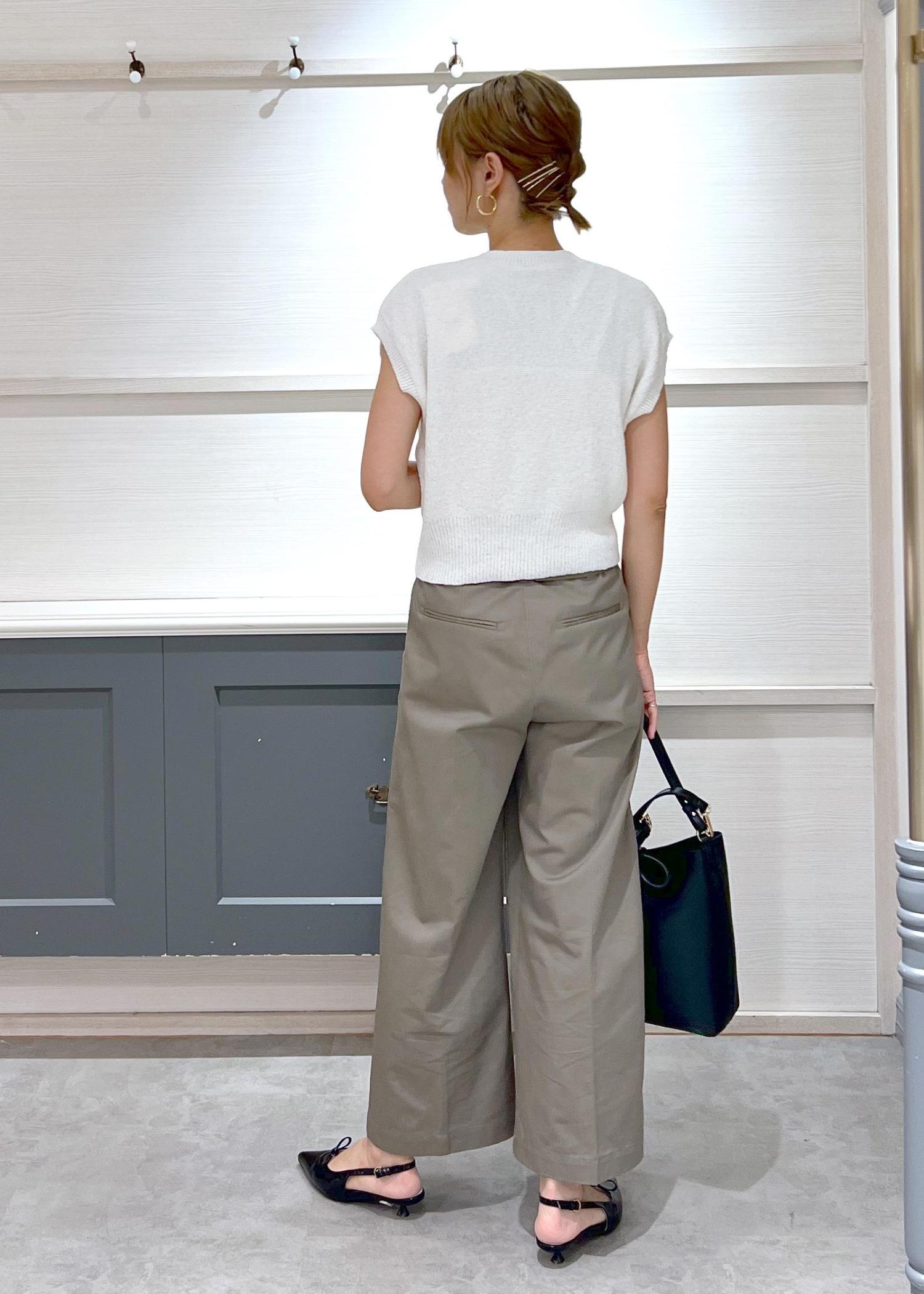 少し短め丈のトップスでウエストまわりがすっきり見え、ワイドパンツとのバランスも抜群◎