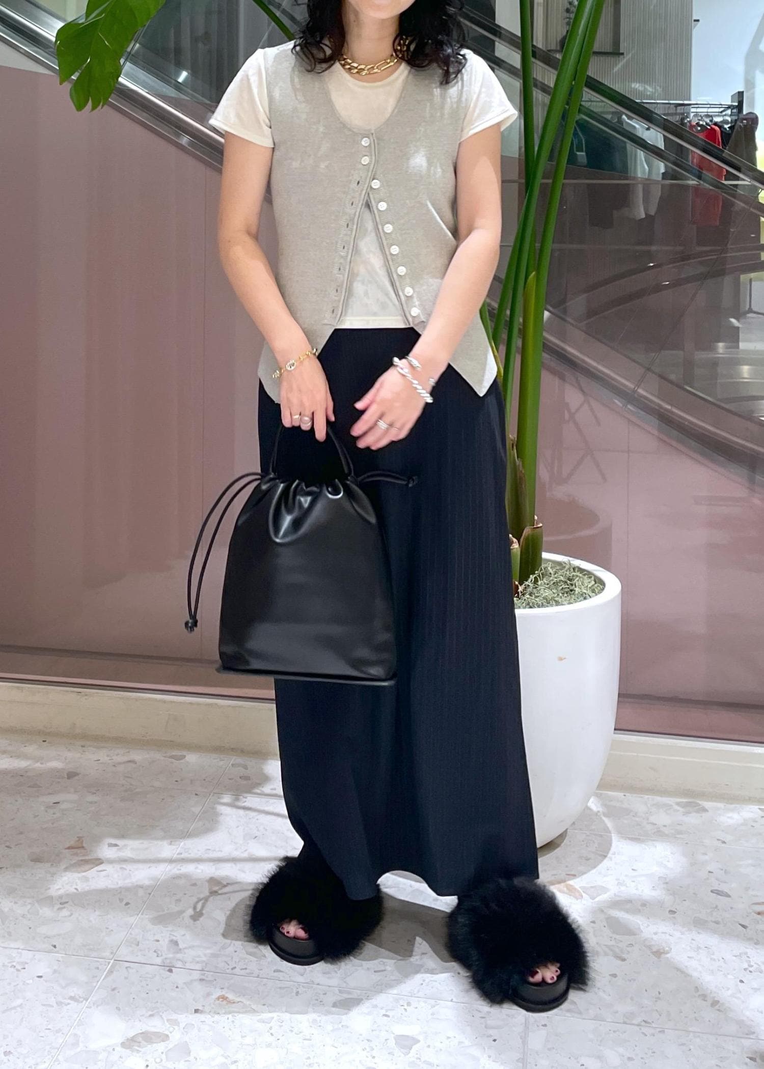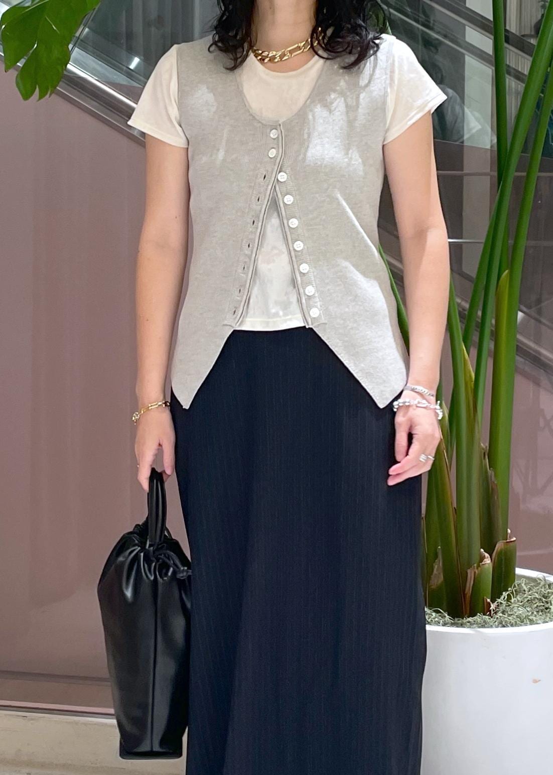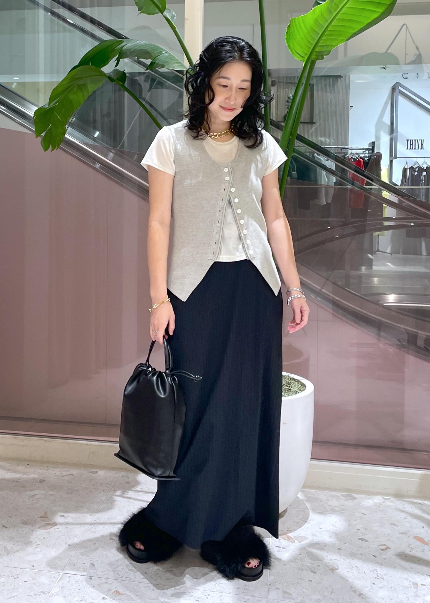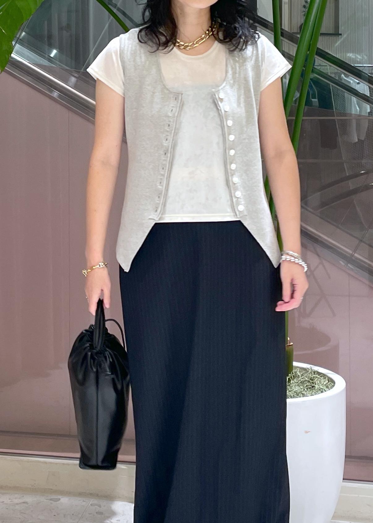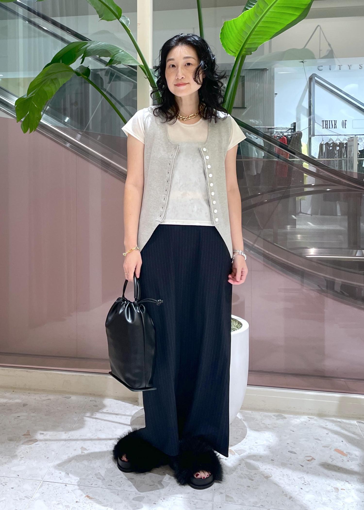 まだ暑い時期にはノースリーブやTシャツで、秋にはセットアップやニット合わせなど、長く楽しめそうです。 -